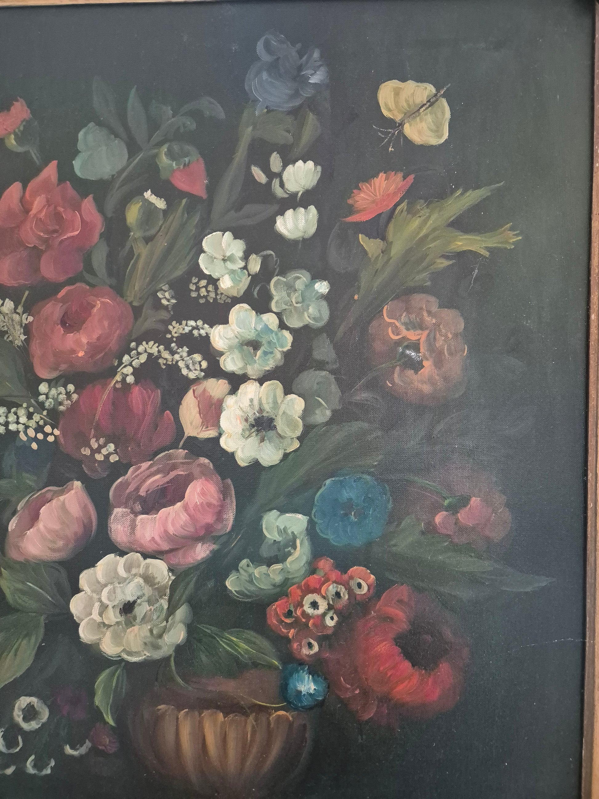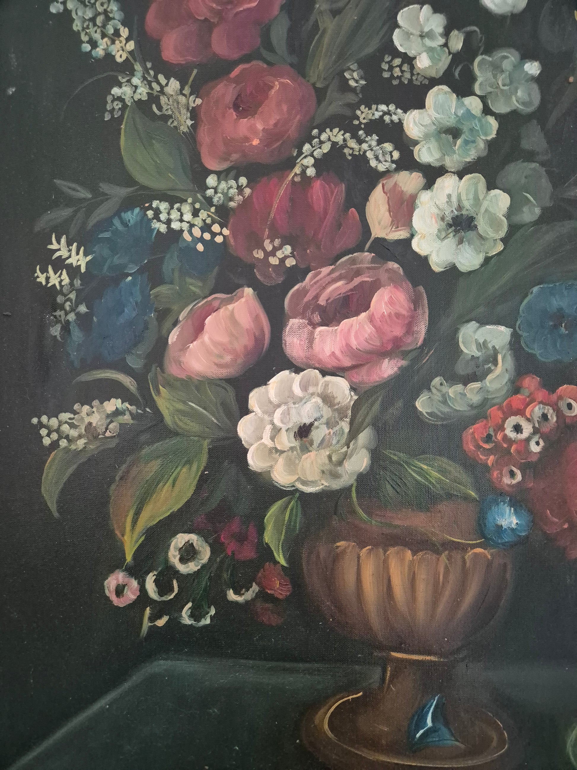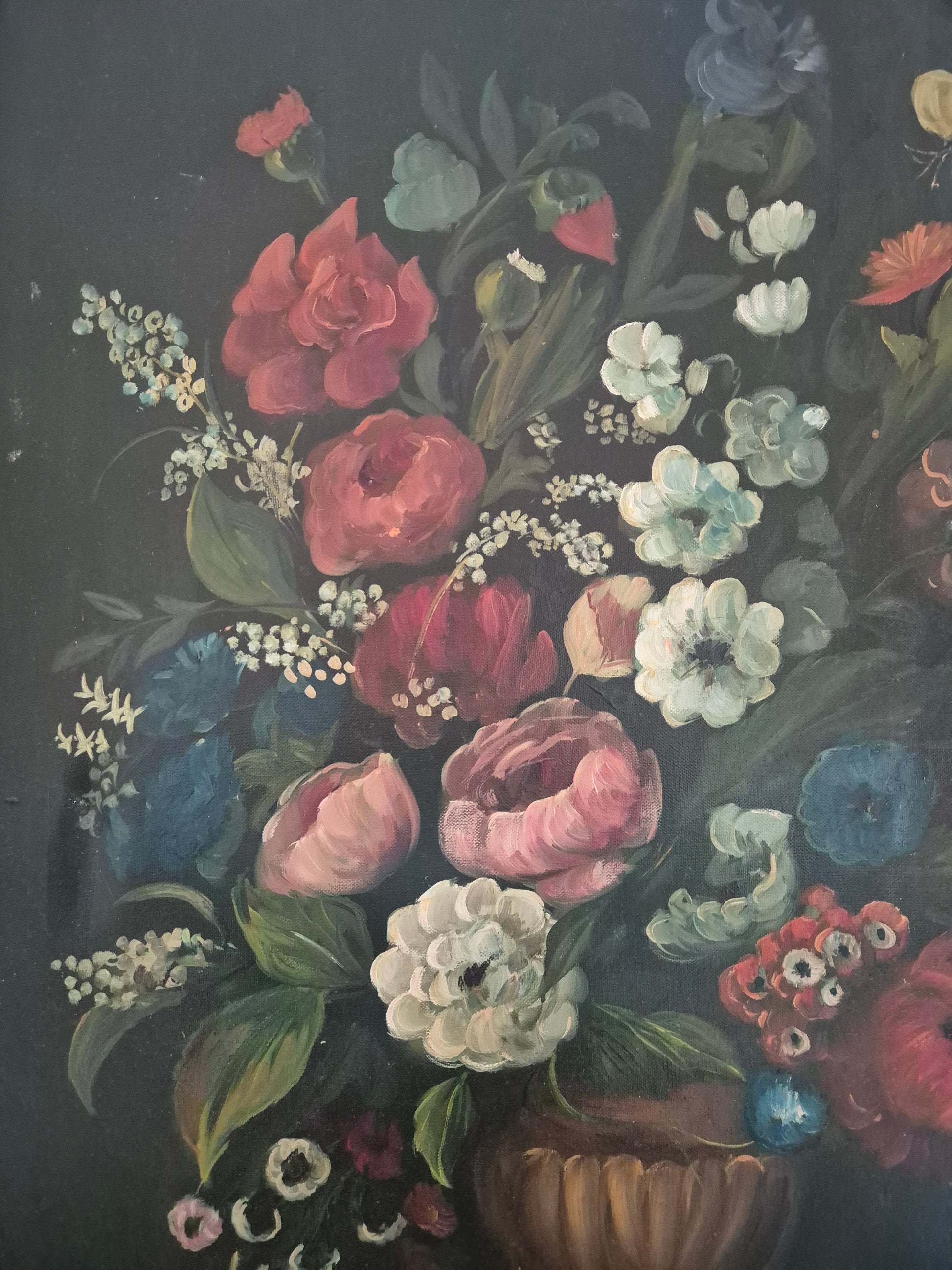 Herzlich willkommen, angeboten wird ein eindrucksvolles Ölgemälde der Europäischen Schule (XX). Das üppige Blumenstillleben überzeugt durch seine kräftigen Farben und detailreiche Ausarbeitung. Die harmonische Komposition und die meisterhafte Ausführung machen dieses Werk zu einem besonderen Highlight für Kunstliebhaber.