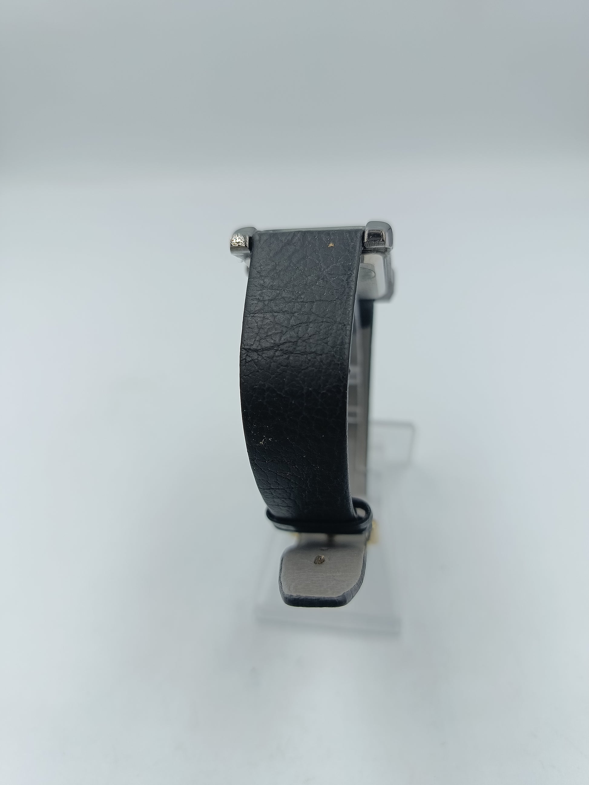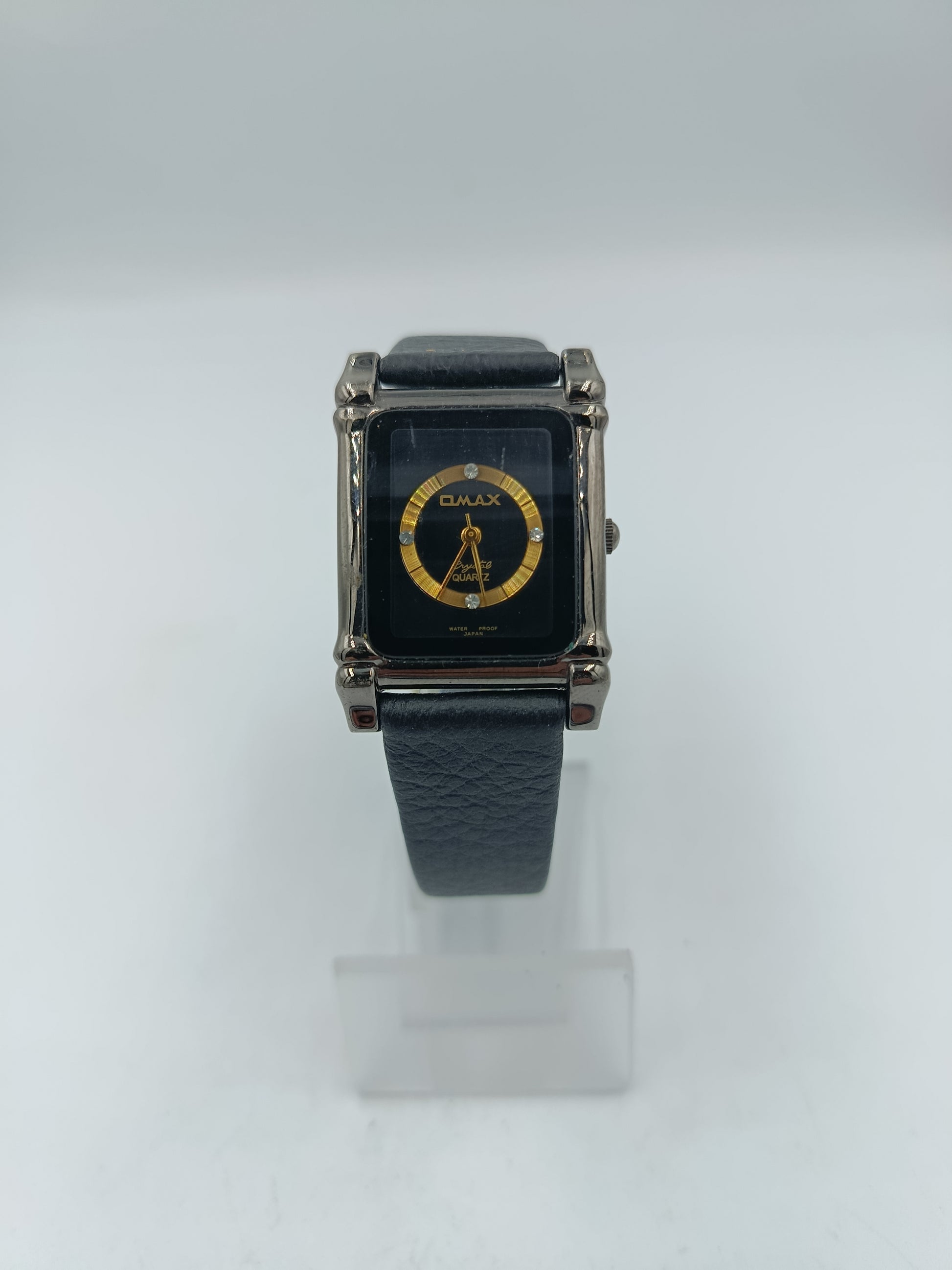 Moderne Omax Quartz Armbanduhr mit markantem, eckigem Gehäuse in Silber-Schwarz und goldfarbenen Akzenten. Das schwarze Zifferblatt mit goldener Einfassung und Steinverzierung verleiht der Uhr einen edlen, zeitlosen Look. Ideal für Liebhaber klassischer Designs mit besonderem Charakter.