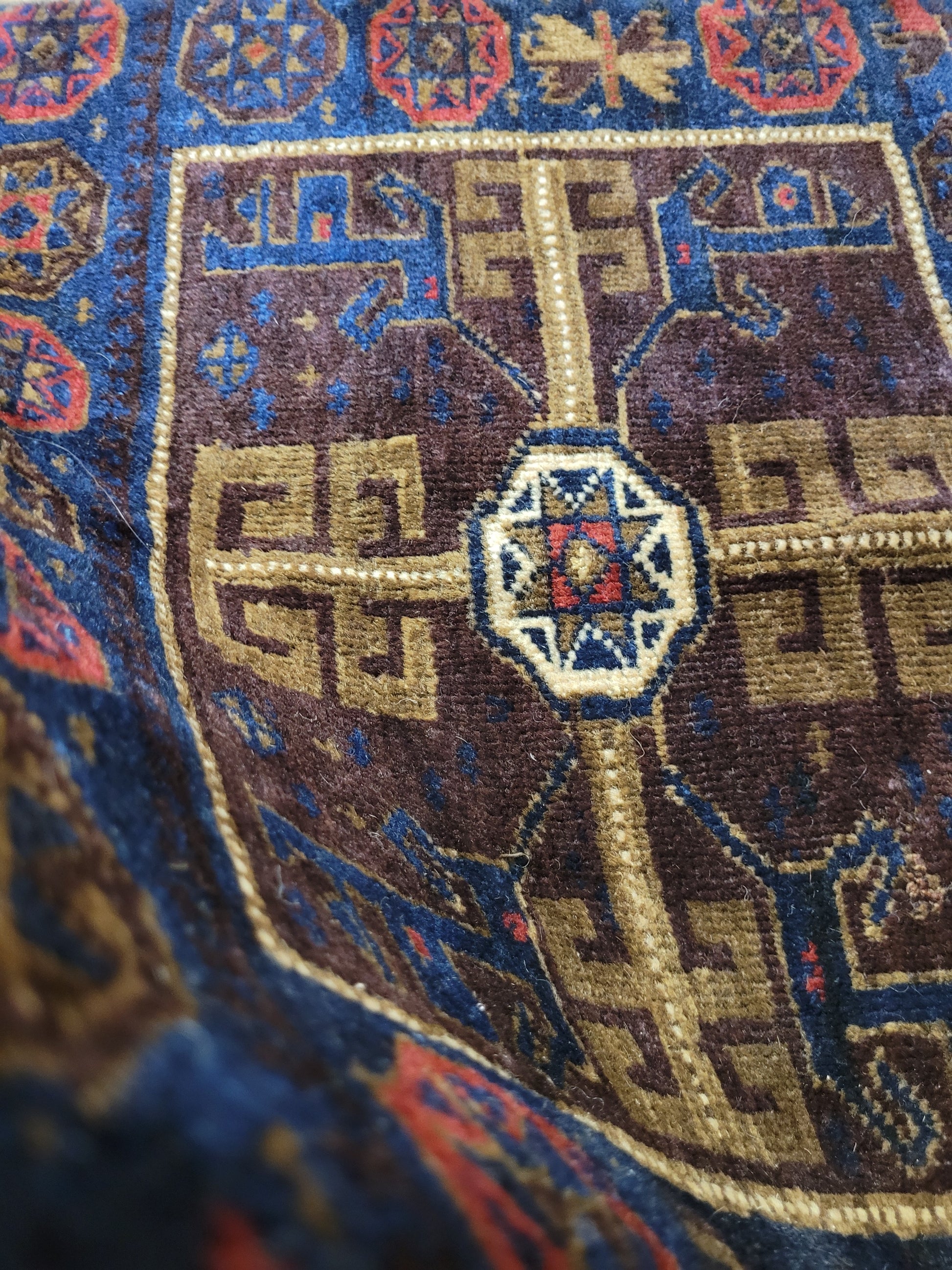 hier präsentieren wir einen handgeknüpften Beludj-Teppich im charakteristischen Stammesstil. Das Stück zeigt ein ausdrucksstarkes Zentralfeld mit vier markanten, graphischen Symbolen, die durch ein sternförmiges Medaillon miteinander verbunden sind. Die tiefen Blau- und Brauntöne werden von roten und goldenen Akzenten begleitet und verleihen dem Teppich eine eindrucksvolle Tiefe. Die umlaufende Bordüre mit achteckigen Ornamenten rundet die Komposition harmonisch ab.