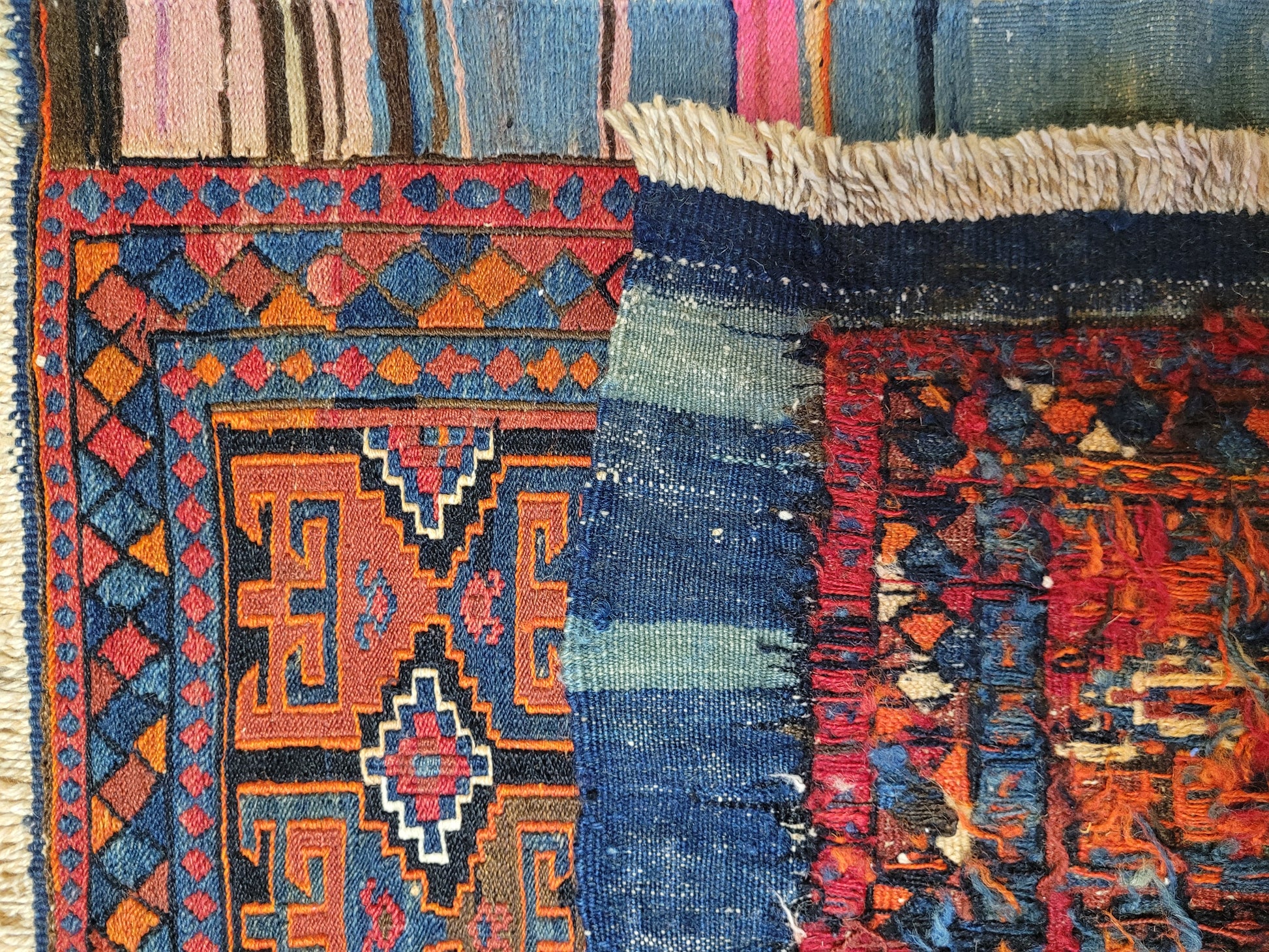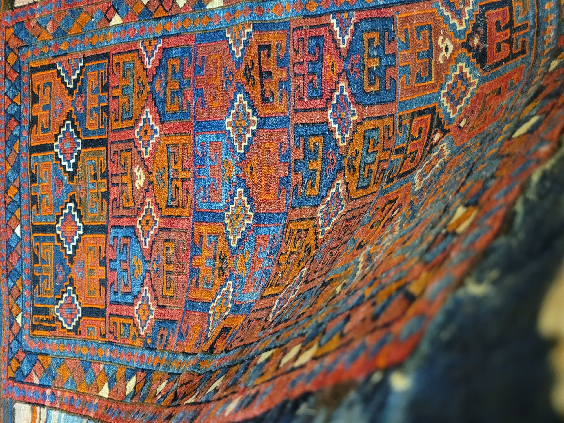 angeboten wird ein charaktervoller Sumak-Kelim mit markanten geometrischen Mustern und lebendiger Farbwirkung. Die traditionelle Flachgewebetechnik verleiht dem Stück eine plastische Struktur, während das wiederkehrende, kraftvoll stilisierte Motivfeld dem Teppich eine ausdrucksstarke Erscheinung gibt.