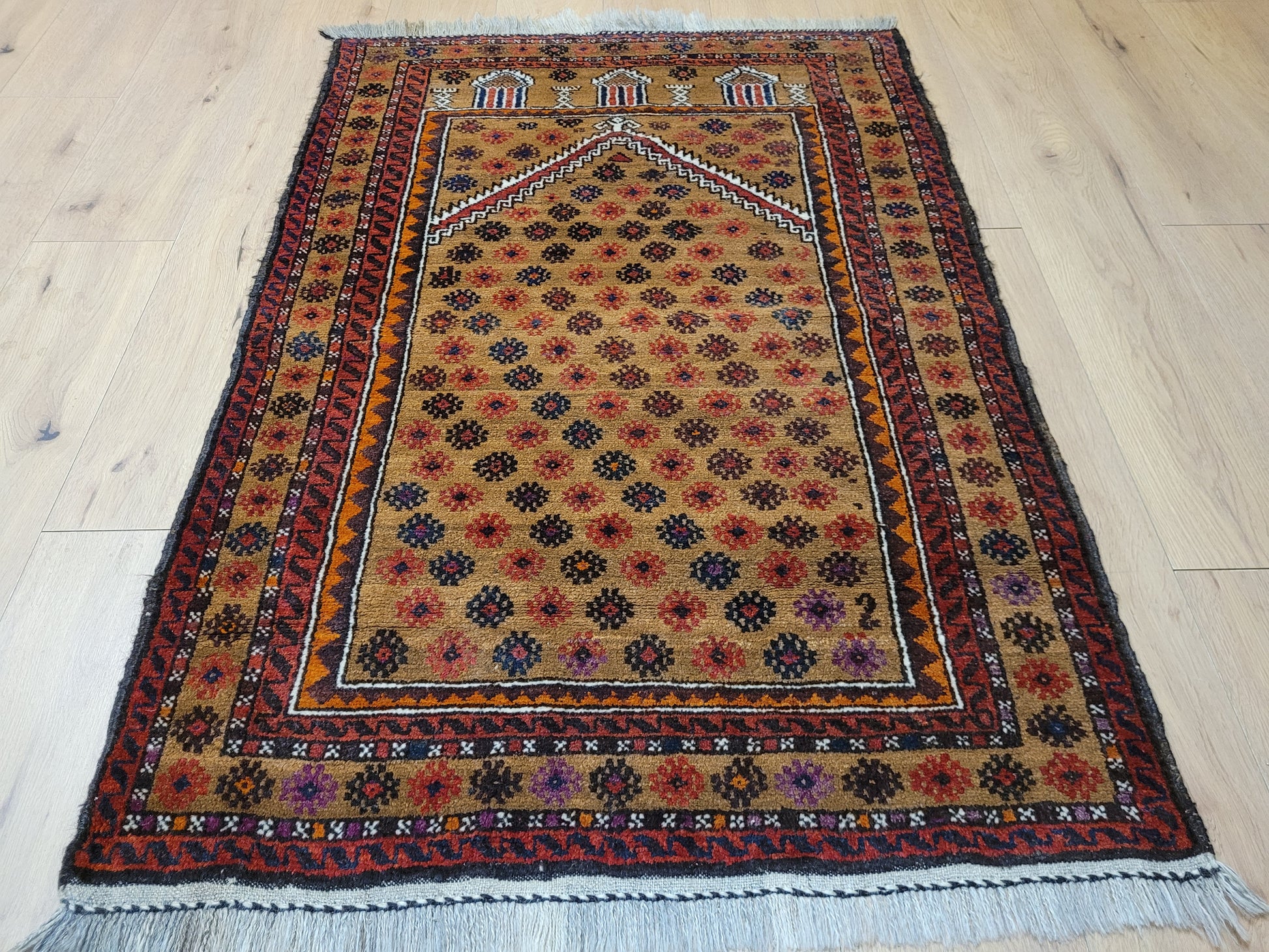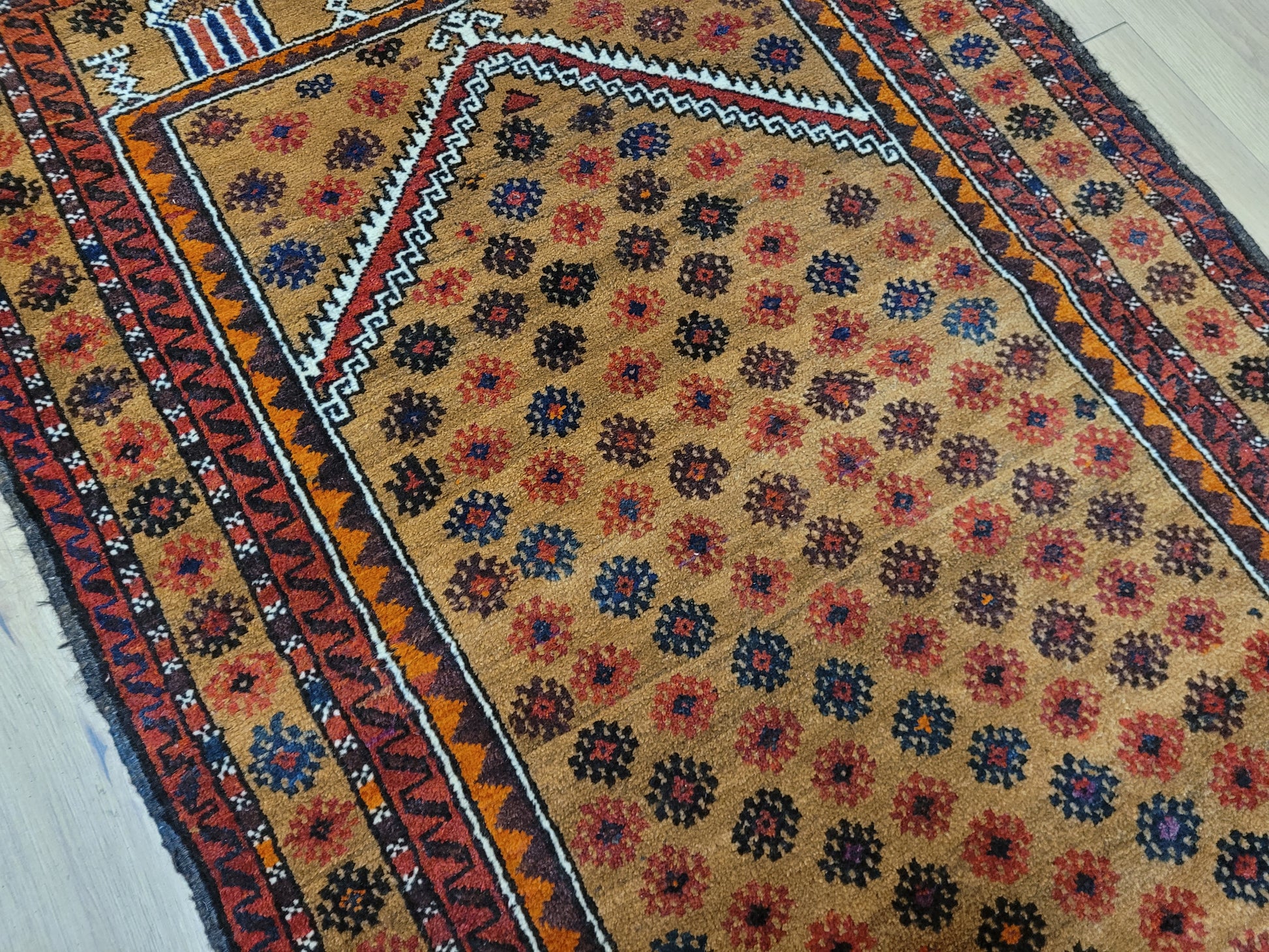 angeboten wird ein traditioneller handgeknüpfter Belutsch Orientteppich mit klassischem Gebetsteppich-Design. Das Stück zeigt die charakteristische Mihrab-Nische mit feinen geometrischen Linien und floral angehauchten Motiven. Seine warme, erdige Farbpalette verleiht ihm eine angenehme Ausstrahlung und macht ihn zu einem vielseitigen Schmuckstück für Wohn- und Sammlungszwecke.