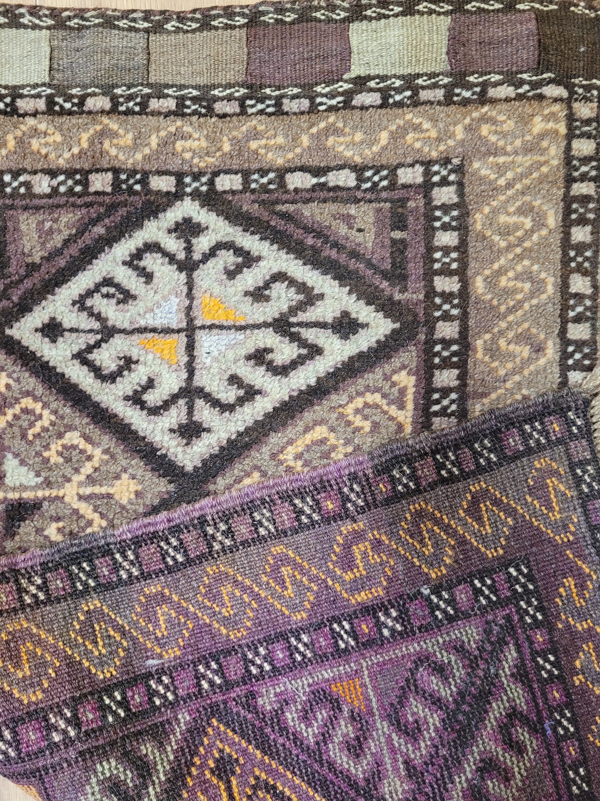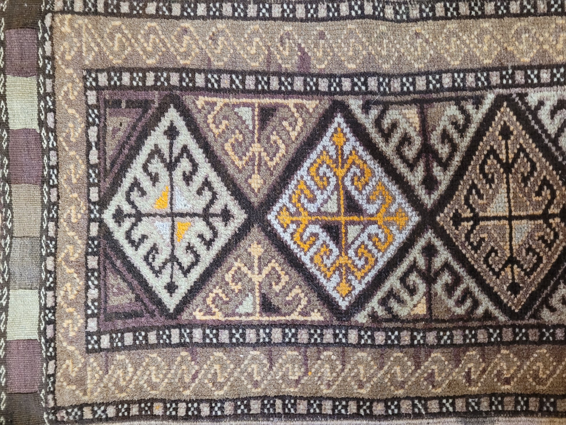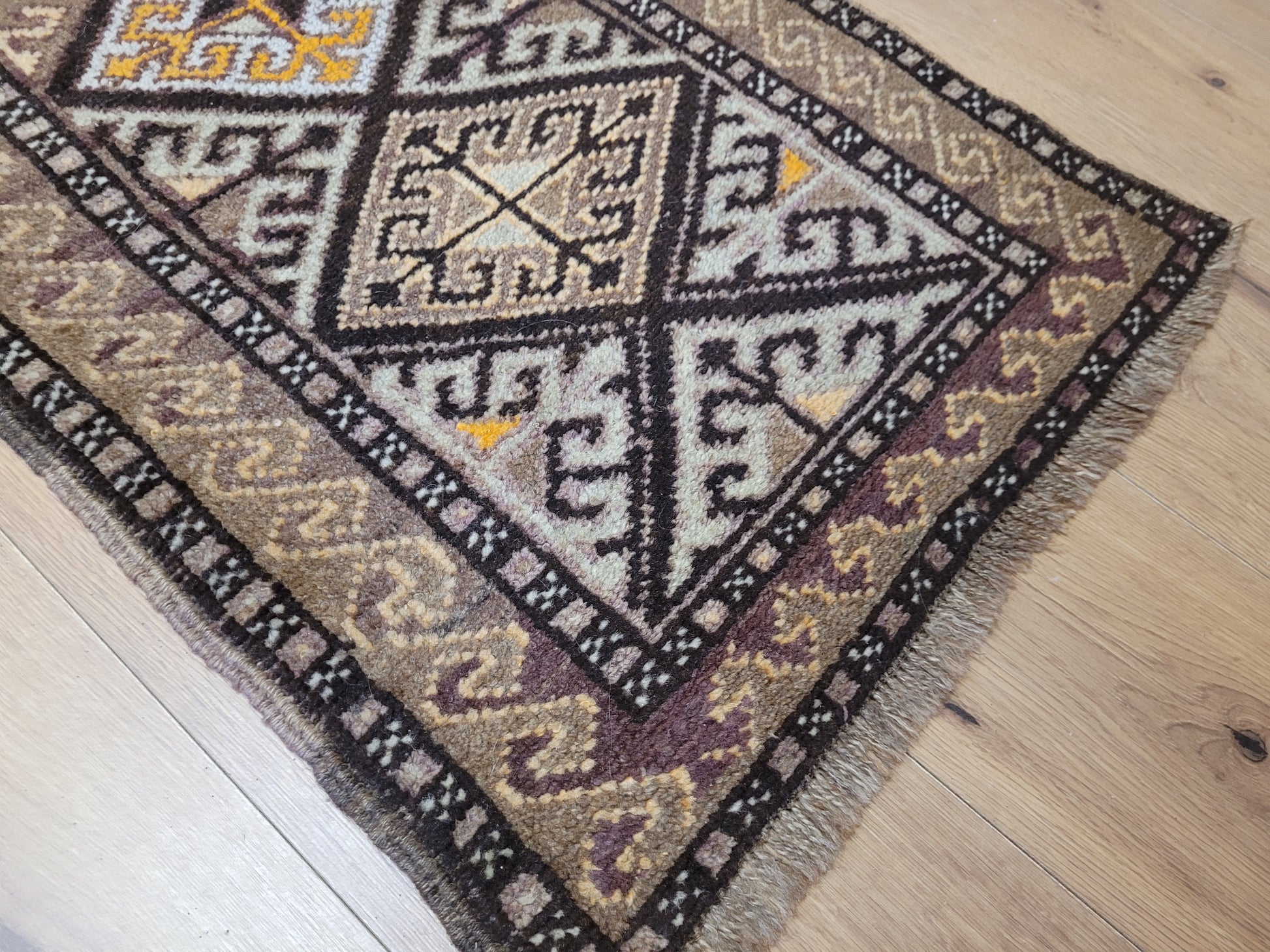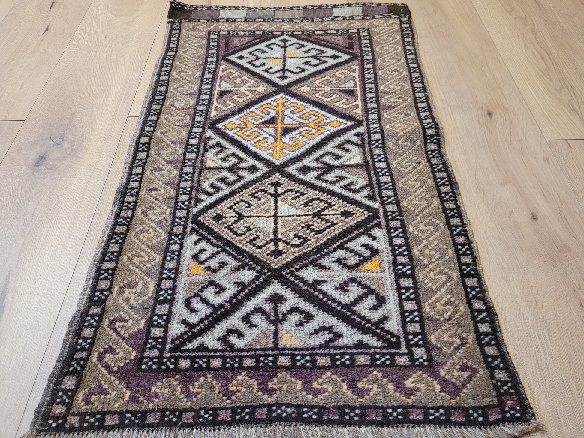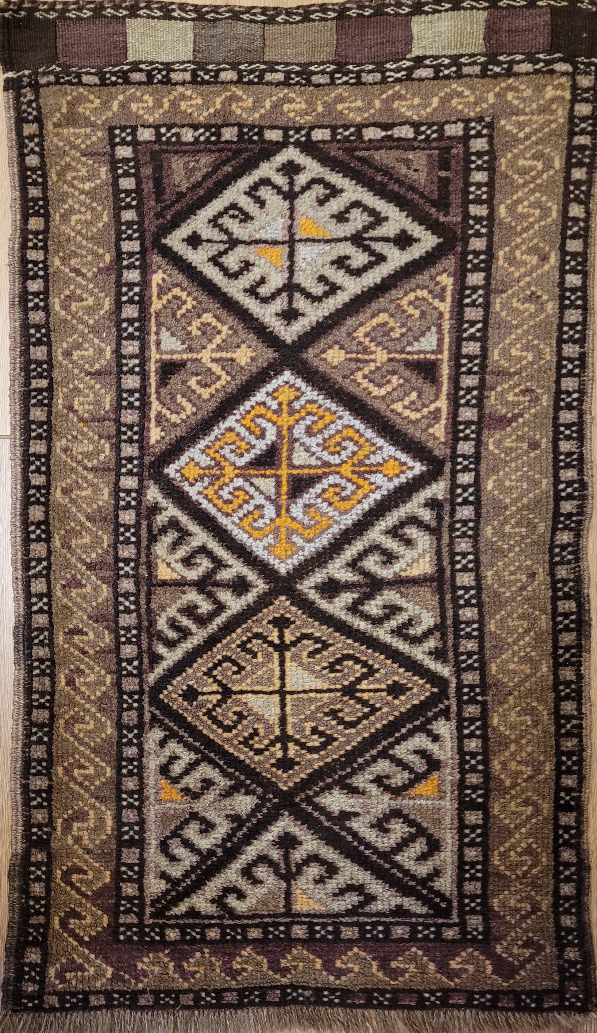 angeboten wird ein handgeknüpfter Belutsch Orientteppich aus reiner Schurwolle. Dieses charaktervolle Stück zeigt ein traditionelles geometrisches Design mit drei aufeinanderfolgenden Rautenmedaillons, die von feinen Bordüren mit Haken- und Wellenmustern umrahmt werden. Die harmonische Farbgebung in warmen Brauntönen, Ocker, Beige und feinem Violett verleiht dem Teppich eine besonders erdige, ruhige Ausstrahlung.