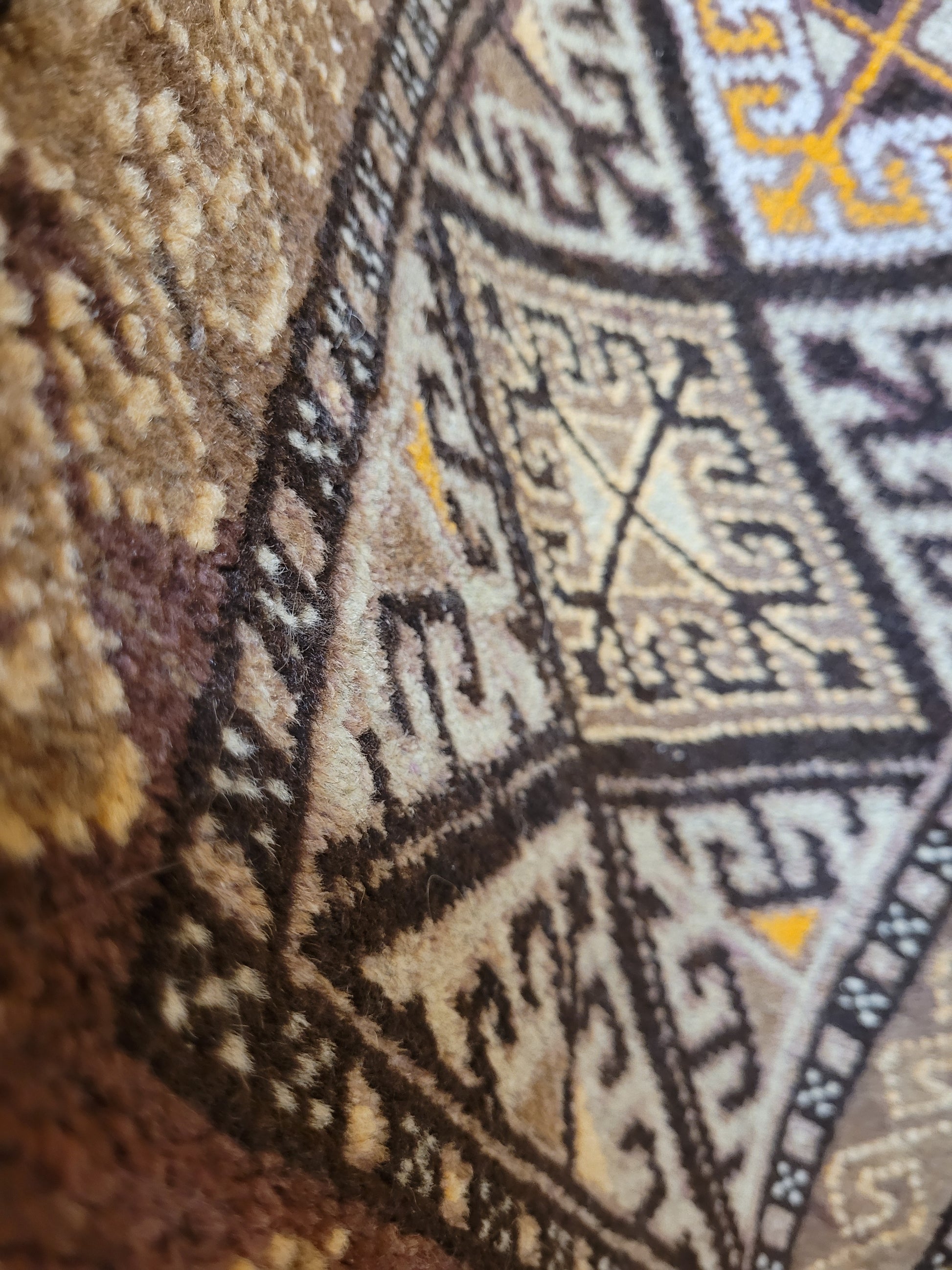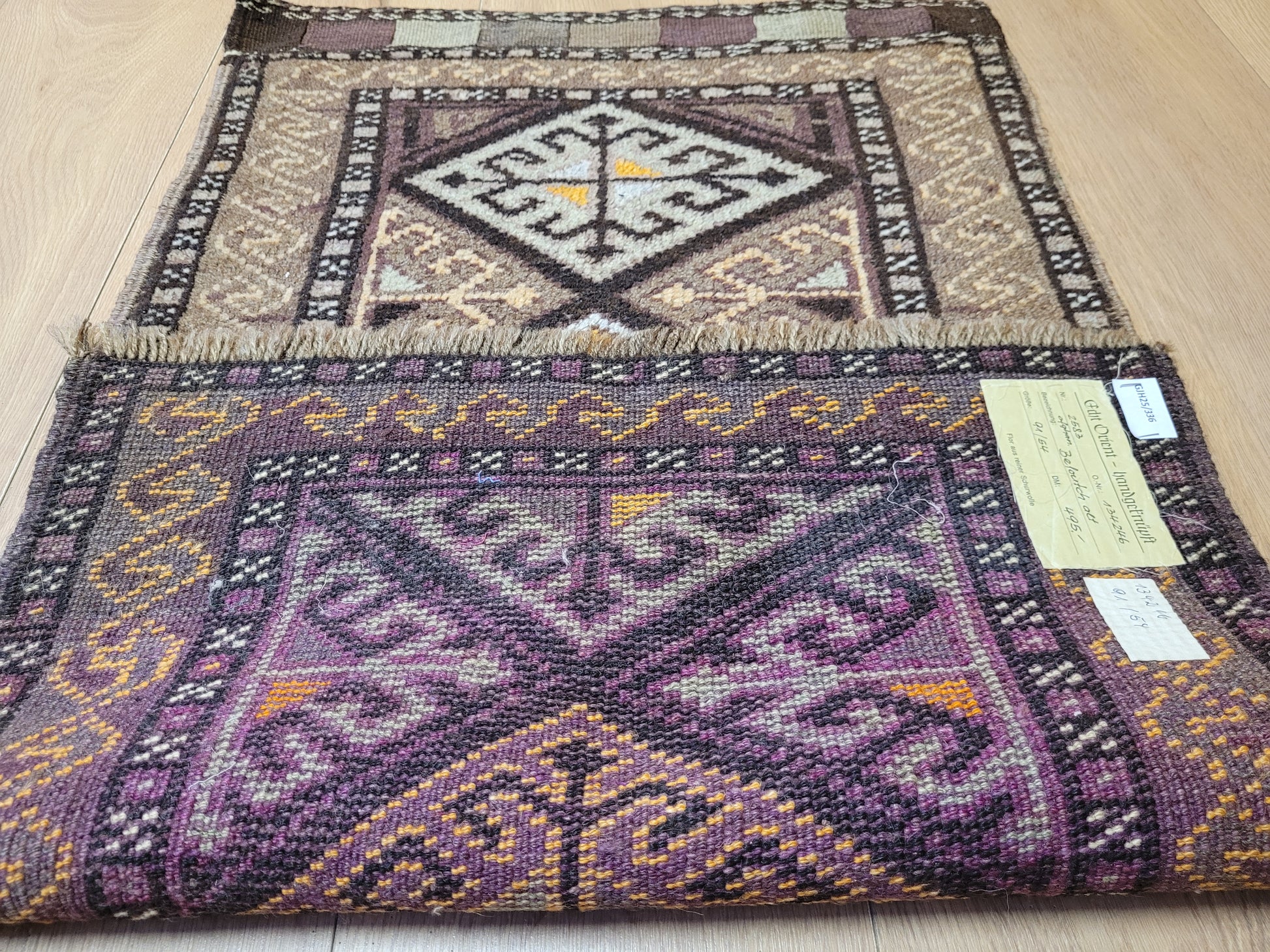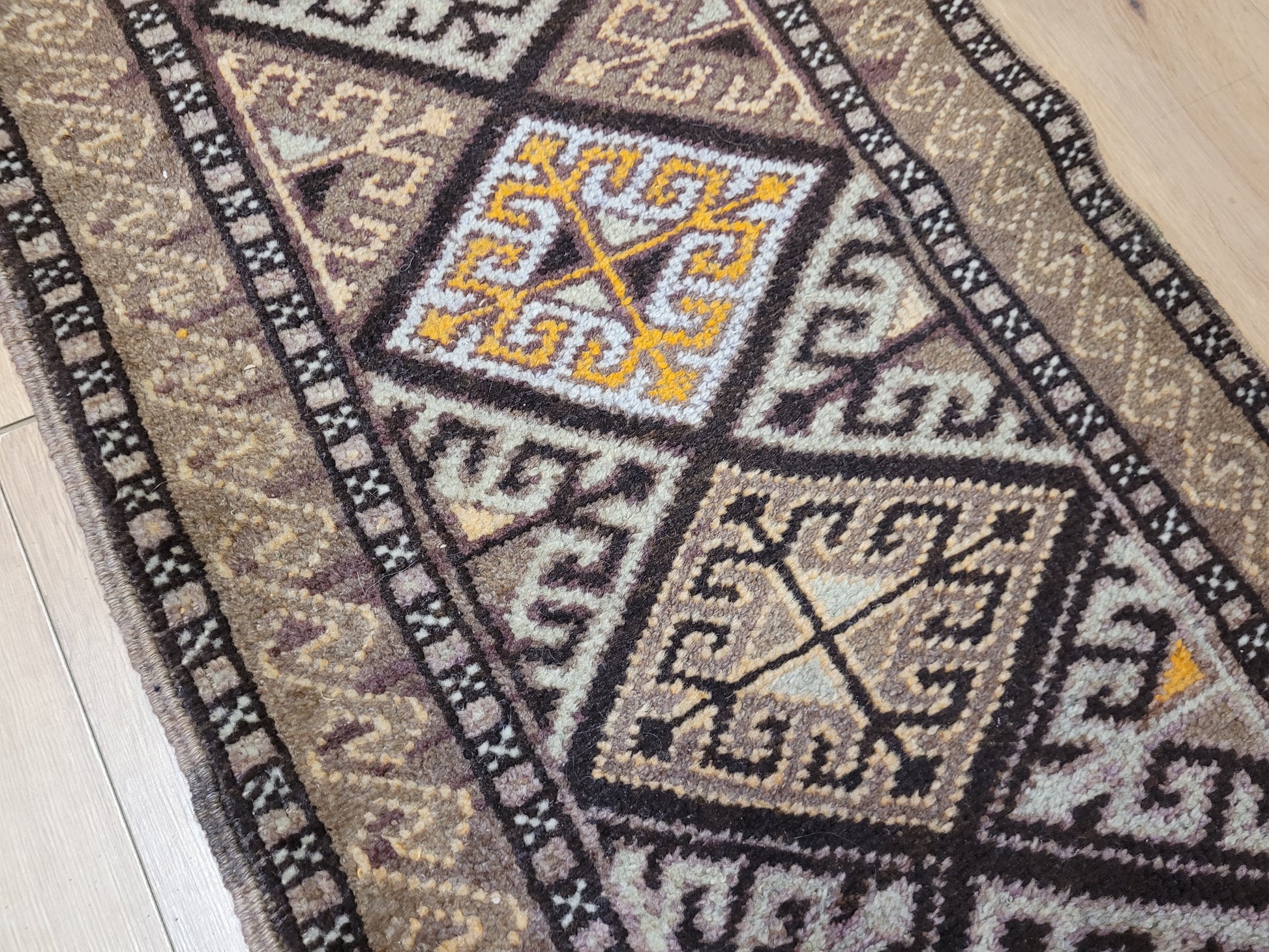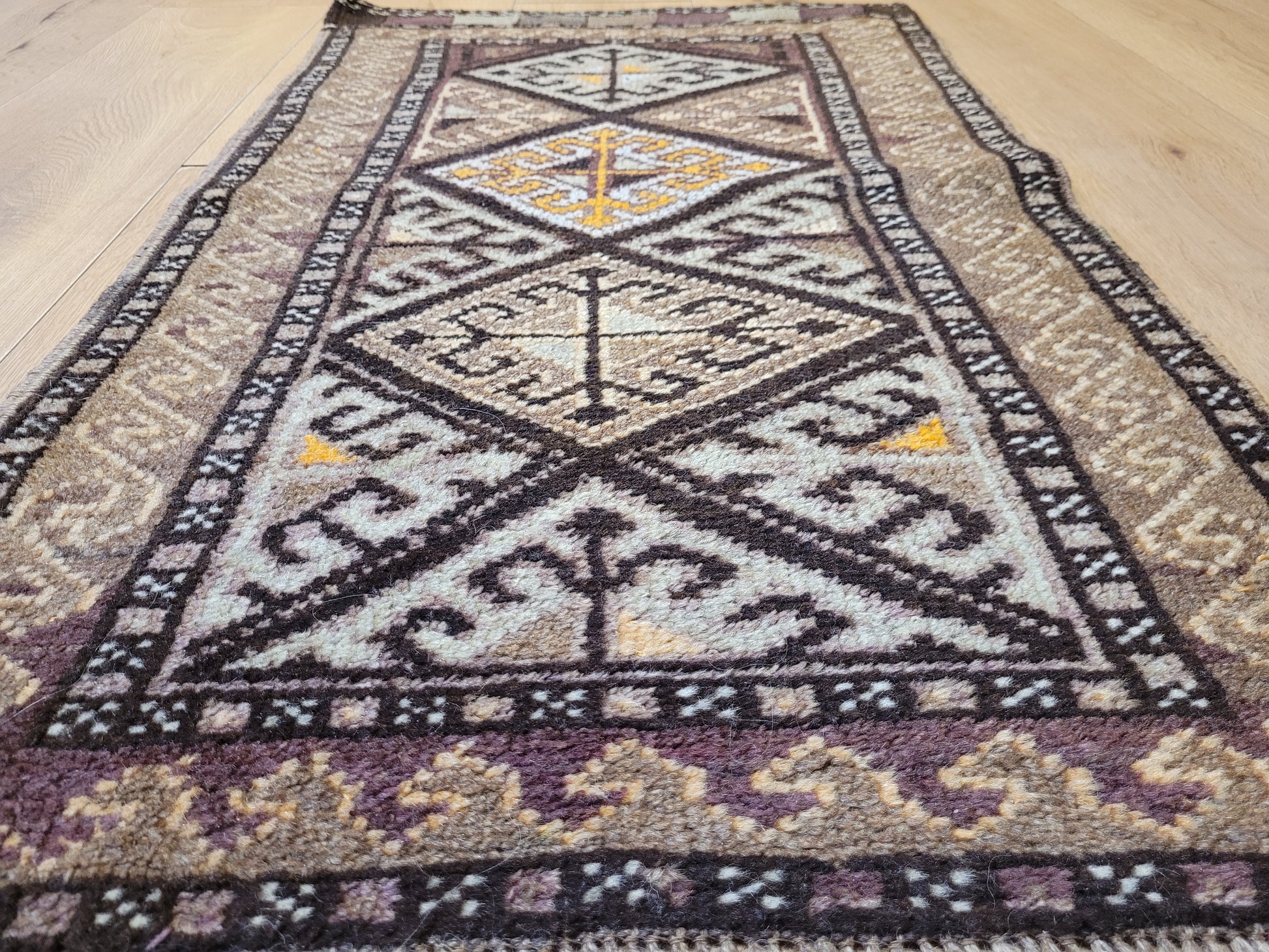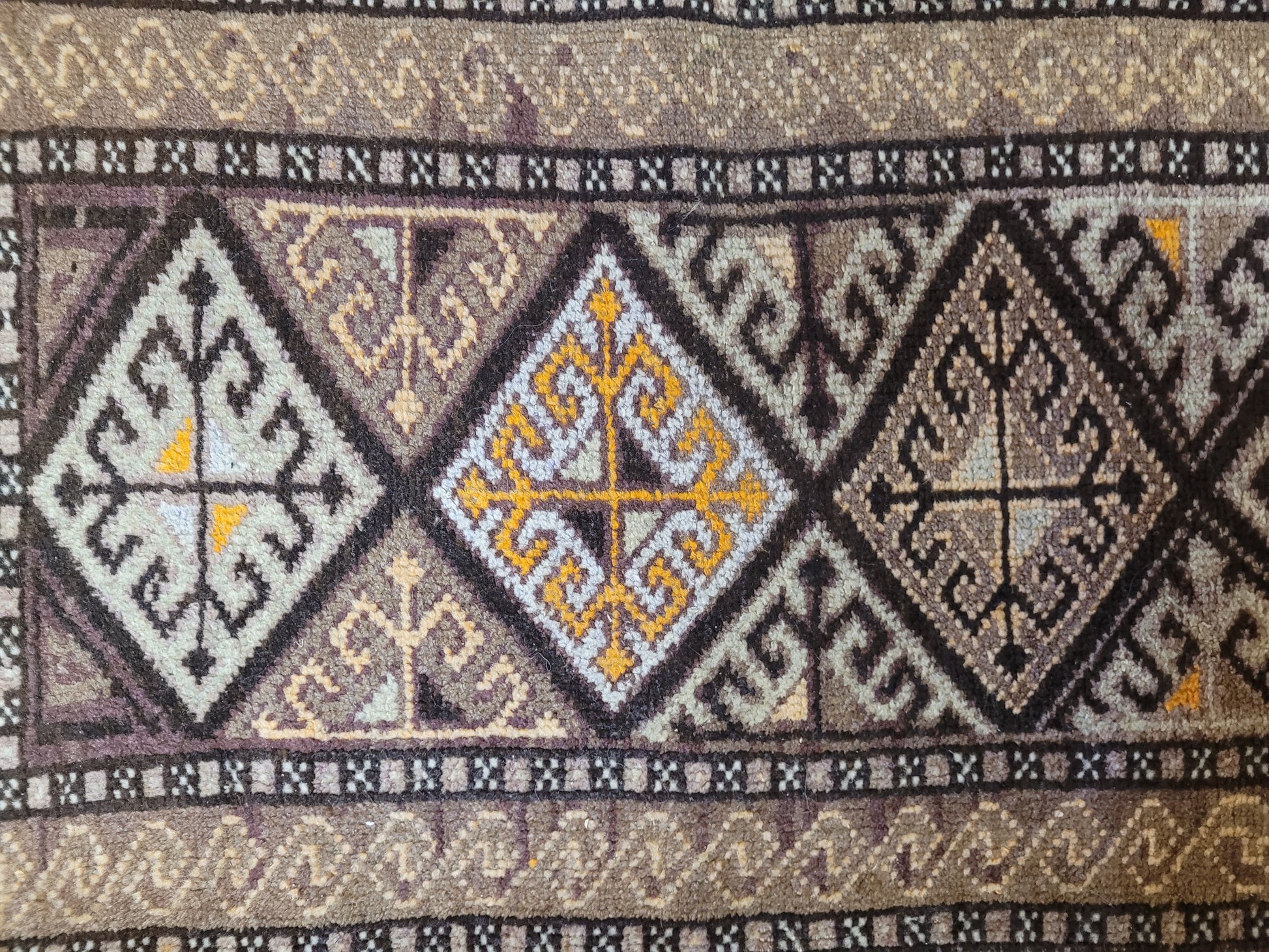 angeboten wird ein handgeknüpfter Belutsch Orientteppich aus reiner Schurwolle. Dieses charaktervolle Stück zeigt ein traditionelles geometrisches Design mit drei aufeinanderfolgenden Rautenmedaillons, die von feinen Bordüren mit Haken- und Wellenmustern umrahmt werden. Die harmonische Farbgebung in warmen Brauntönen, Ocker, Beige und feinem Violett verleiht dem Teppich eine besonders erdige, ruhige Ausstrahlung.
