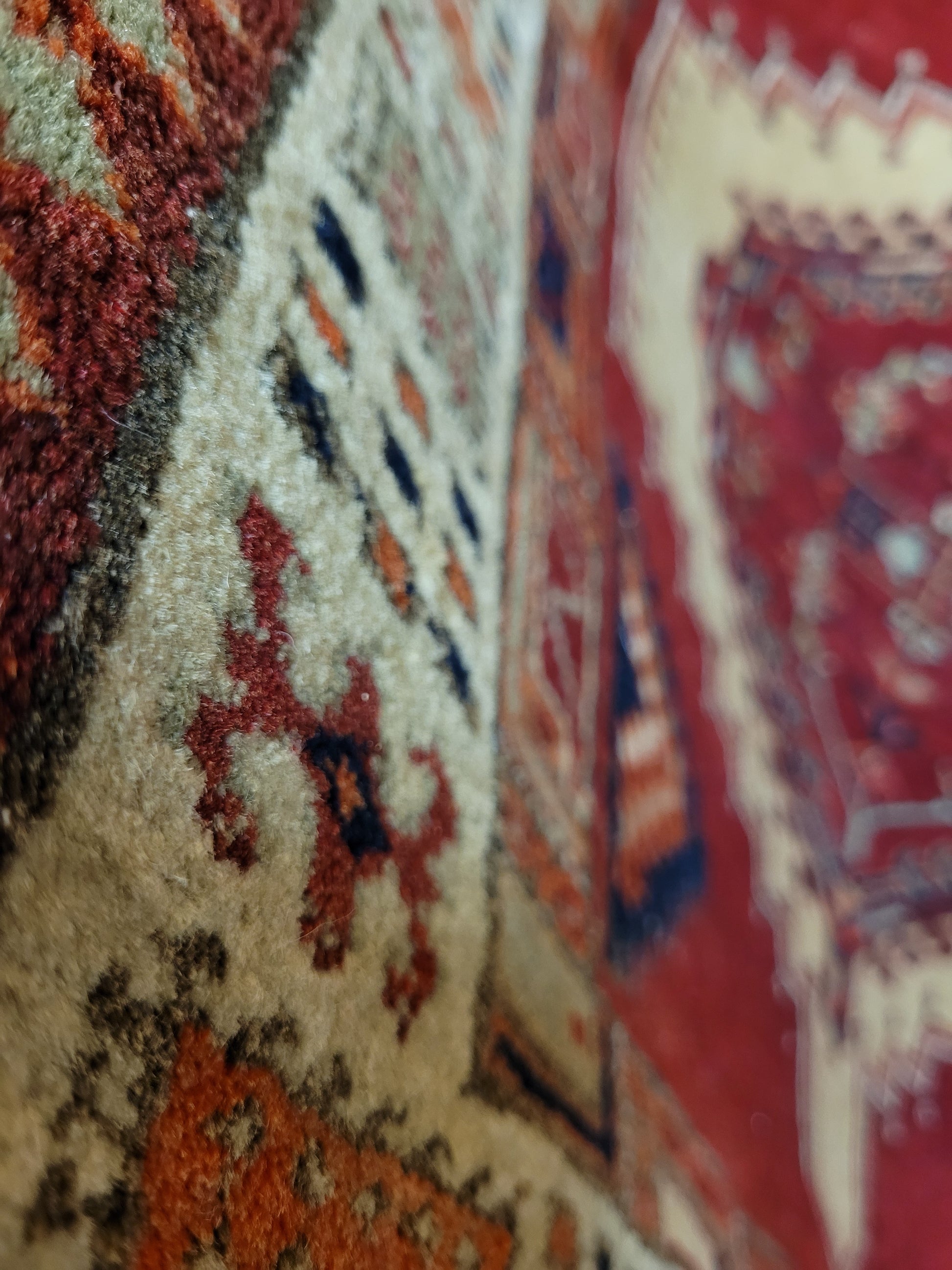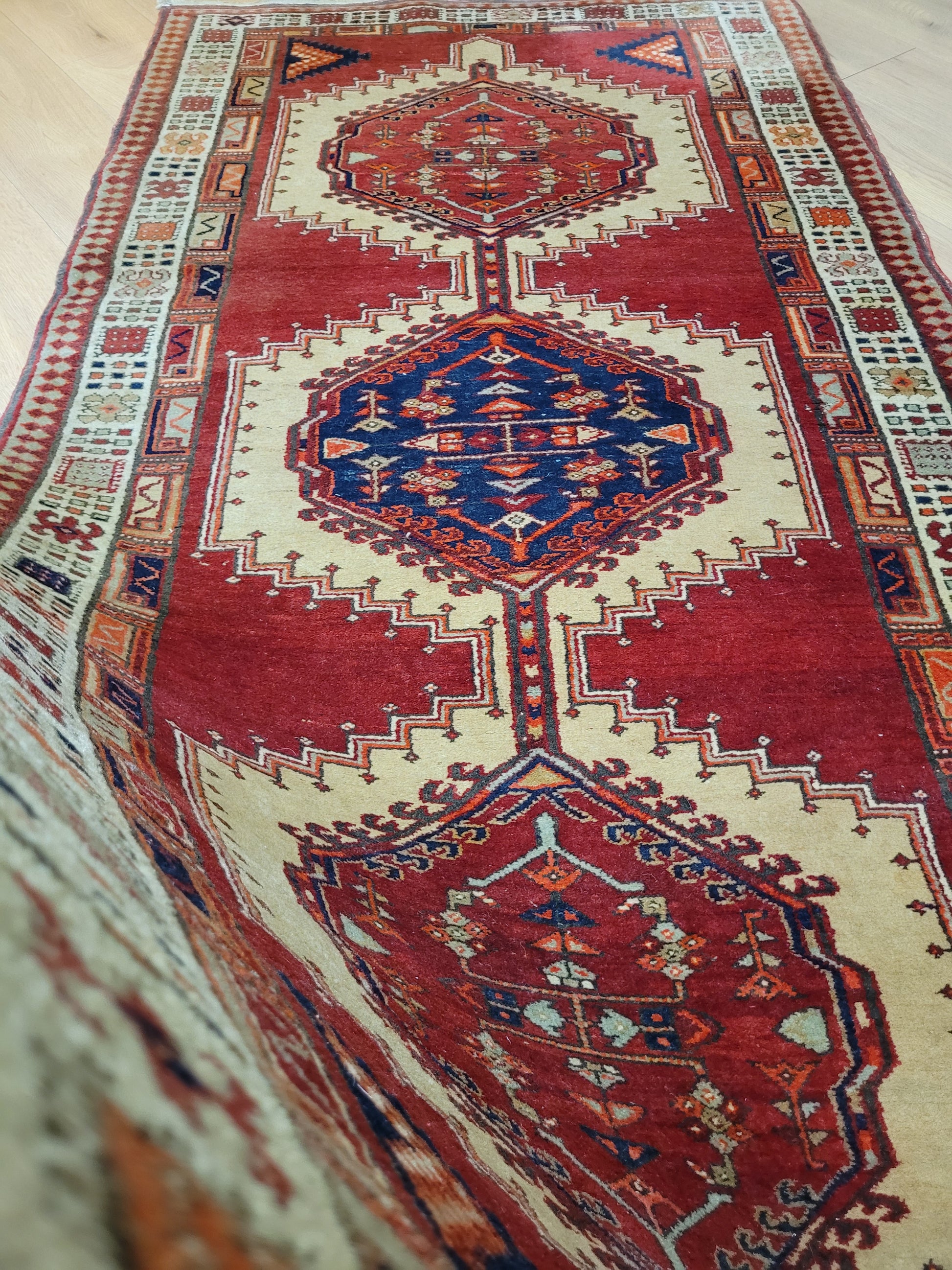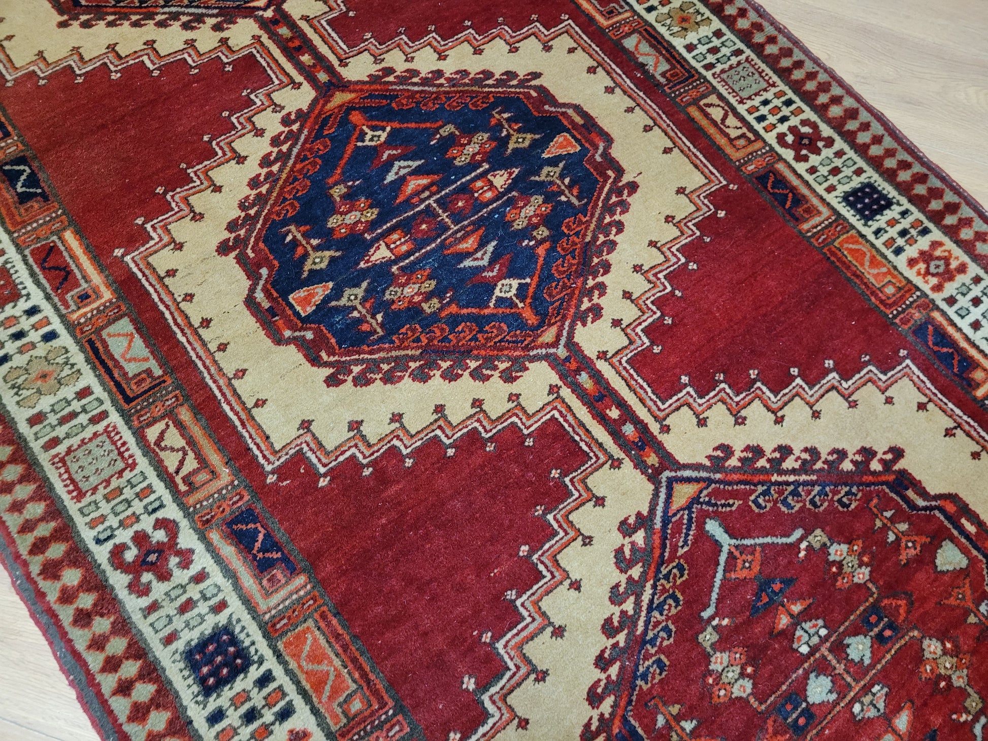 Ausdrucksstarker, handgeknüpfter Sgrab-Teppich mit drei großen, markant ausgearbeiteten Zentralmedaillons. Die klar strukturierten Formen, kombiniert mit detailreichen Nebenmotiven, verleihen dem Teppich eine eindrucksvolle grafische Wirkung. Die helle, reich gemusterte Hauptbordüre bildet einen harmonischen Kontrast zum kräftigen Rot des Innenfeldes und rahmt das Gesamtbild eindrucksvoll ein.