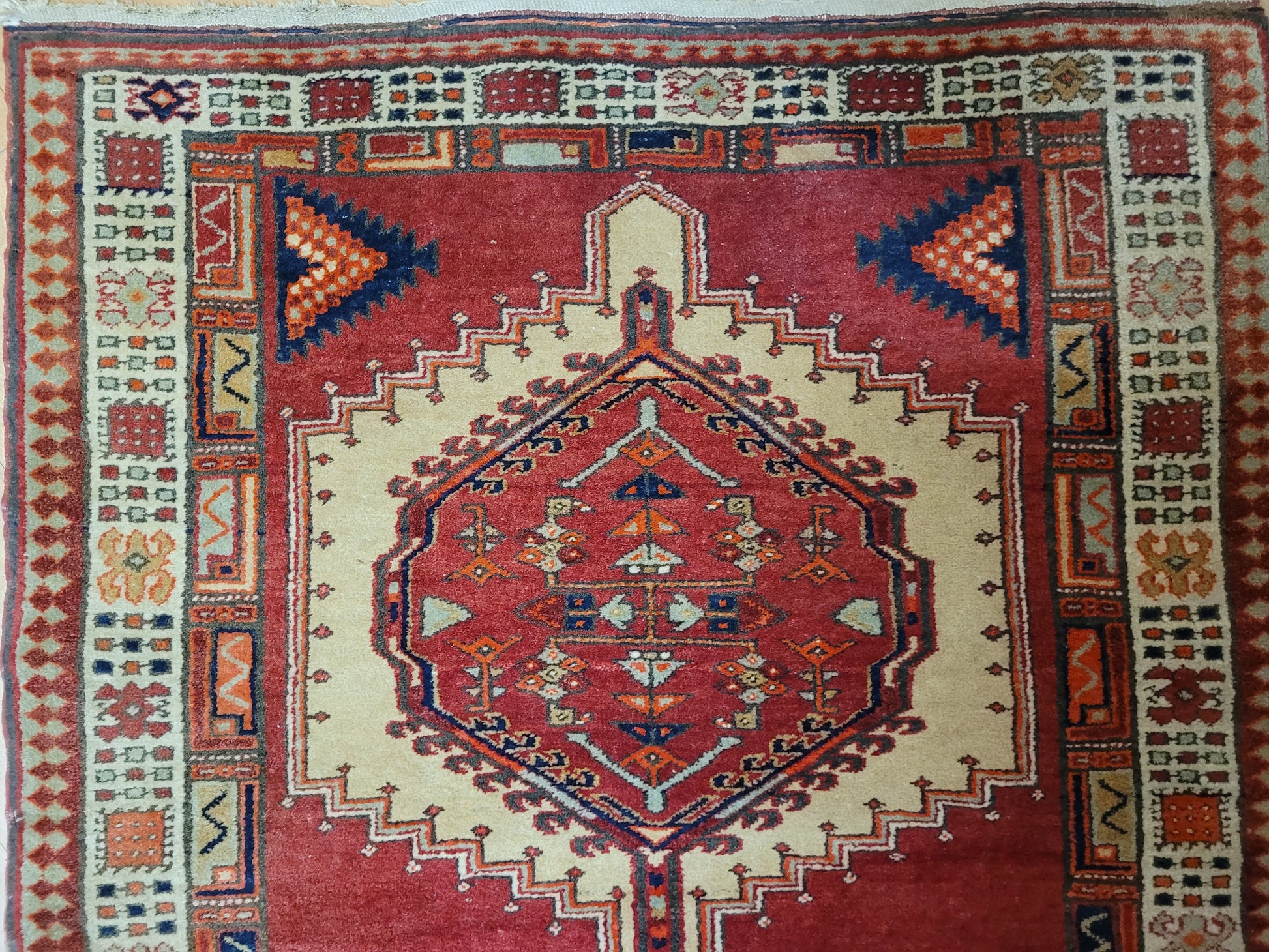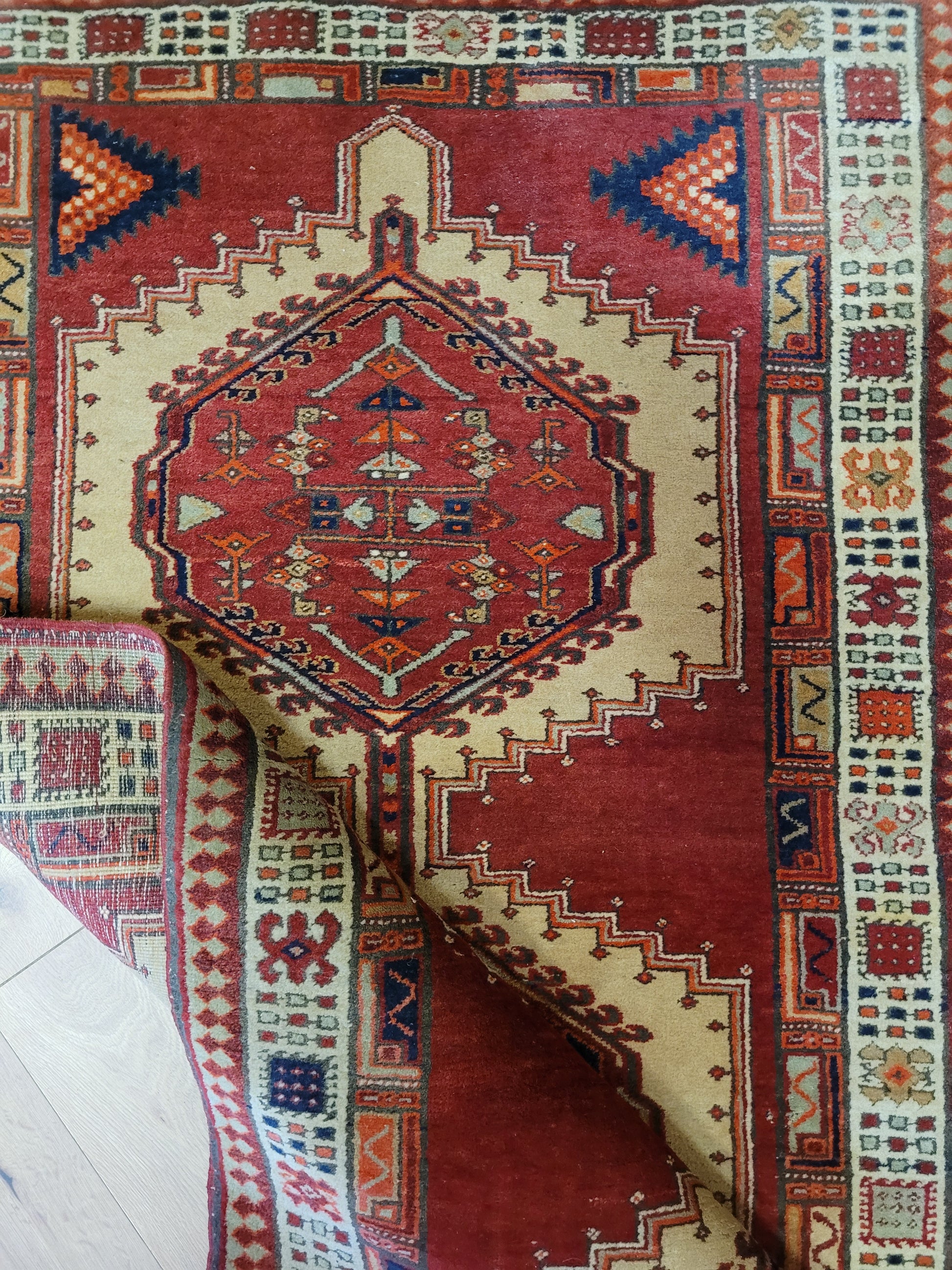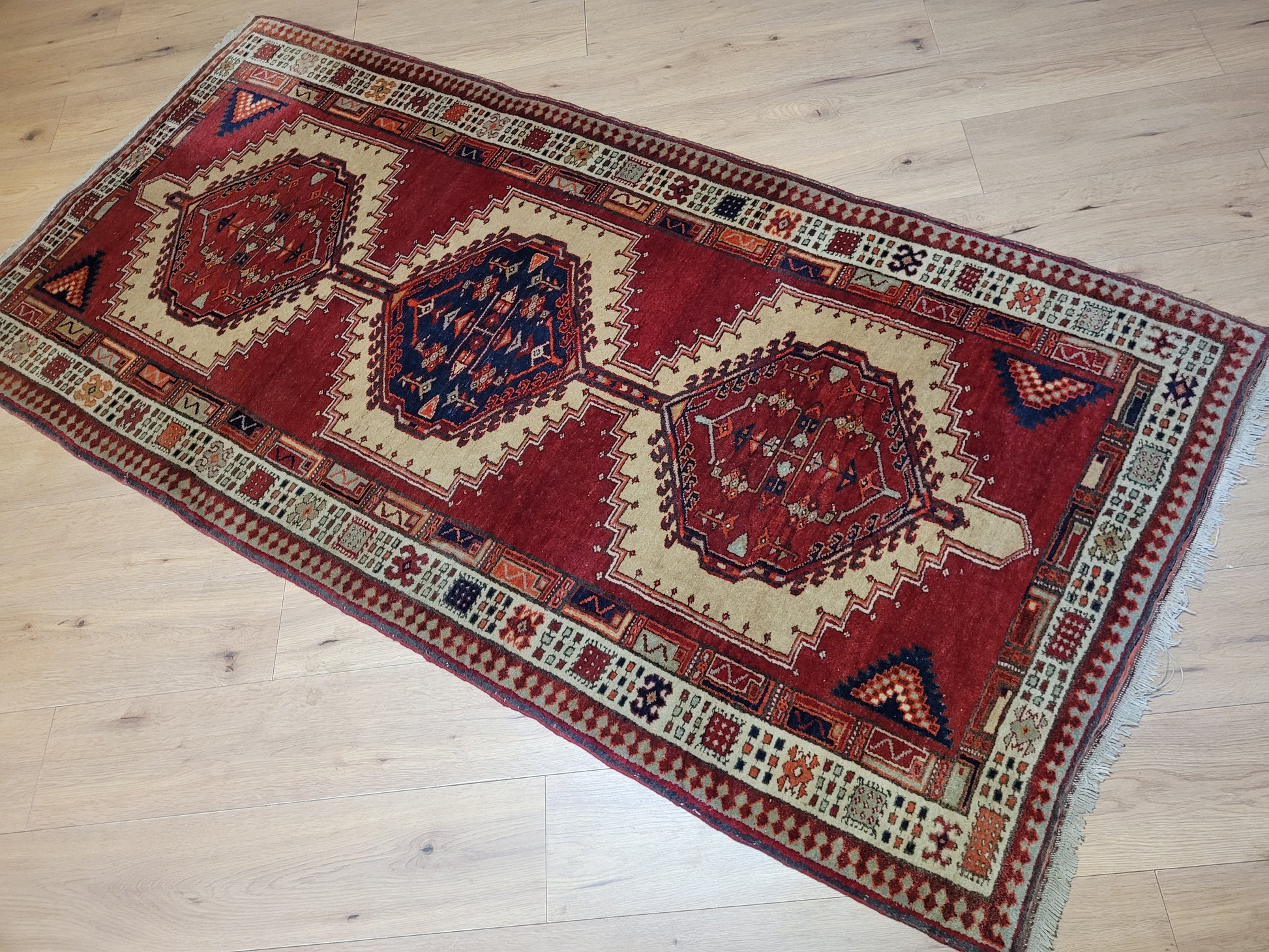Ausdrucksstarker, handgeknüpfter Sgrab-Teppich mit drei großen, markant ausgearbeiteten Zentralmedaillons. Die klar strukturierten Formen, kombiniert mit detailreichen Nebenmotiven, verleihen dem Teppich eine eindrucksvolle grafische Wirkung. Die helle, reich gemusterte Hauptbordüre bildet einen harmonischen Kontrast zum kräftigen Rot des Innenfeldes und rahmt das Gesamtbild eindrucksvoll ein.