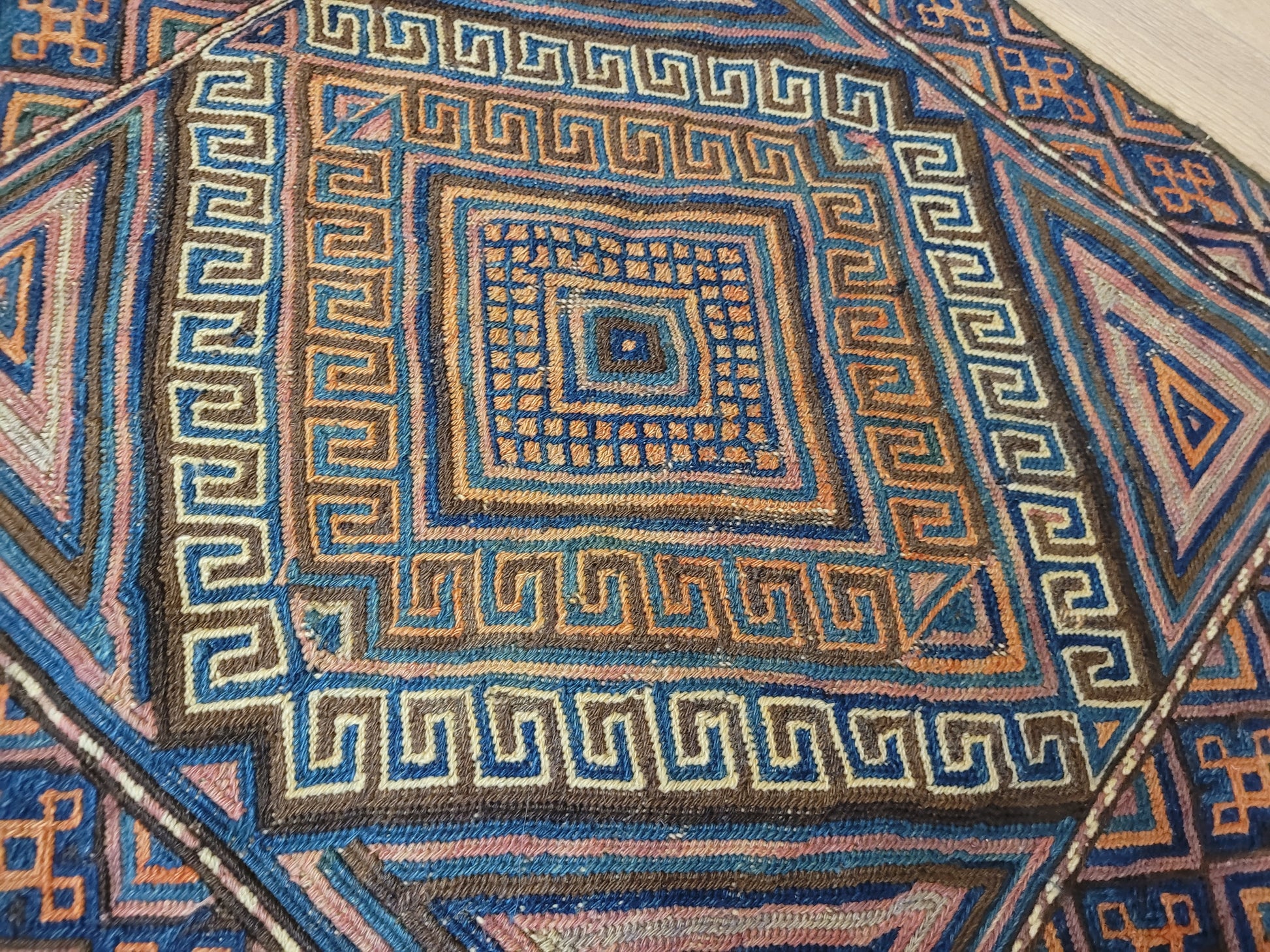 • Design: Großes Rautenzentrum mit umlaufendem Mäander-Motiv und filigranen geometrischen Mustern in der Bordüre