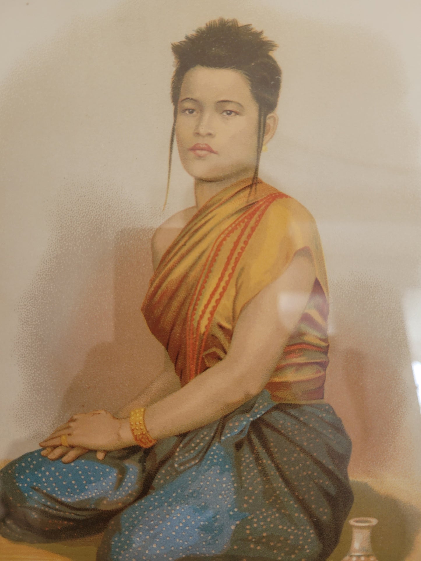 Die Grafik fängt durch ihre detaillierte Ausführung und die subtile Verwendung von Linien und Schattierungen die traditionelle Kleidung und die Ausstrahlung der jungen Frau authentisch ein. Das Bild strahlt eine ruhige und elegante Atmosphäre aus, die den Betrachter in die faszinierende Welt Kambodschas eintauchen lässt.