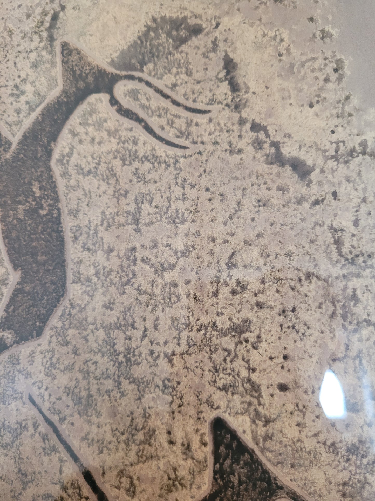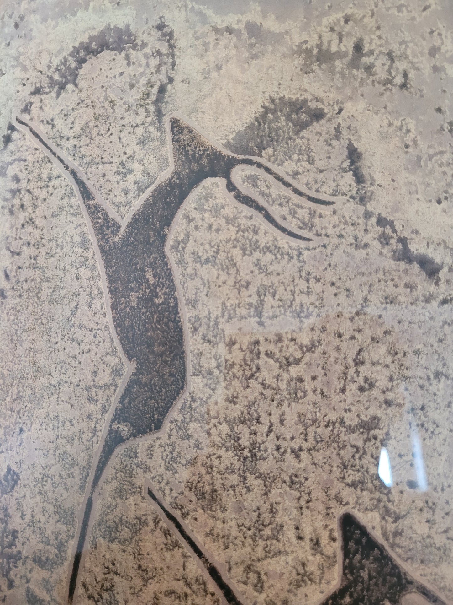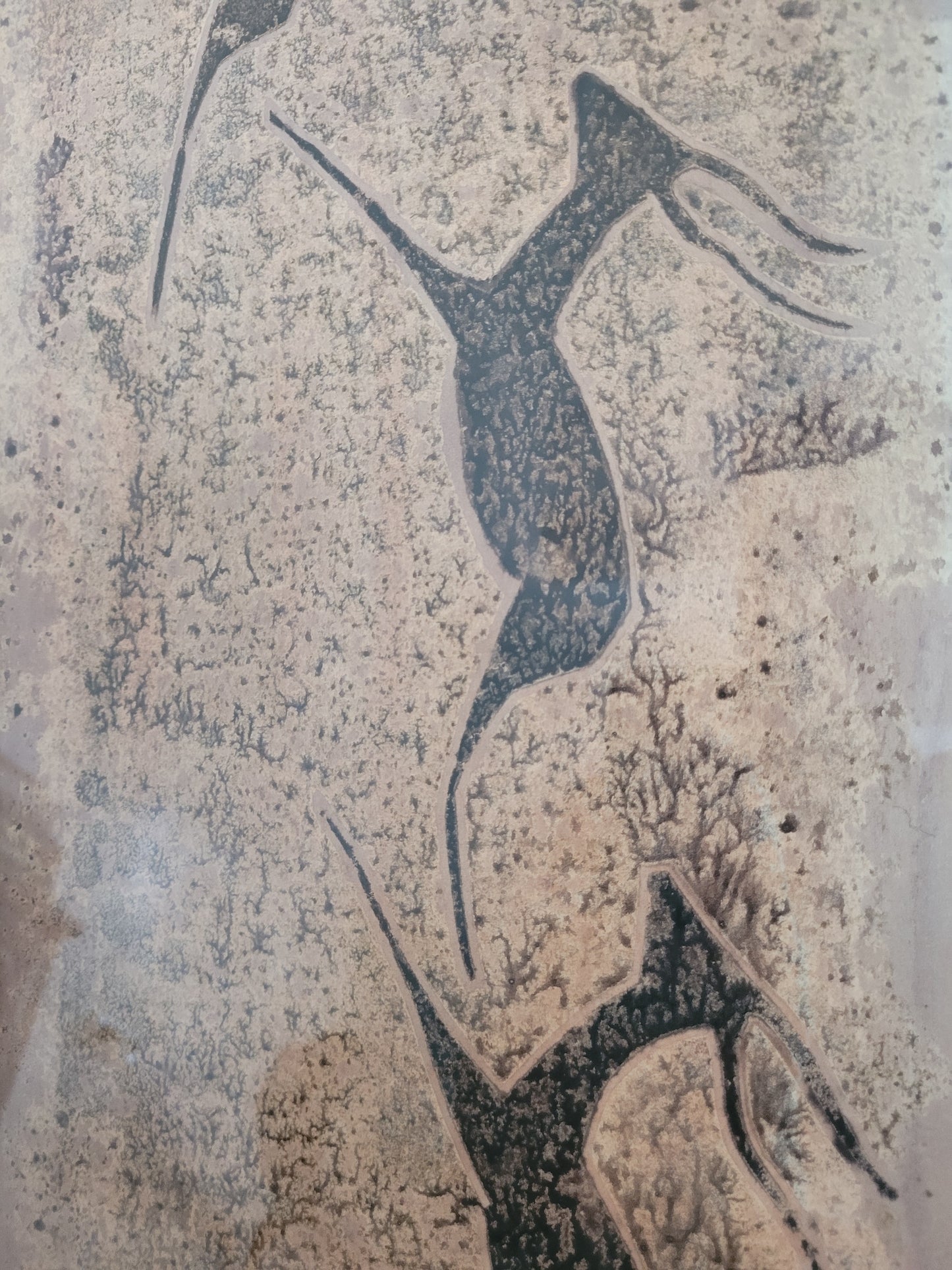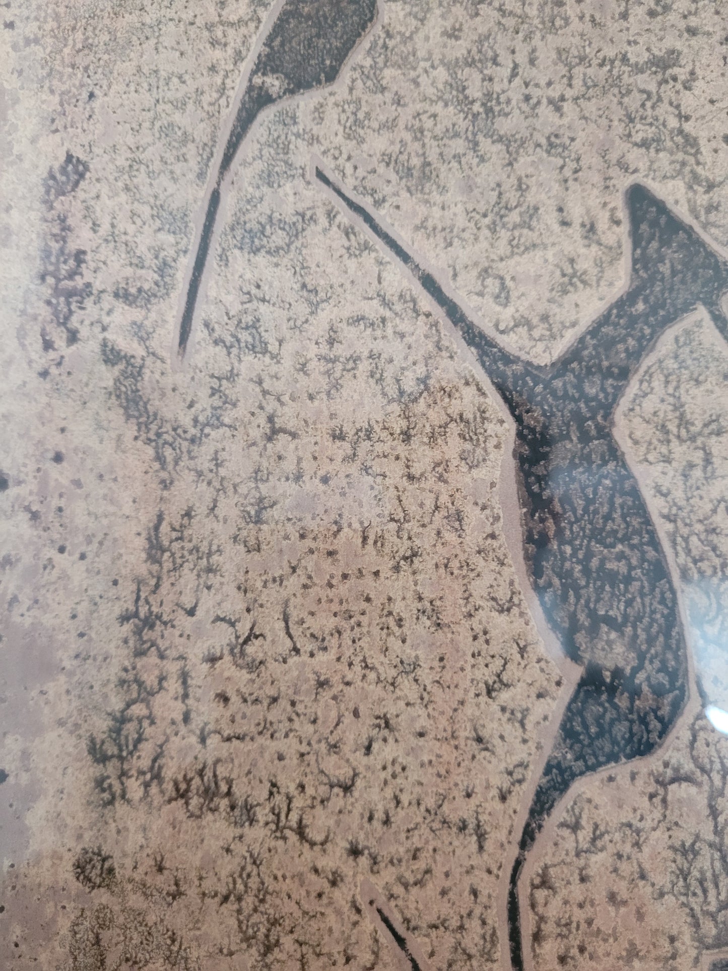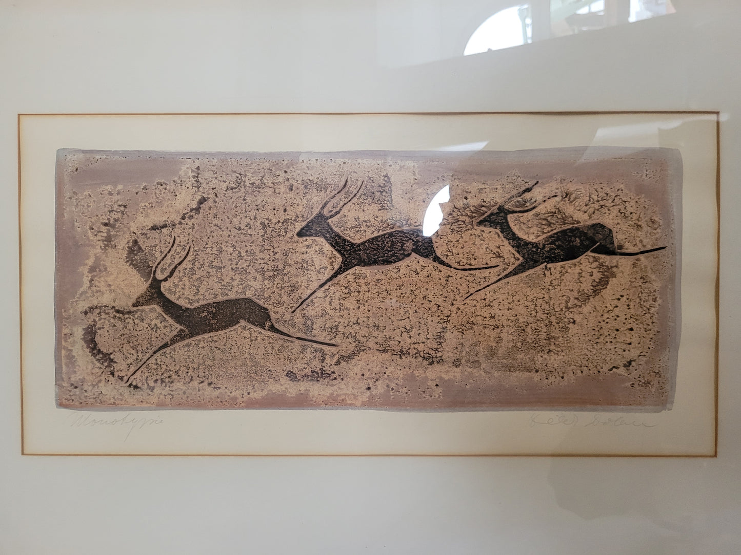 Diese original, handsignierte Monotypie fängt die majestätische Schönheit der afrikanischen Wildnis ein. Mit einer Größe von 90x60 cm (mit Rahmen) bzw. 60x30 cm (ohne Rahmen) präsentiert das Kunstwerk eine Szene, in der Antilopen in eine Richtung laufen, die an Höhlenmalereien erinnert.