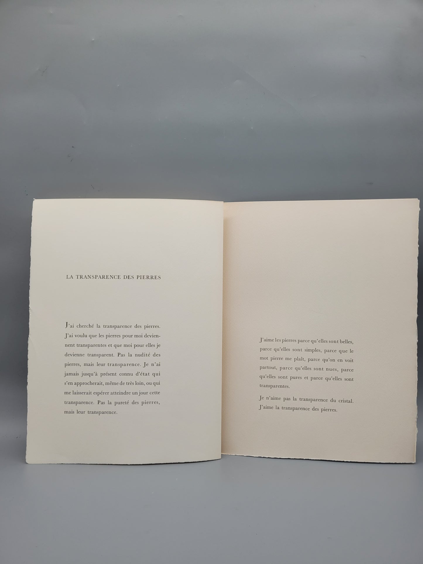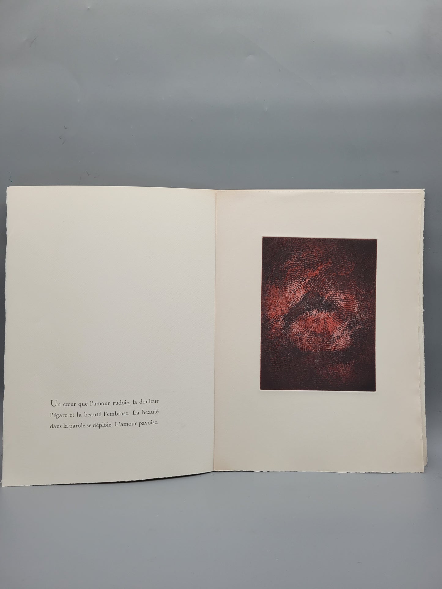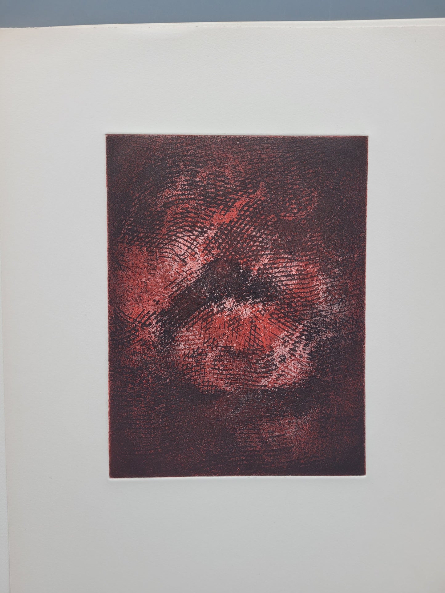 Diese originale Mappe enthält eine Farbradierung von Max Ernst. Die Mappe misst 38x28 cm, während die Radierung eine Größe von 21x16 cm hat. Max Ernsts surrealistischer Stil kommt in dieser Radierung hervorragend zur Geltung, und das Werk befindet sich in einem sehr guten Zustand. Ein bemerkenswertes Sammlerstück, das die Kreativität und das Können von Max Ernst widerspiegelt. Der Zustand der Mappe und der Radierung ist sehr gut, wie auf den beigefügten Fotos zu sehen.