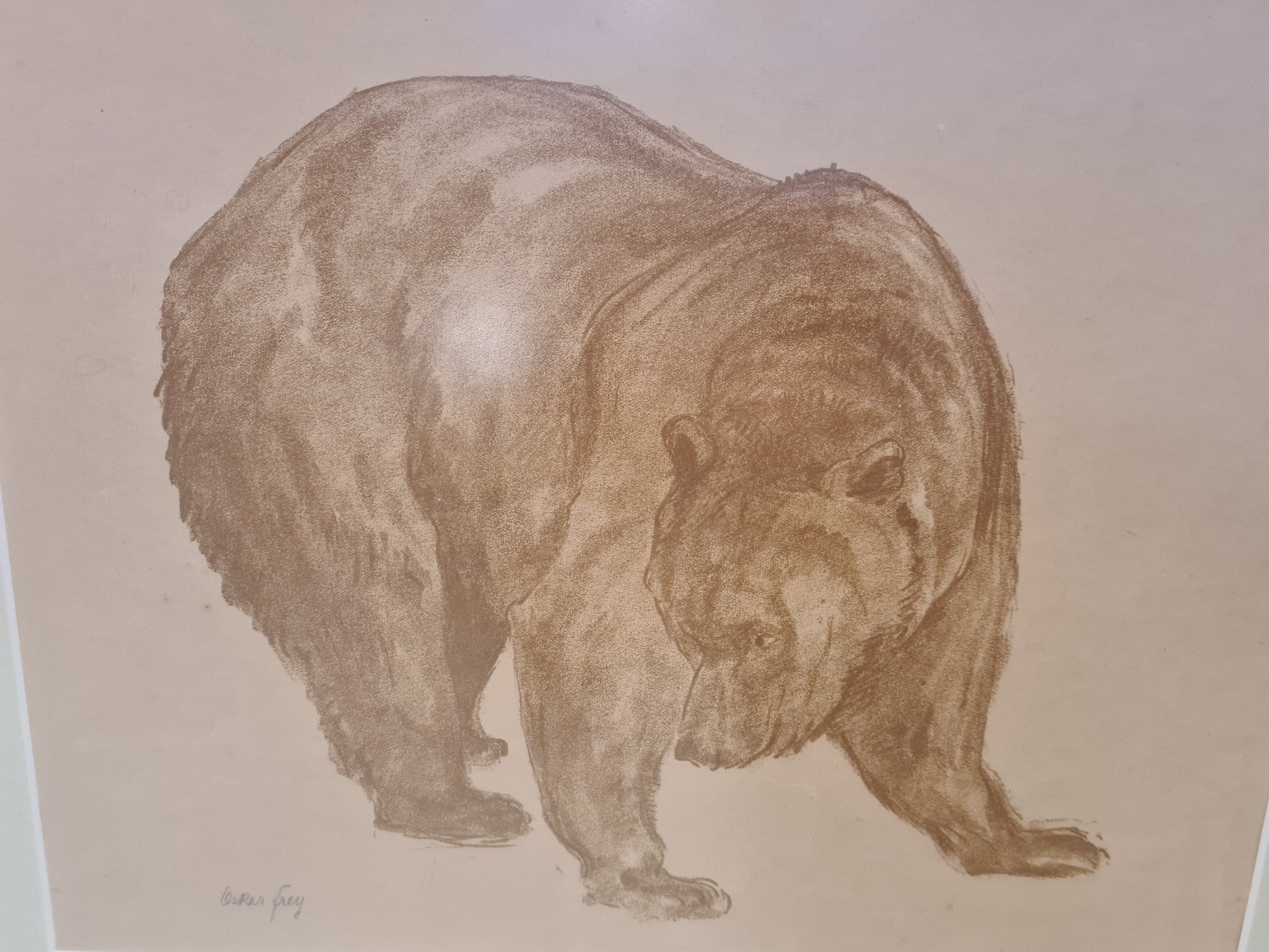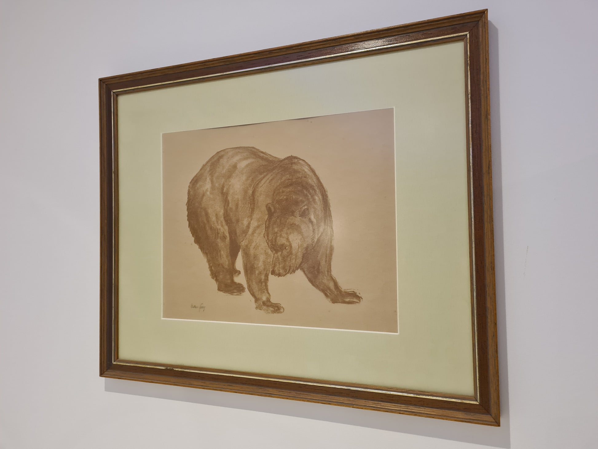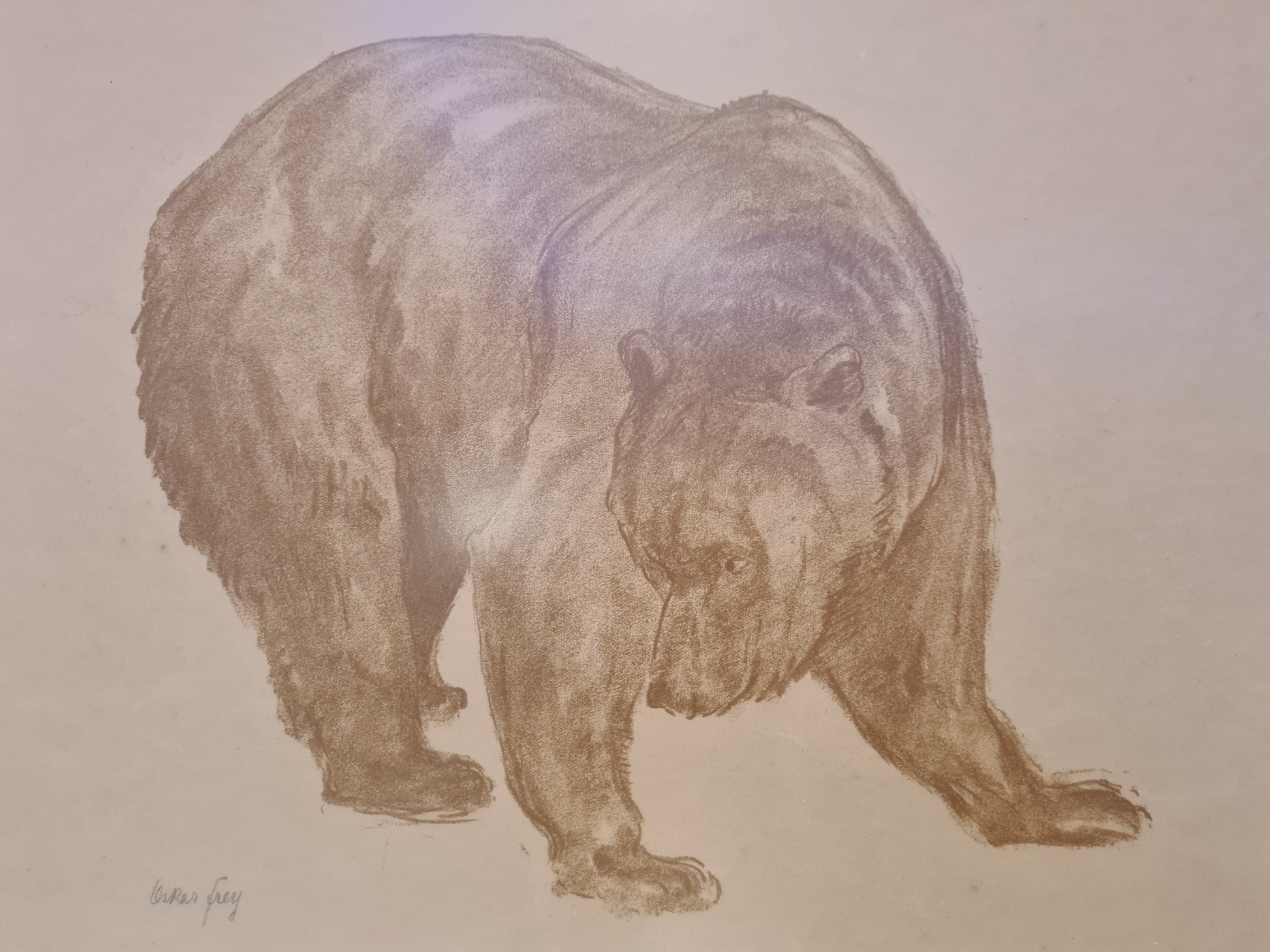 wir bieten Ihnen eine fein ausgeführte Tierdarstellung des Künstlers Oskar Frey. Die Zeichnung zeigt einen Bären in kraftvoller Pose und ist ein schönes Beispiel für künstlerische Tiermalerei mit Charakter und Ausdruck.