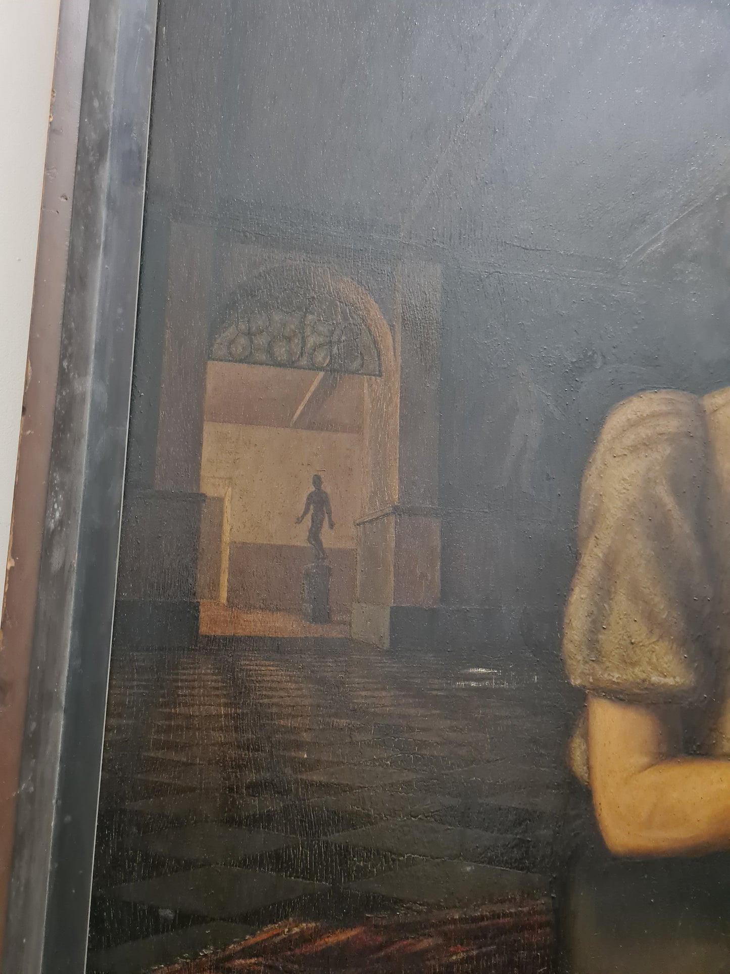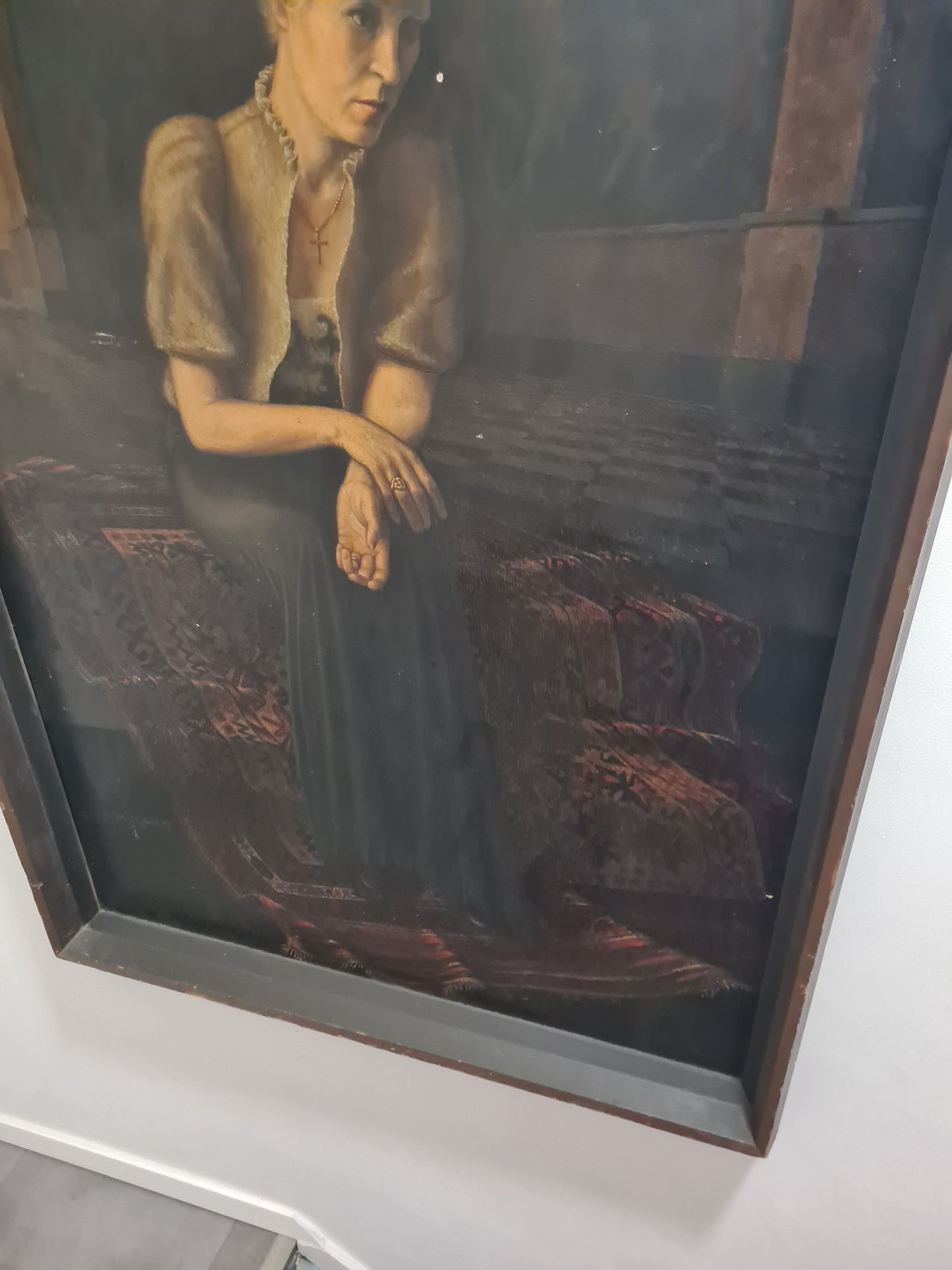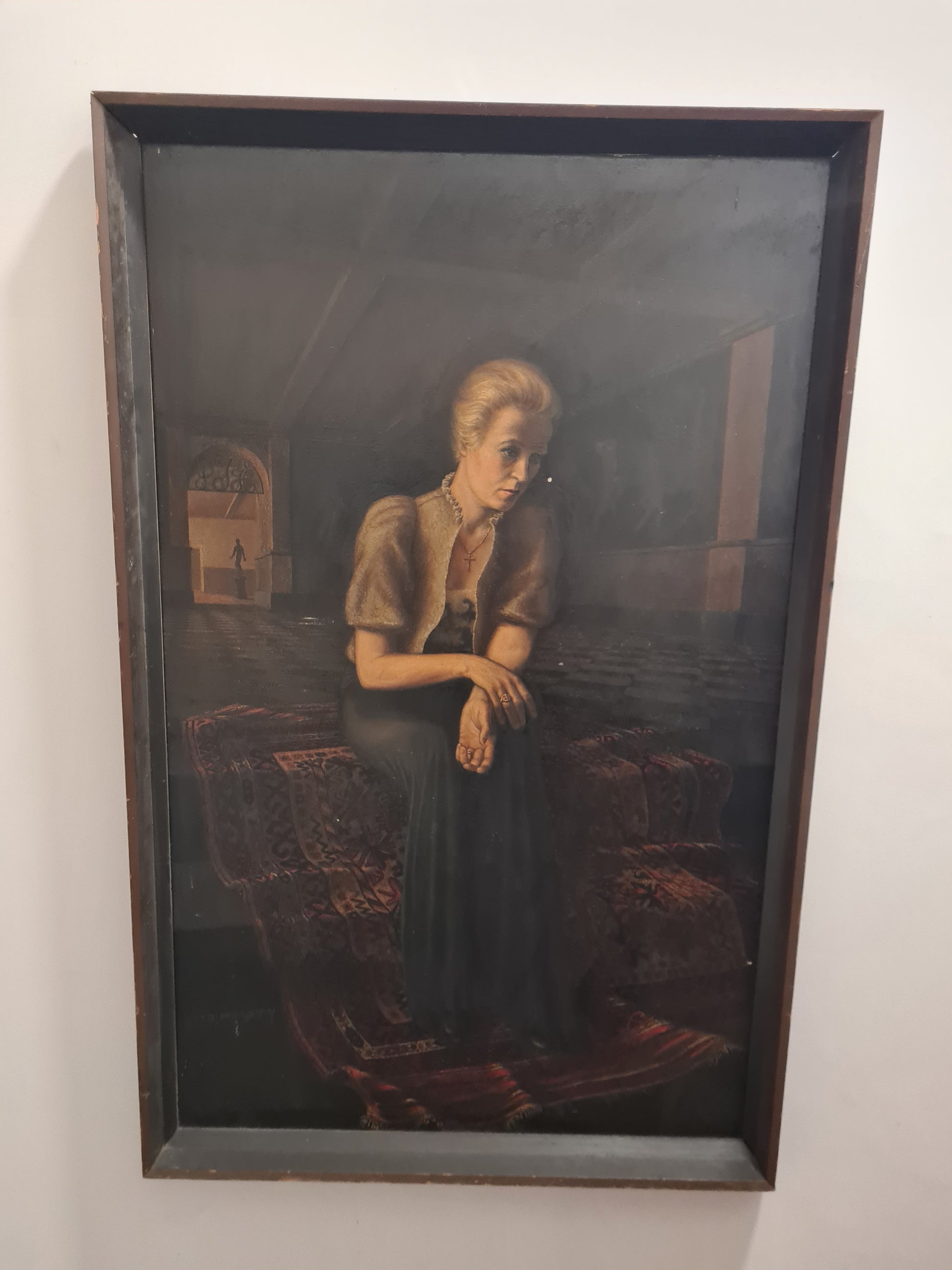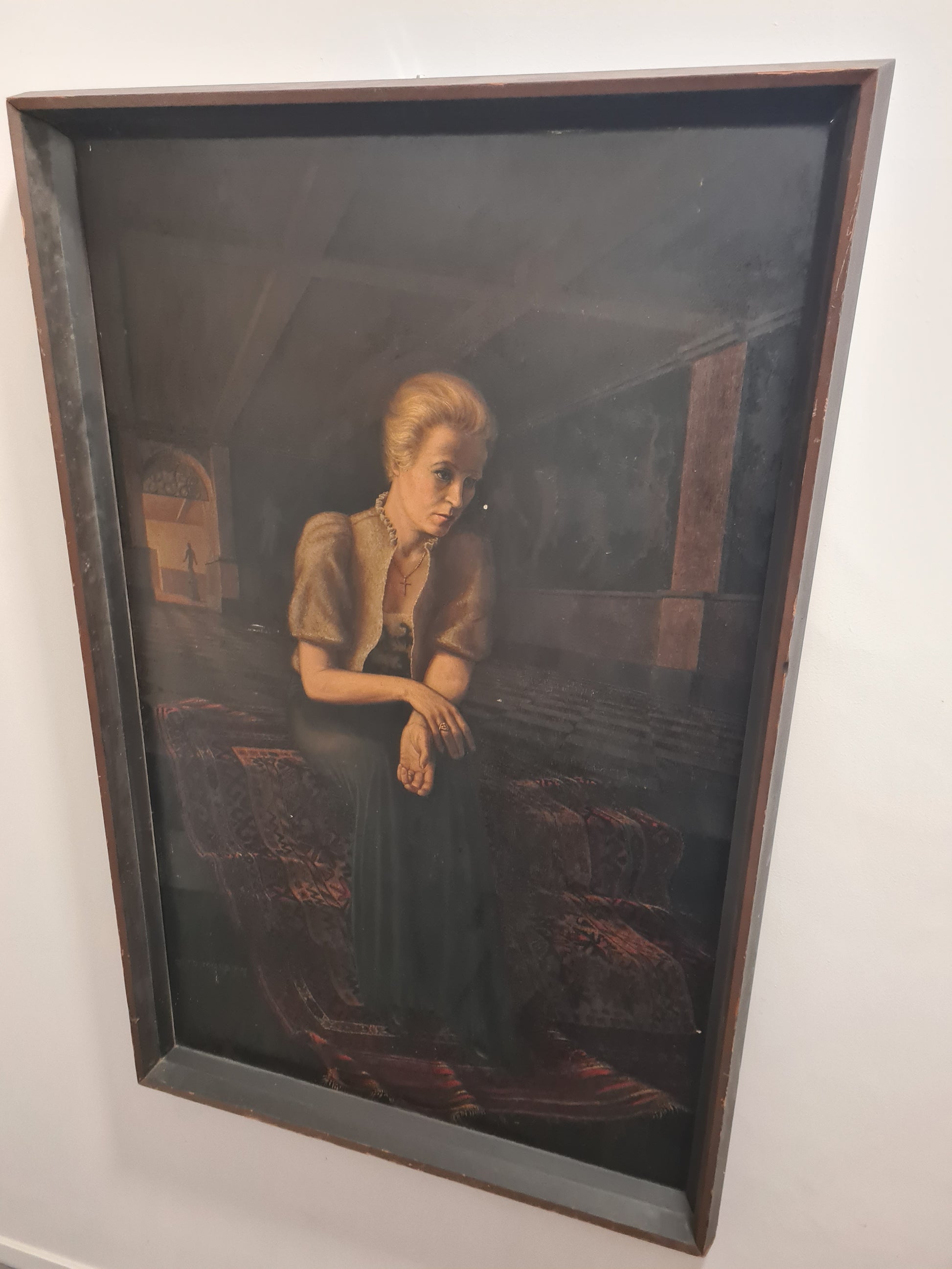 Beschreibung: Dieses großformatige Ölgemälde von Otto Mulsow aus dem Jahr 1935 zeigt eine elegante Frau in einem Abendkleid, dargestellt im Interieur. Mulsow hat das Werk handsigniert, und es stammt aus dem Nachlass in Nordrhein-Westfalen. Es wurde zuvor auf einer Auktion bei Hargesheimer Kunstauktionen in Düsseldorf angeboten. Das Gemälde war Teil der Bremer Kunstschau in der Böttcherstraße im Jahr 1935 und wurde im Rahmen eines Malwettbewerbes mit dem Thema "Frauenbildnis mit Schmuck" ausgestellt. Die Maße mit Rahmen betragen 155x100cm, während das eigentliche Bild eine Größe von 150x95cm hat. Der Zustand wird als gut beschrieben und kann auf den beigefügten Fotos eingesehen werden.