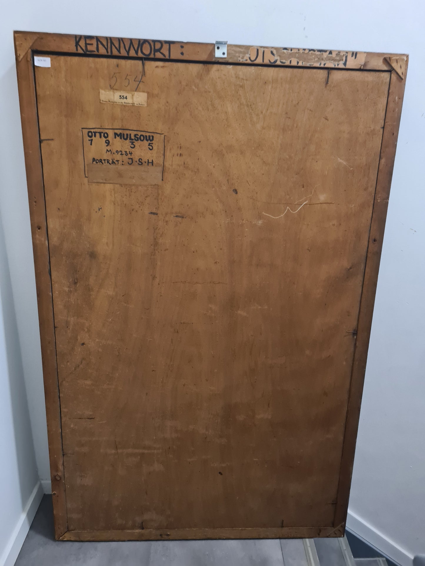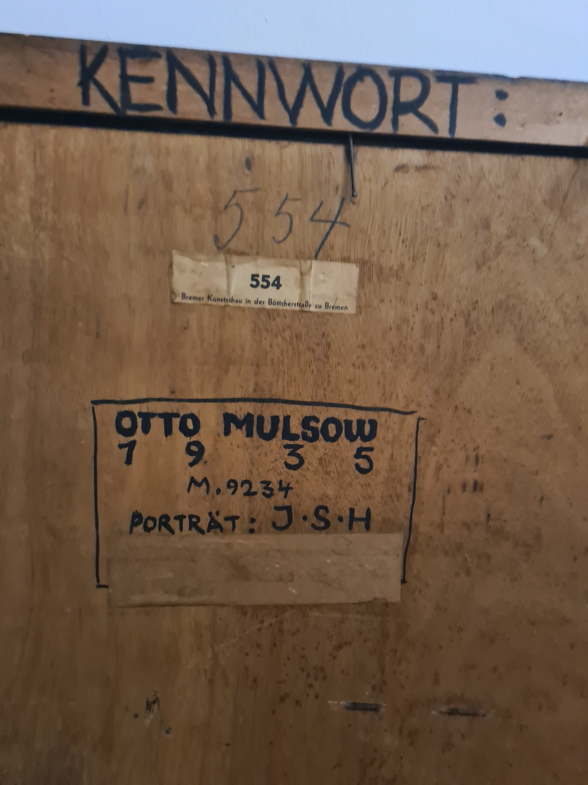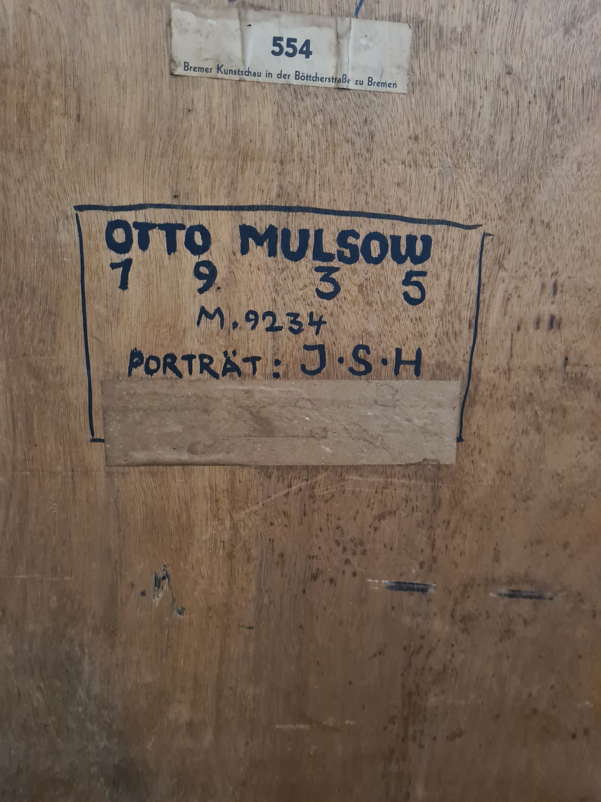 • Publikation: Rückseite mit Ausstellungsetikett "Bremer Kunstschau in der Böttcherstraße zu Bremen 554", sowie bez. "Otto Mulsow 1935 M. 9234 Porträt: J.S.H."