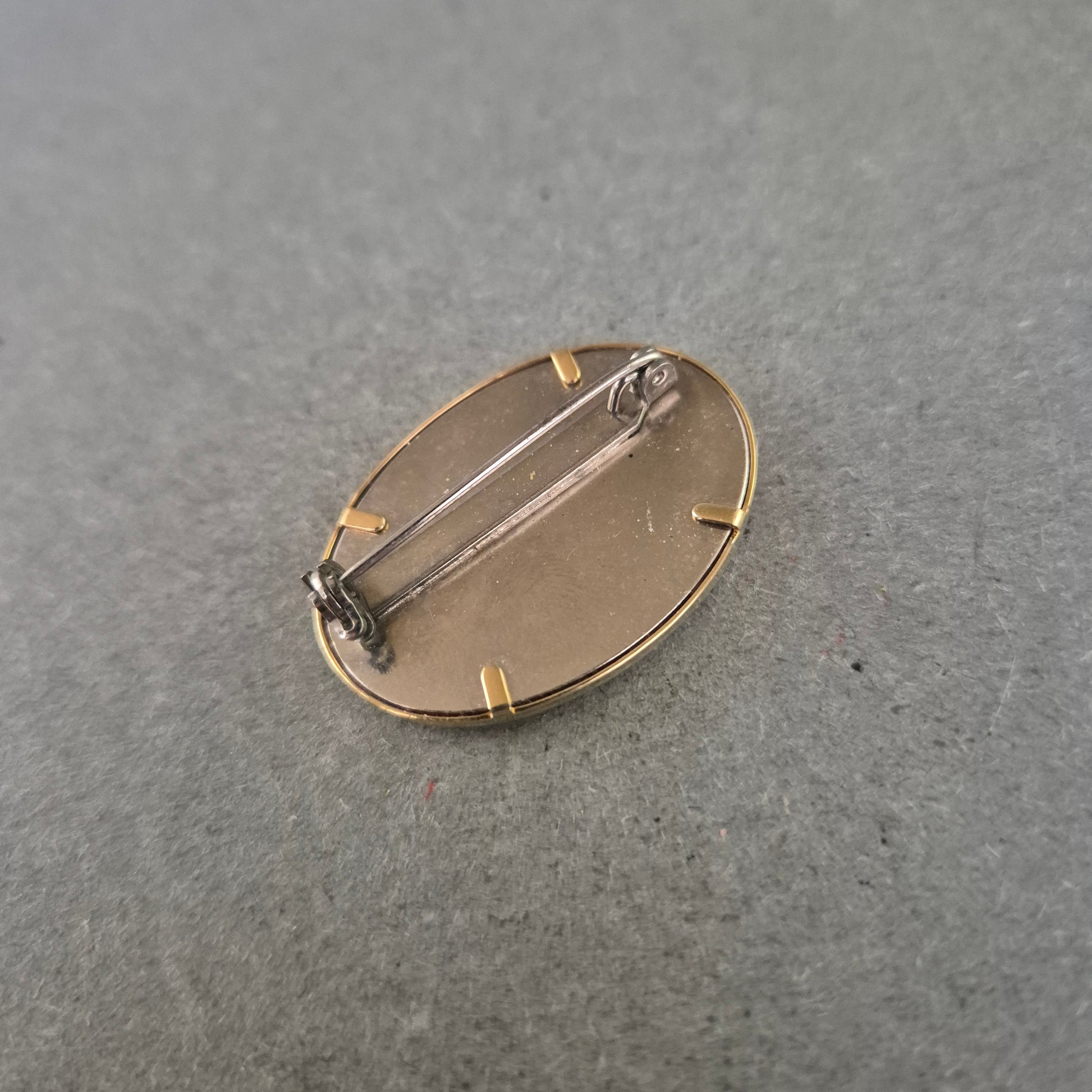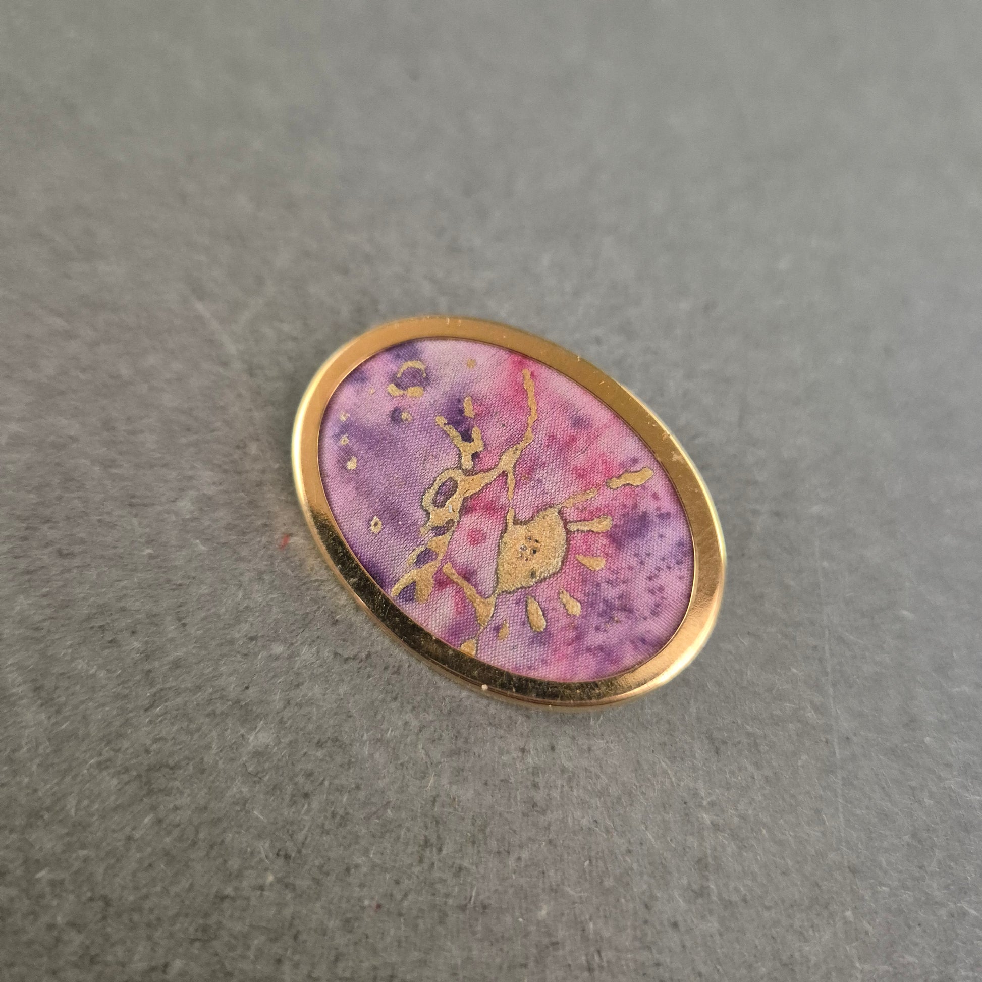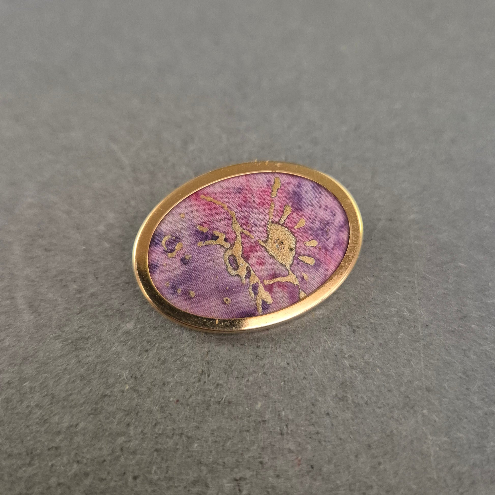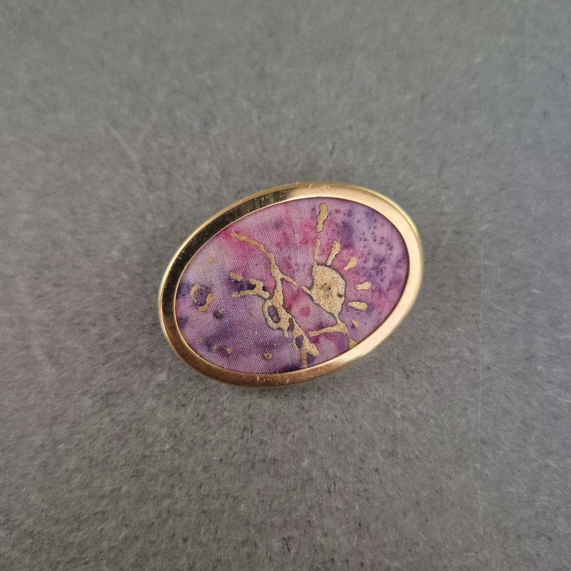 Ovale Brosche mit lila Stoffeinlage und goldener Handzeichnung