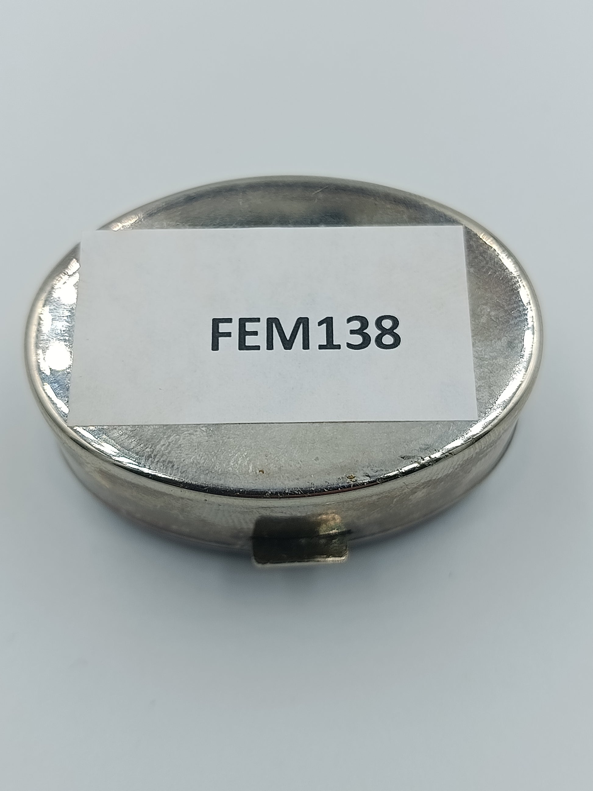 Schlichte, elegante ovale Dose aus versilbertem Metall mit glatter Oberfläche und dezentem Glanz. Der Innenraum ist mit weißem Einsatz ausgestattet, ideal zum Aufbewahren kleiner Schmuckstücke oder Pillen. Ein zeitloses, minimalistisches Sammlerstück.
