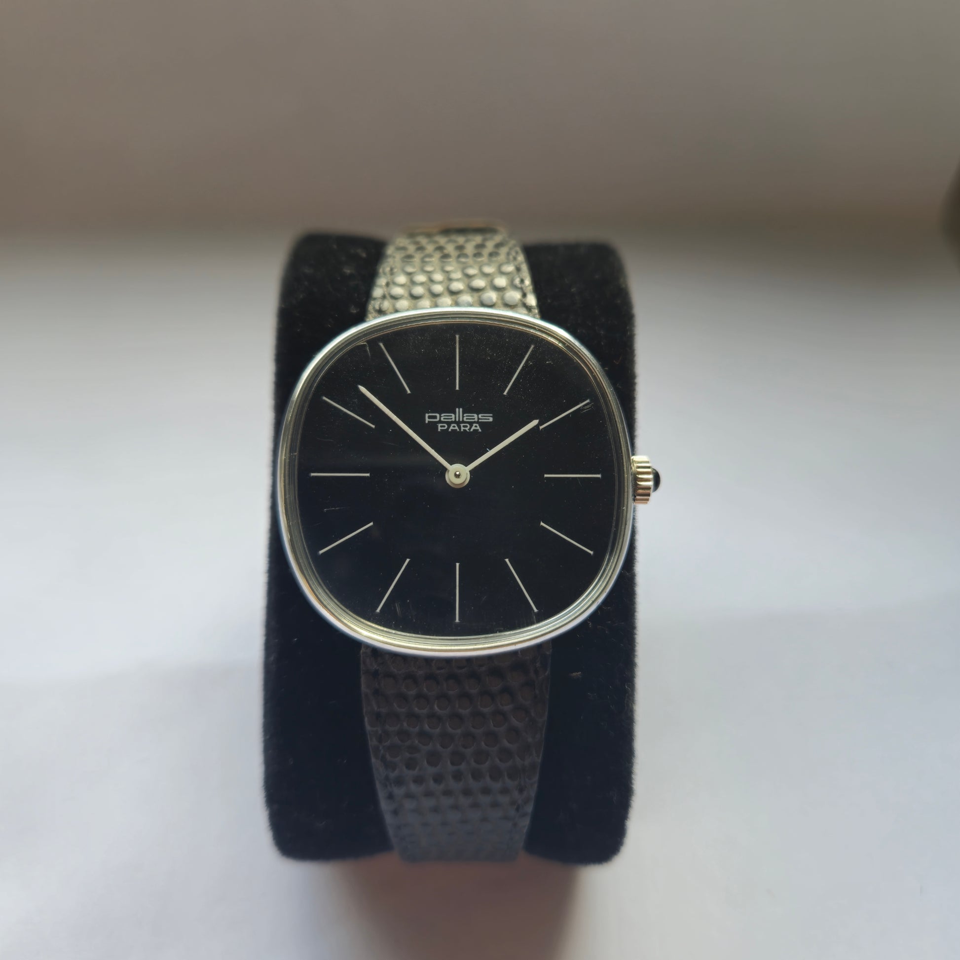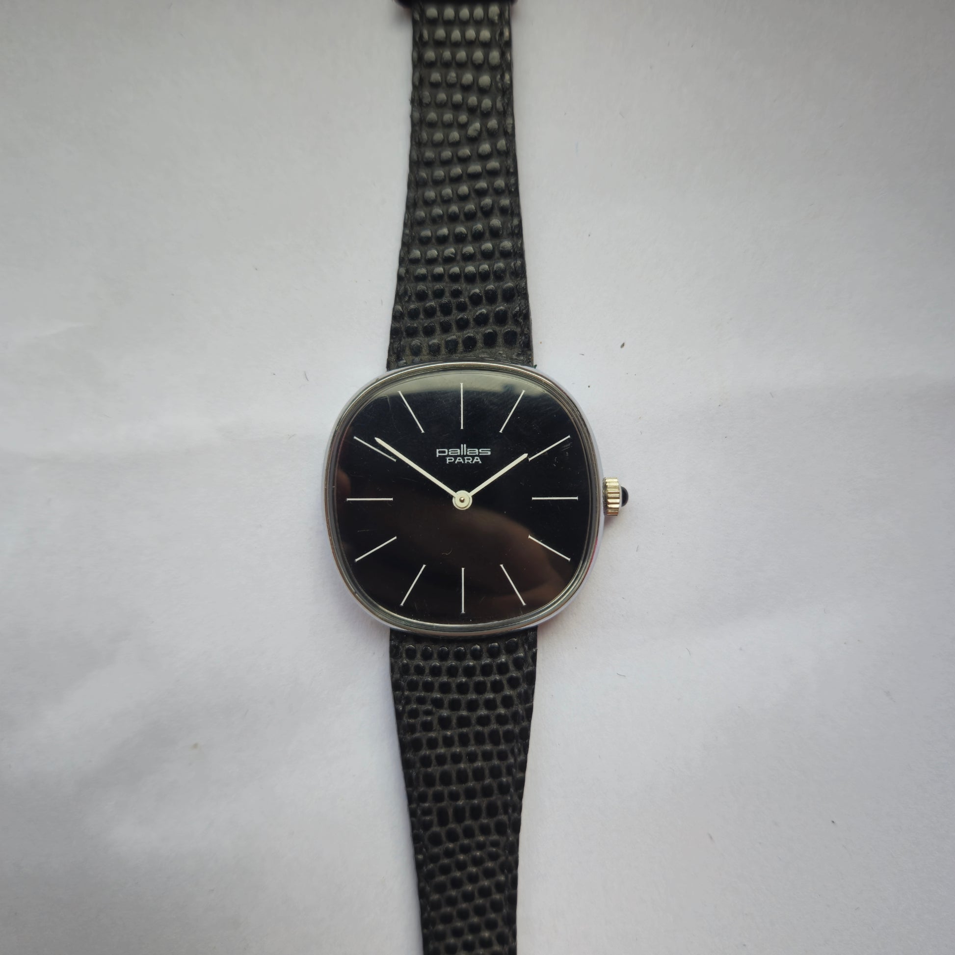 Diese klassische Pallas PARA Armbanduhr ist ein seltener Fund aus den 1970er Jahren und begeistert Liebhaber des minimalistischen Designs. Die Uhr zeichnet sich durch ein elegantes, schlichtes Design aus, mit einem schwarzen Zifferblatt und silberfarbenen Zeigern und Markierungen, eingefasst in ein Edelstahlgehäuse. Das schwarze, strukturierte Lederarmband ergänzt die dezente Ästhetik der Uhr.
