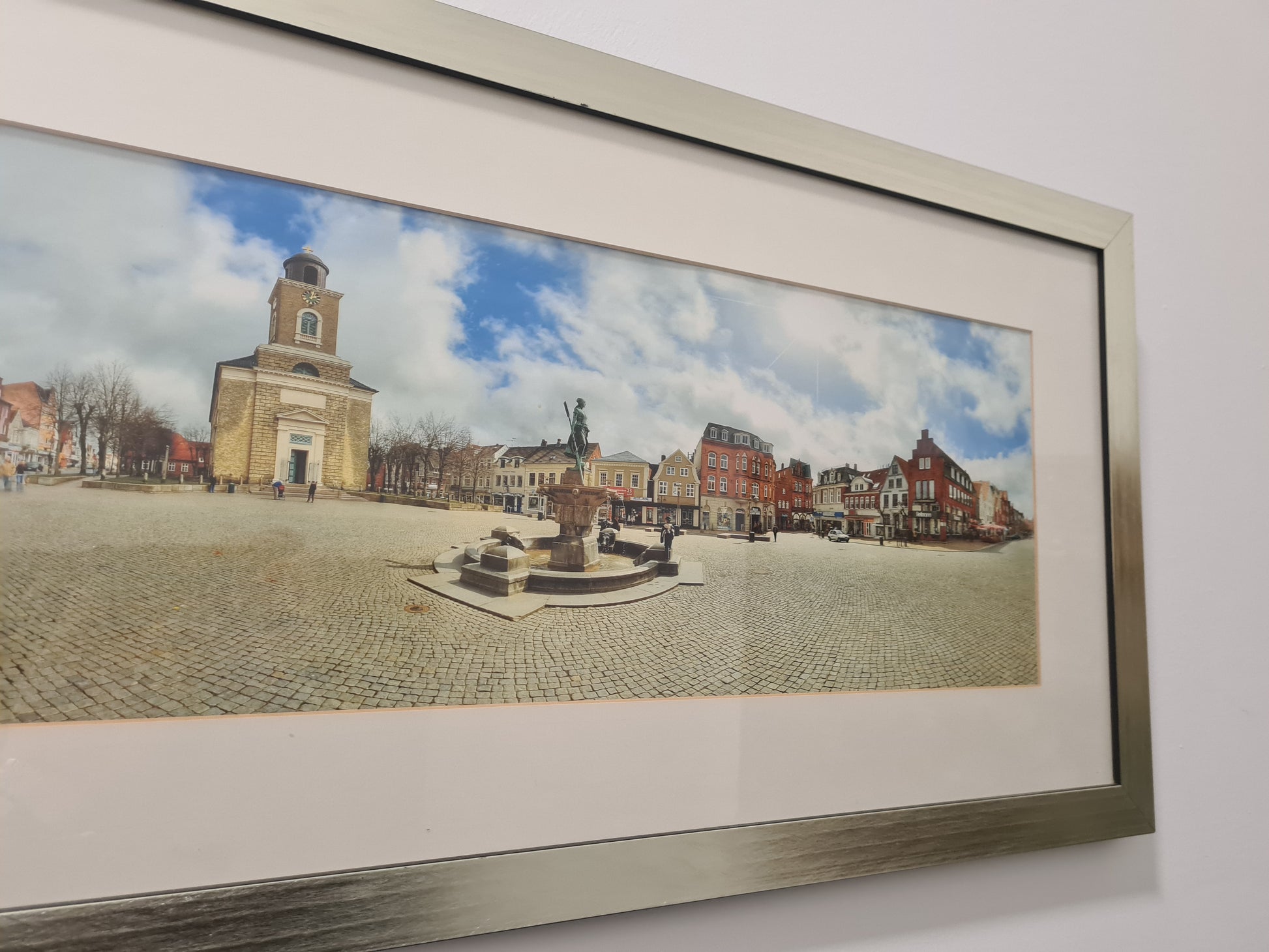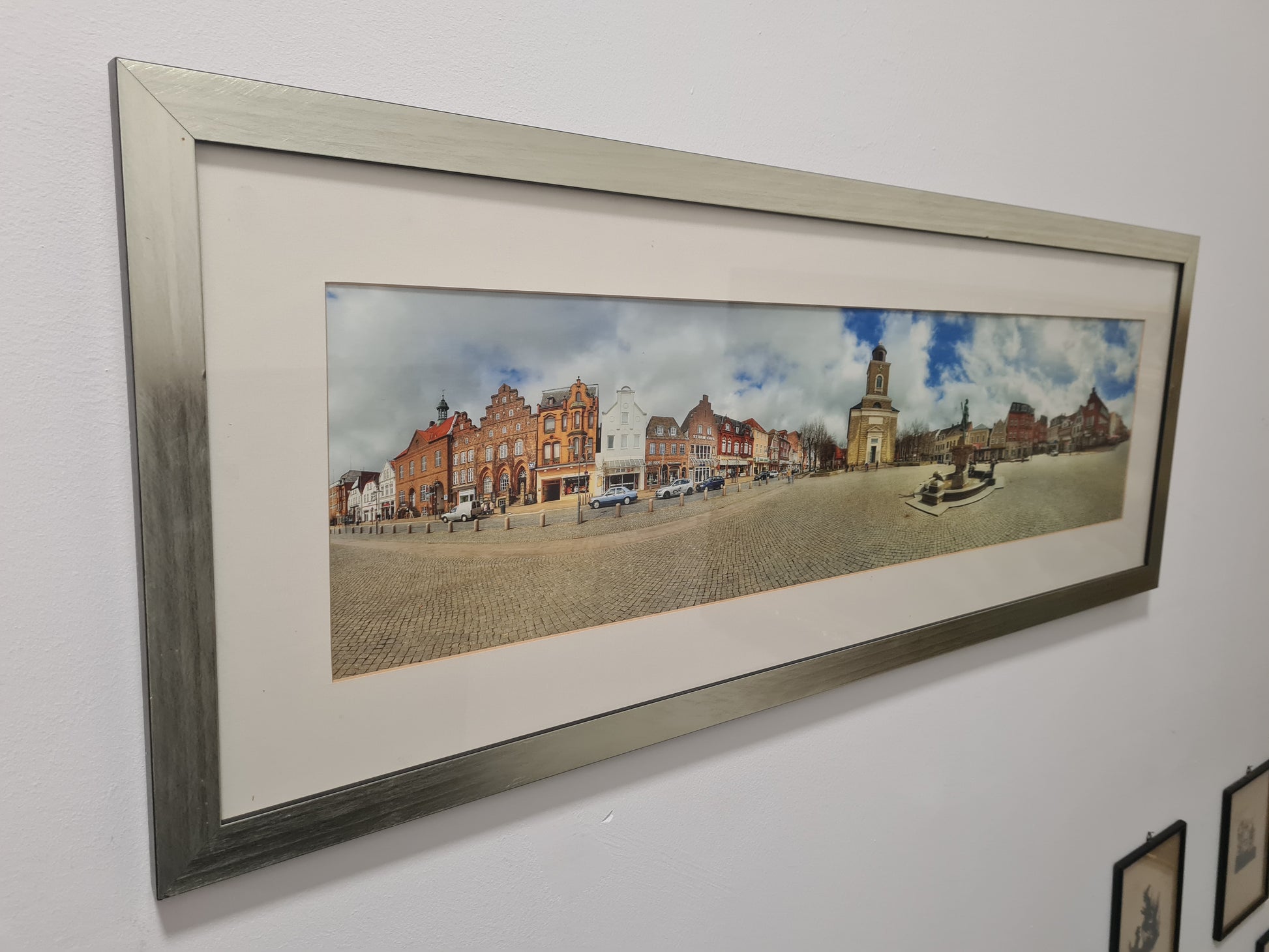 angeboten wird ein Panorama-Foto der Stadtansicht von Husum, gerahmt – eine beeindruckende Fotografie im großzügigen Querformat.