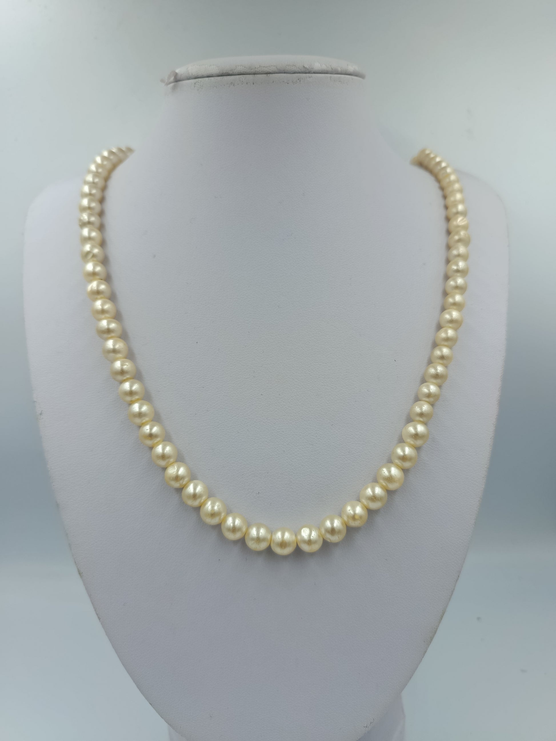 Elegante Perlenkette in zartem Cremeweiß, klassisch geknüpft mit Rundperlen. Diese zeitlose Kette verleiht jedem Outfit eine edle Note und ist ideal für festliche Anlässe oder den stilvollen Alltag.