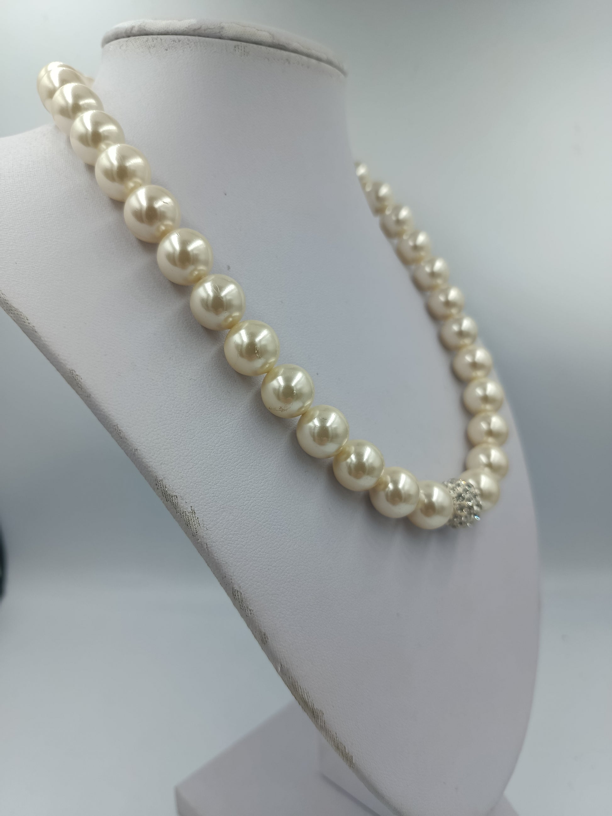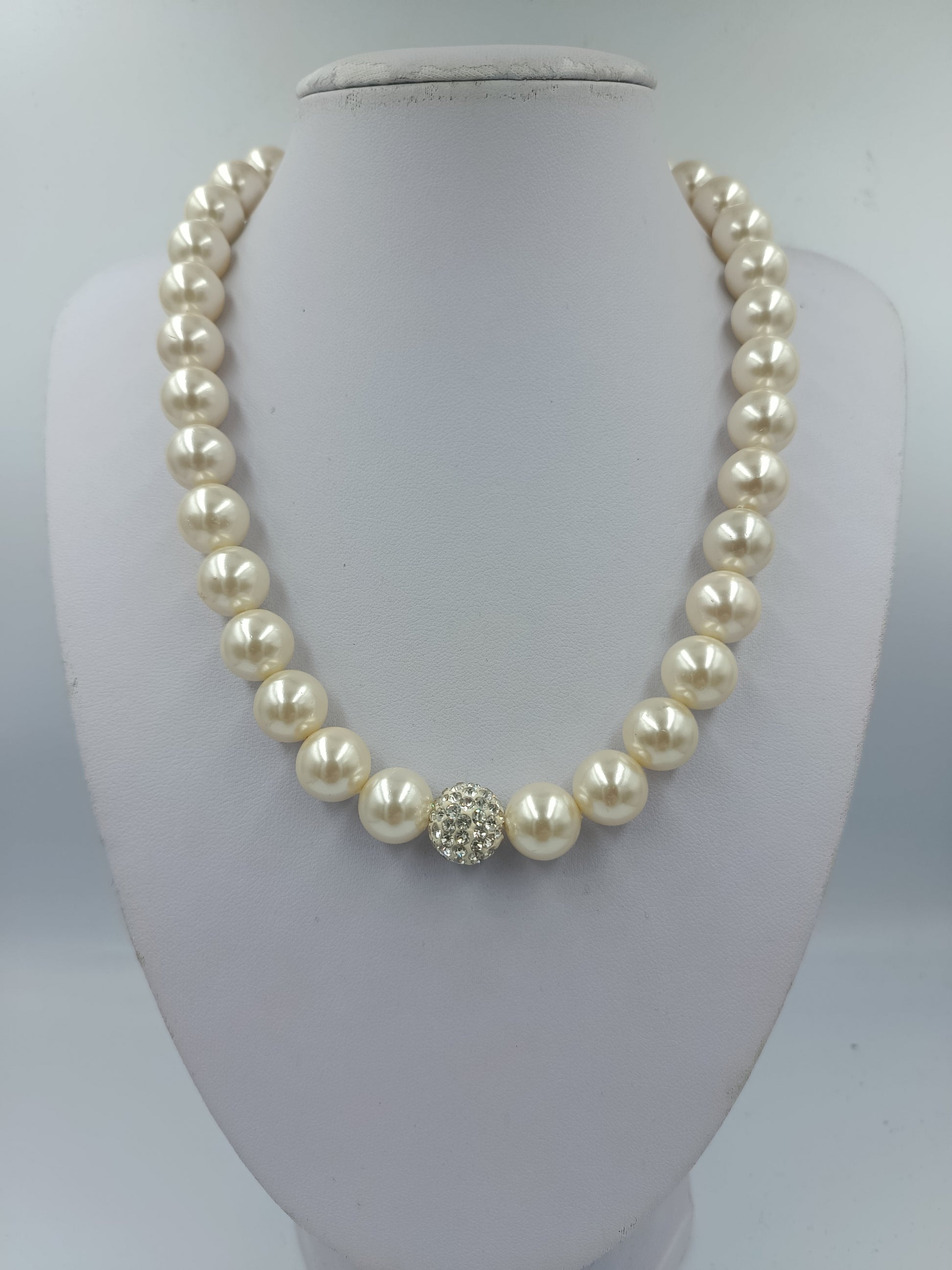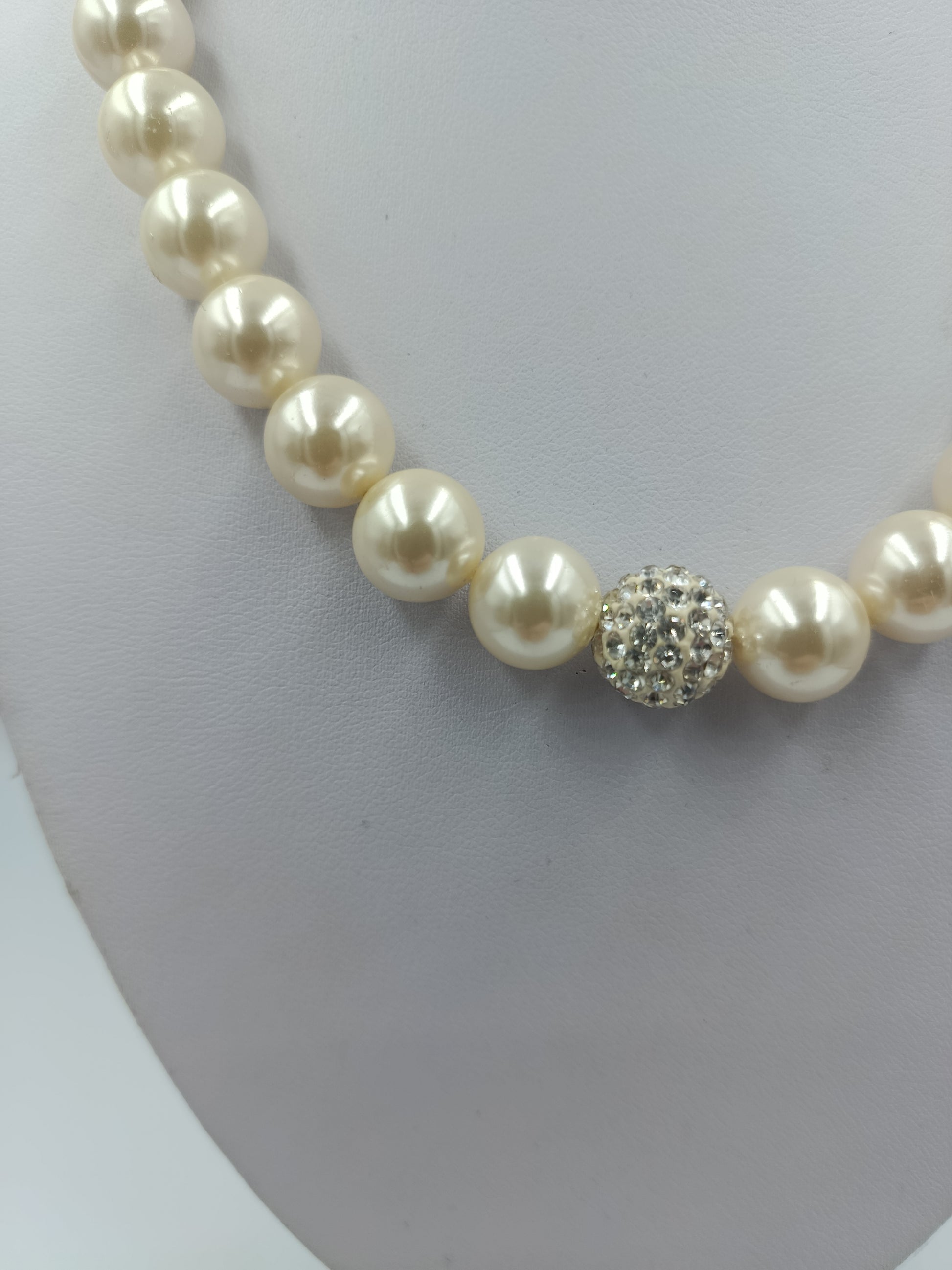 Edle Perlenkette in Cremefarben mit einer funkelnden Strass-Kugel als Blickfang. Die gleichmäßig glänzenden Perlen verleihen der Kette einen klassisch-eleganten Look, ideal für festliche Anlässe oder als stilvolles Accessoire im Alltag.