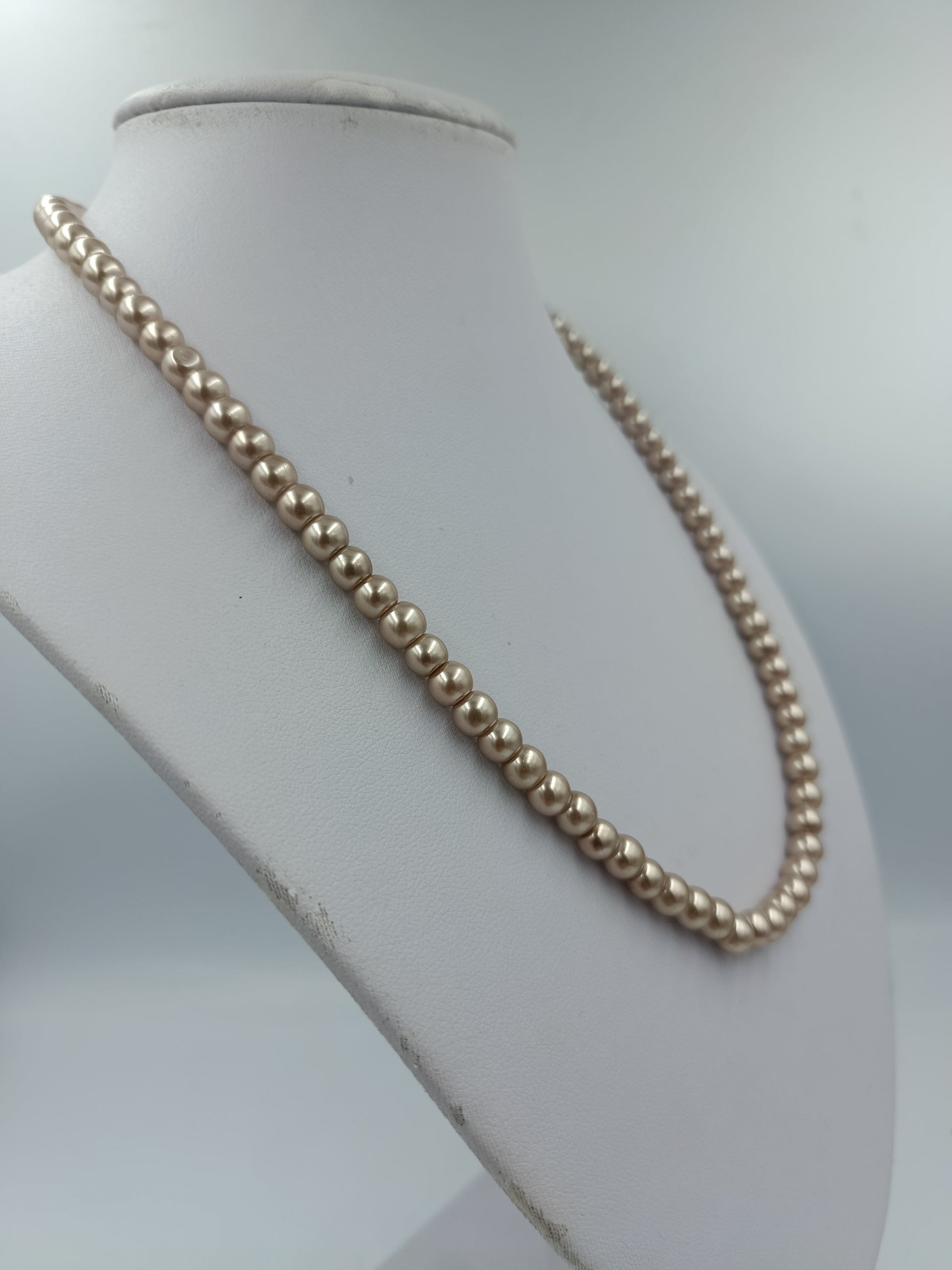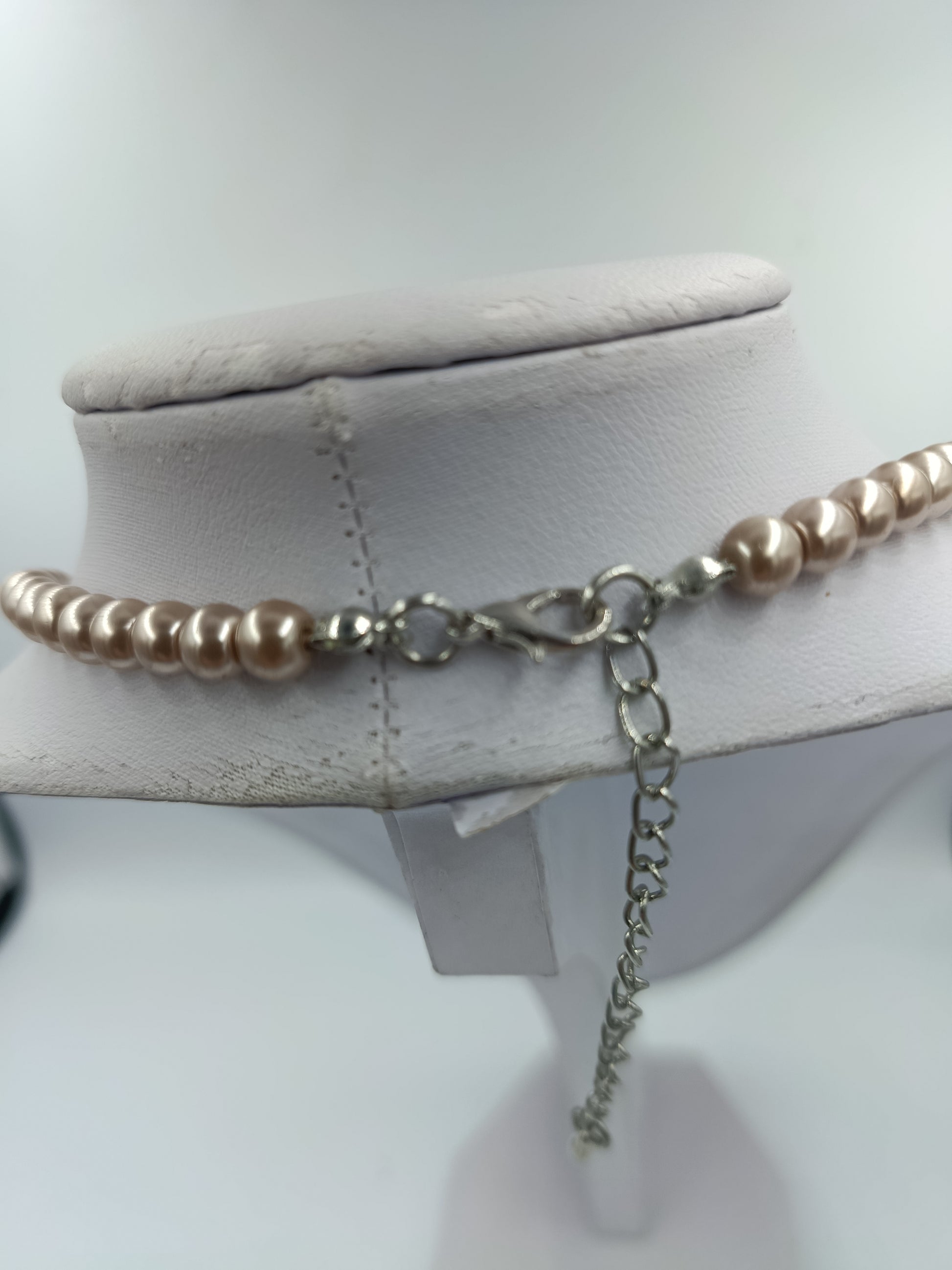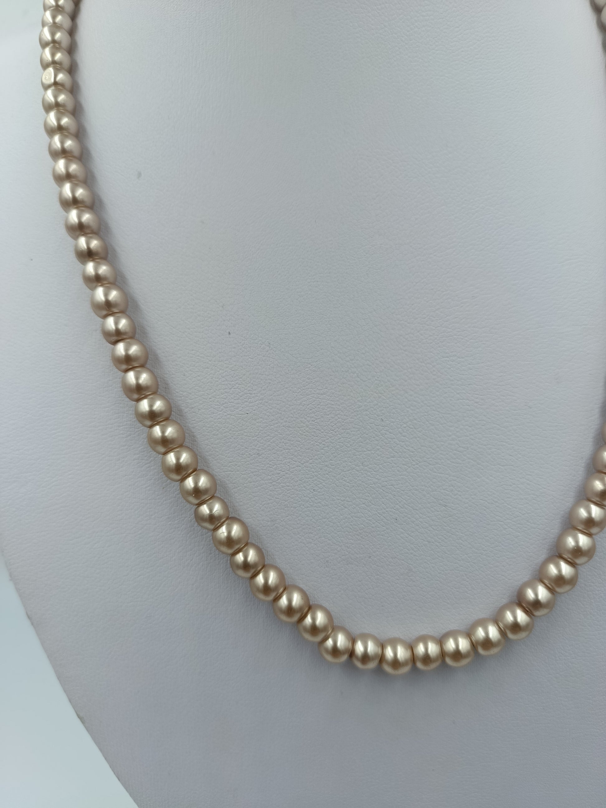 Schlichte und elegante Perlenkette in zartem Roséton, die durch ihren sanften Glanz und ihr zeitloses Design überzeugt. Die Kette lässt sich dank der Verlängerung individuell anpassen und passt perfekt zu festlicher Kleidung oder als stilvolles Accessoire im Alltag.