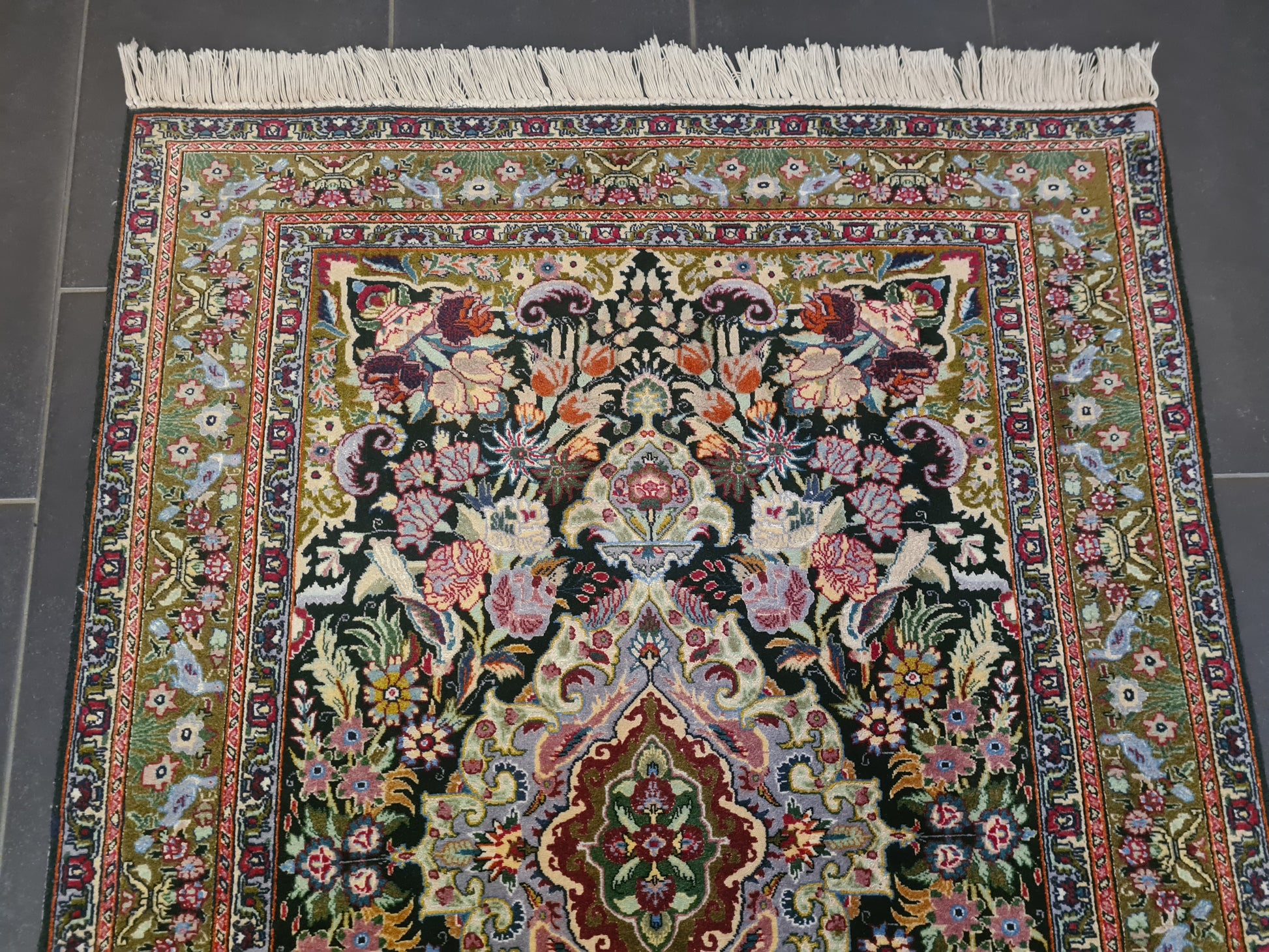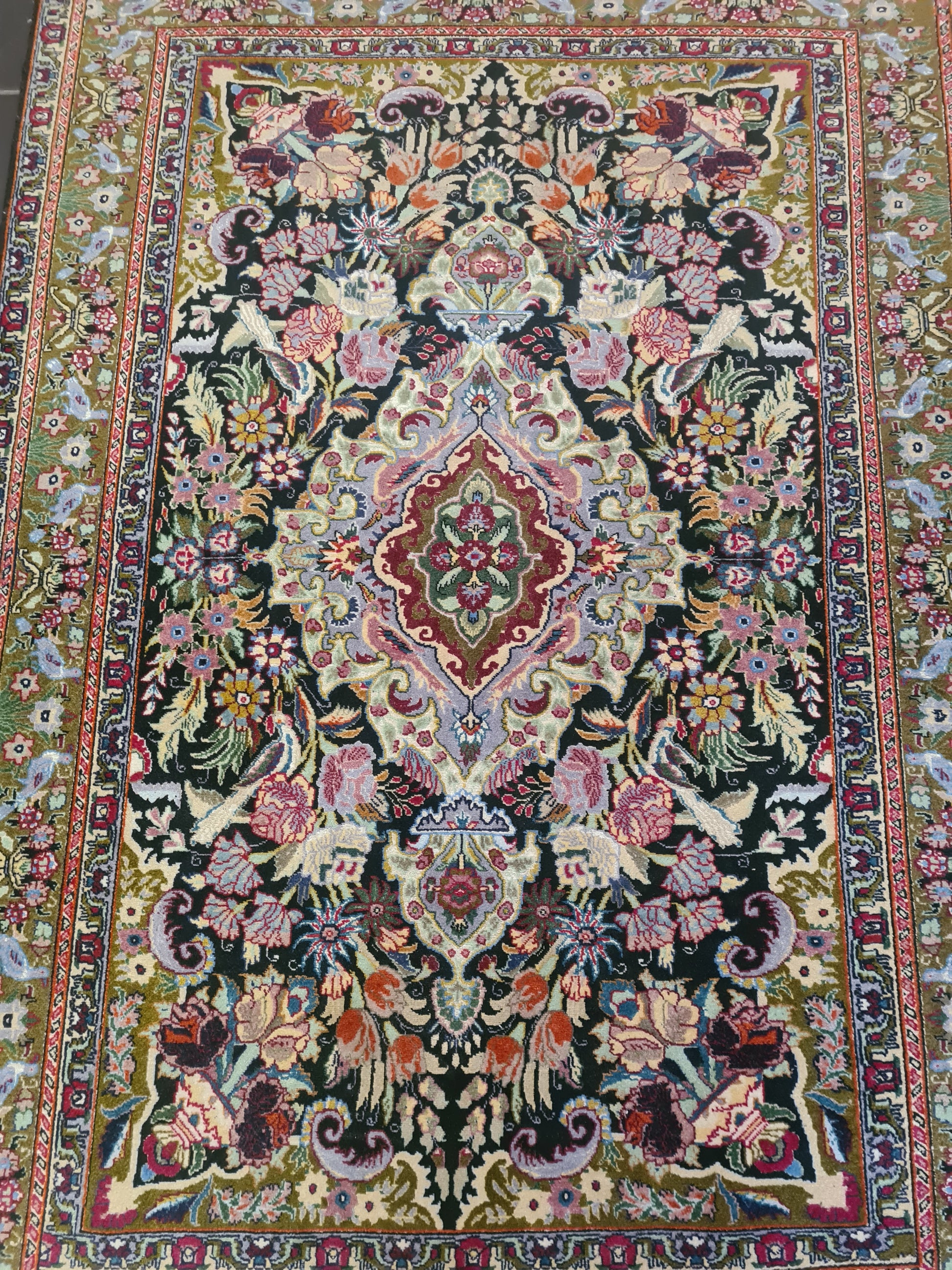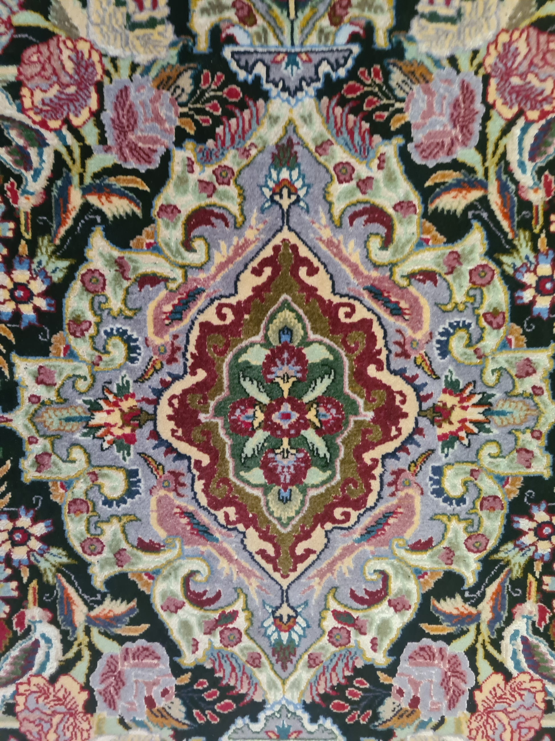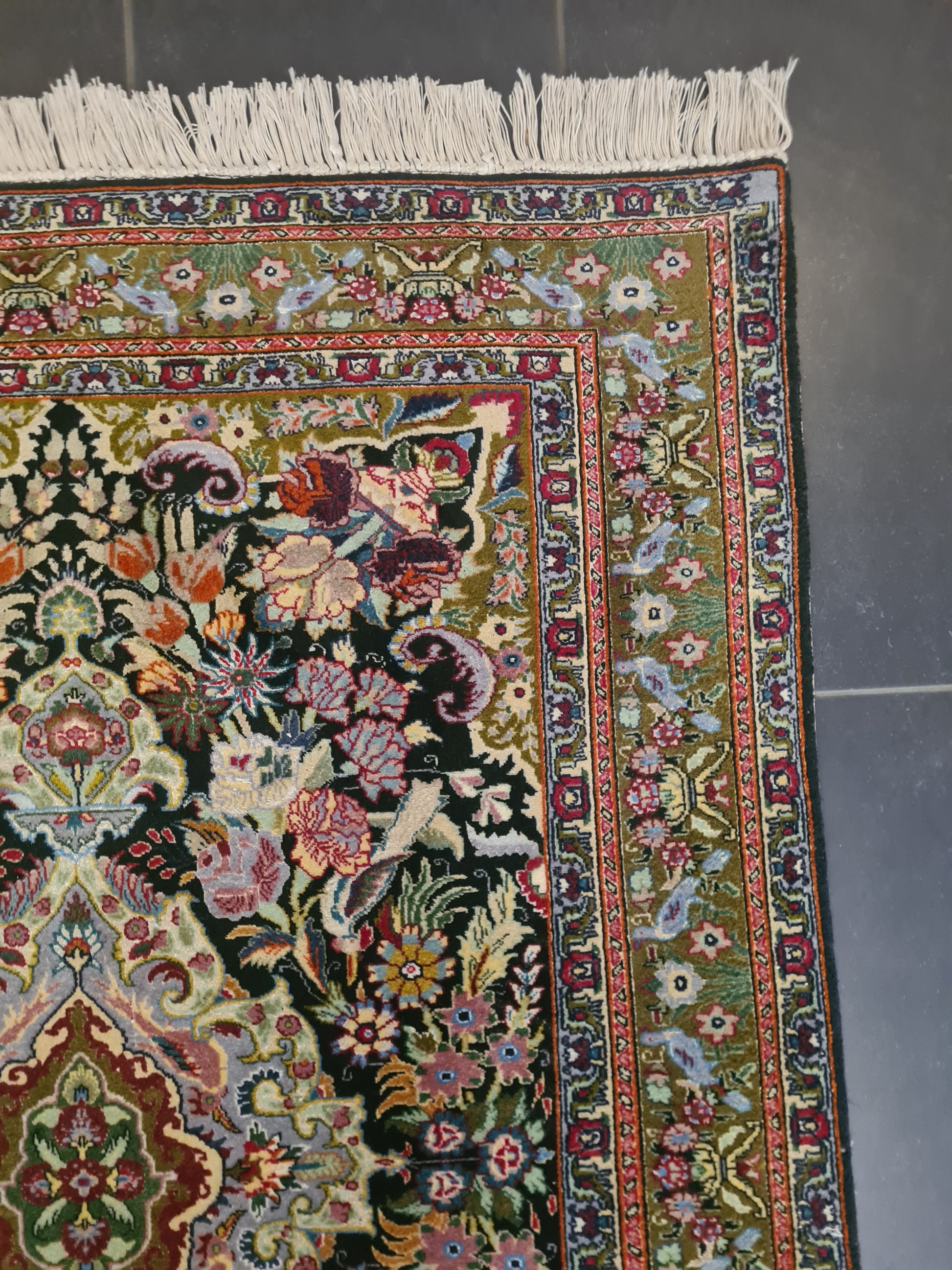angeboten wird ein fein gearbeiteter, handgeknüpfter Perserteppich aus Ghoum. Dieser Orientteppich zeichnet sich durch seine detailreiche Knüpfkunst und die harmonische Farbgestaltung aus.