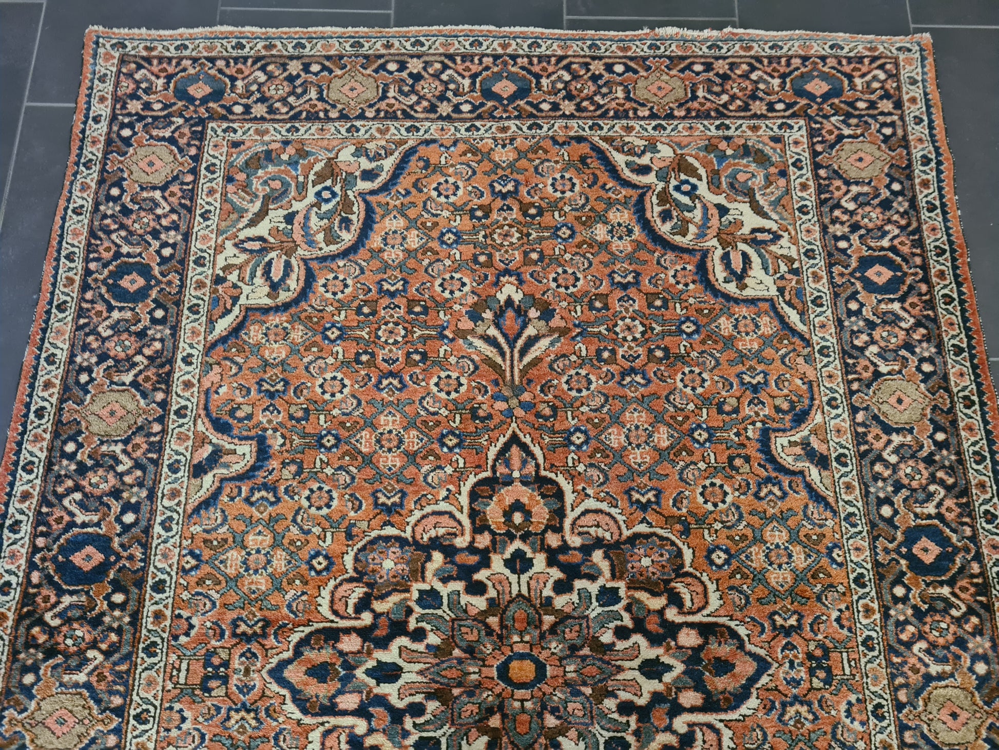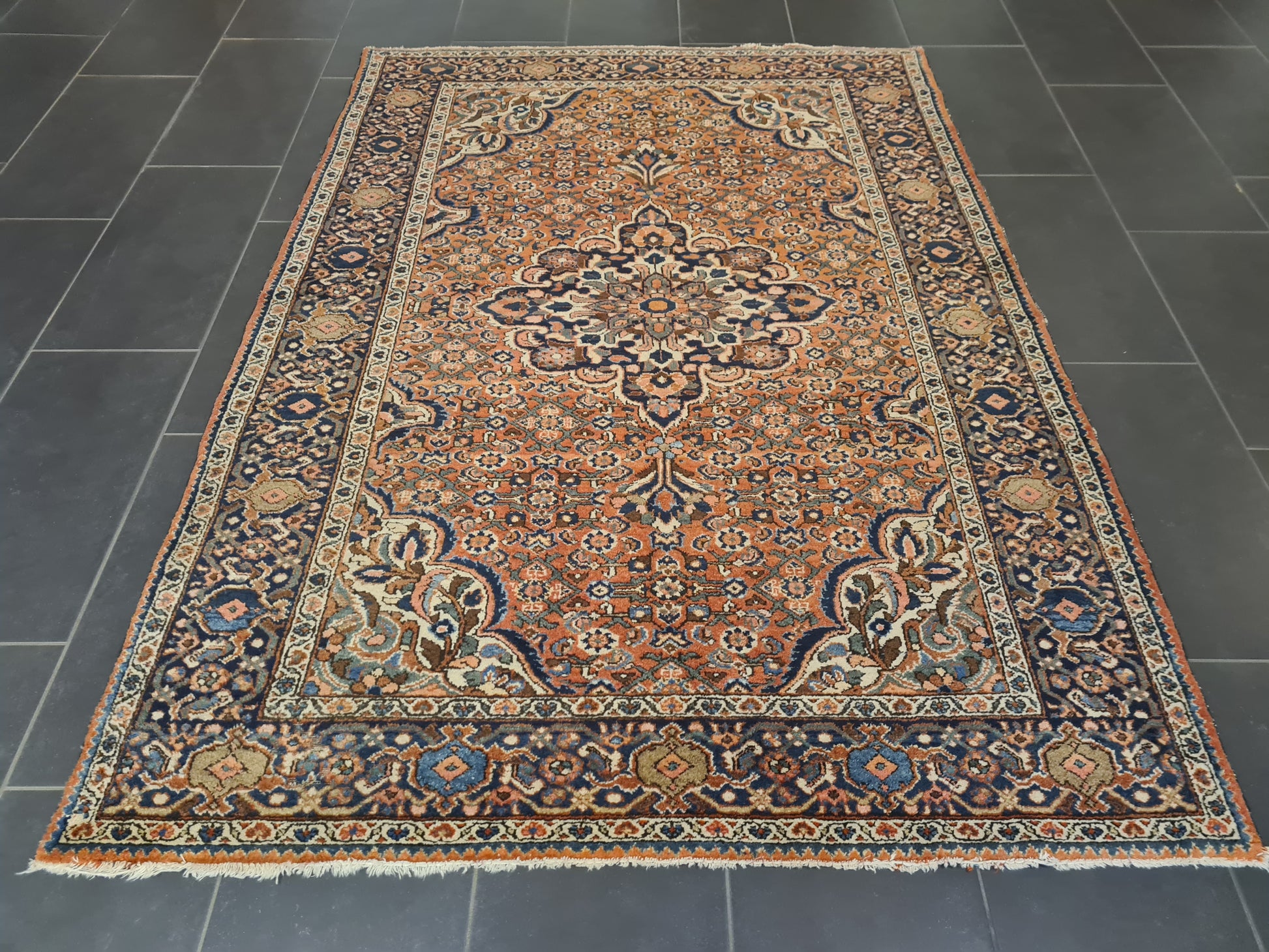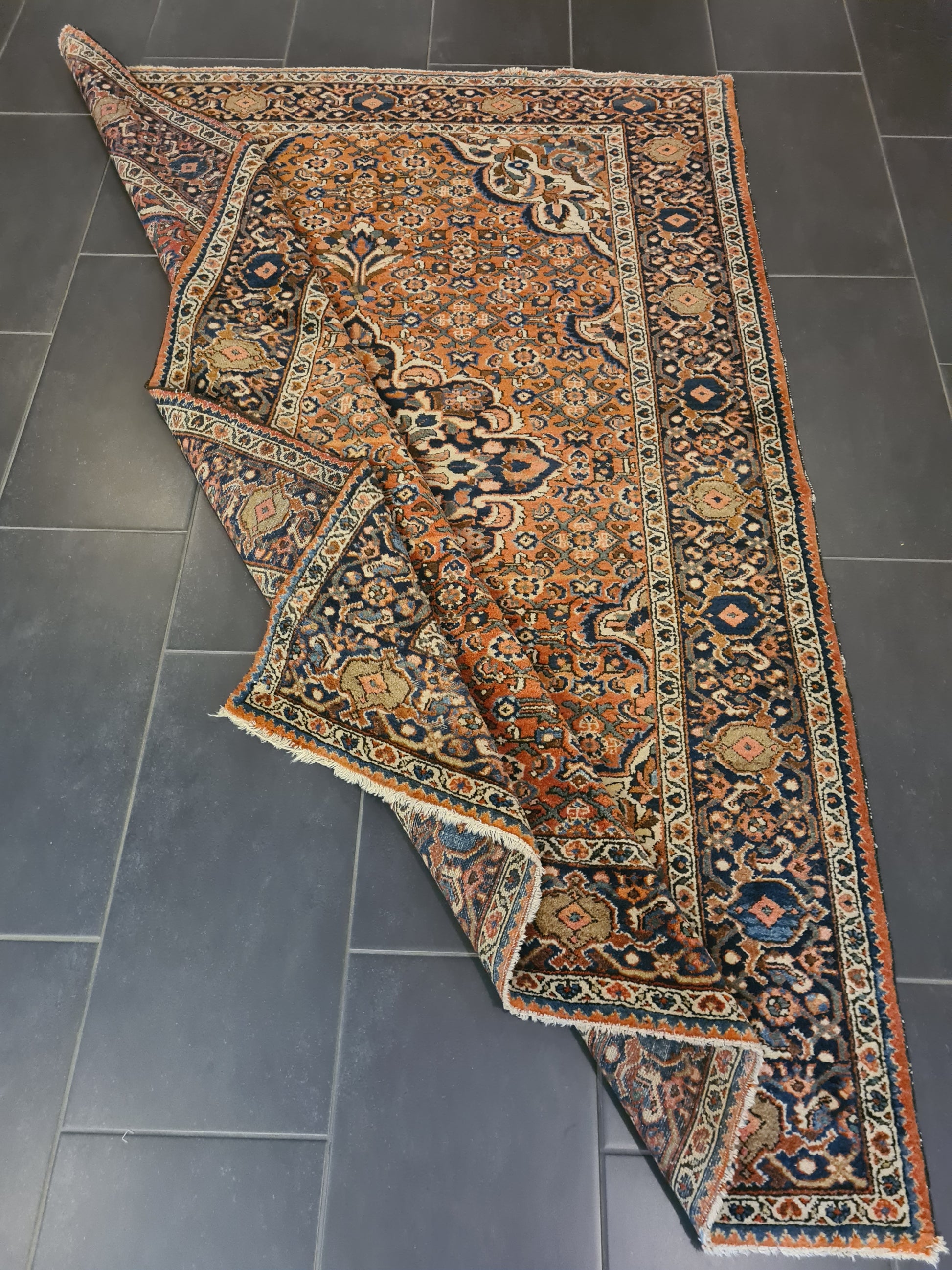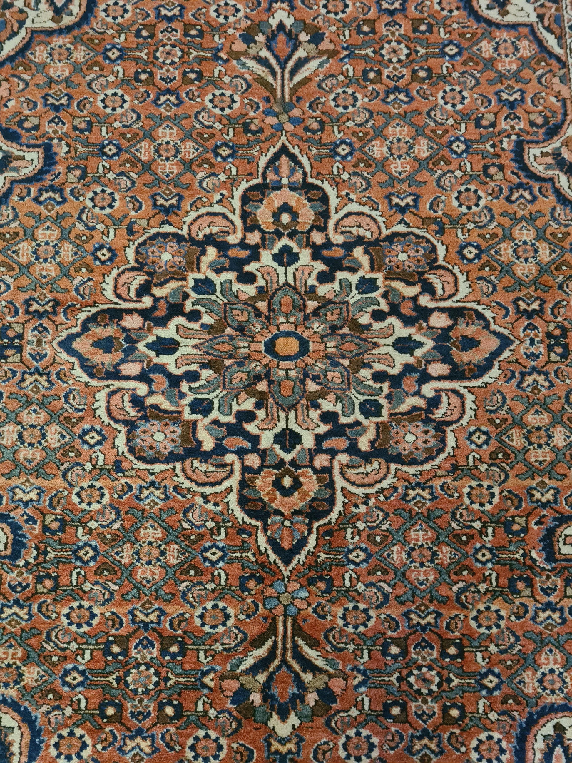 • Muster: Klassisches Isfahan-Ornament mit zentralem Medaillon und filigranen Rankenmotiven