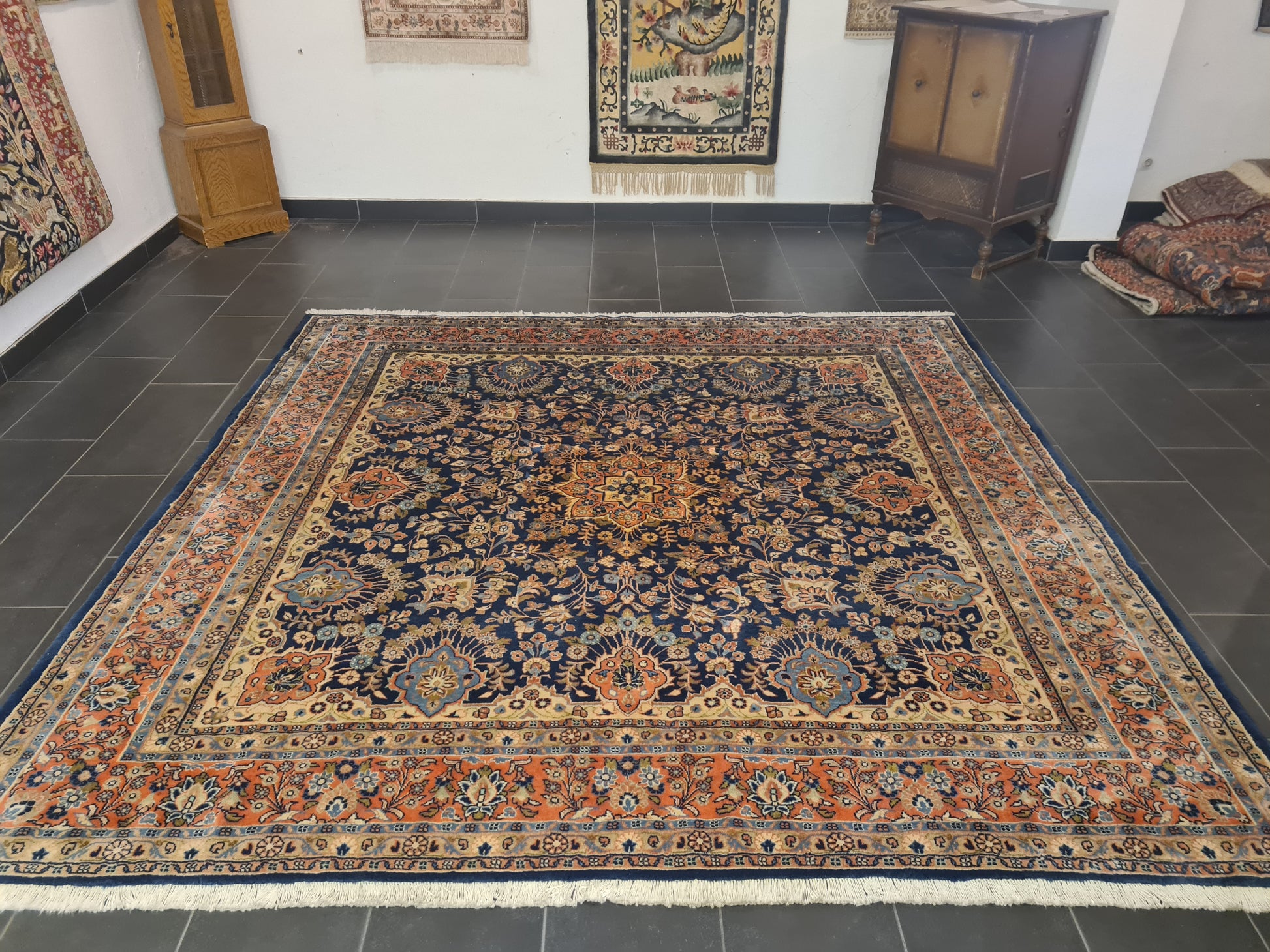 angeboten wird ein edler, handgeknüpfter Perserteppich aus der traditionsreichen Knüpfregion Sarough. Dieser Orientteppich besticht durch seine außergewöhnliche quadratische Form (270×270 cm) und seine detailreiche Knüpfkunst.