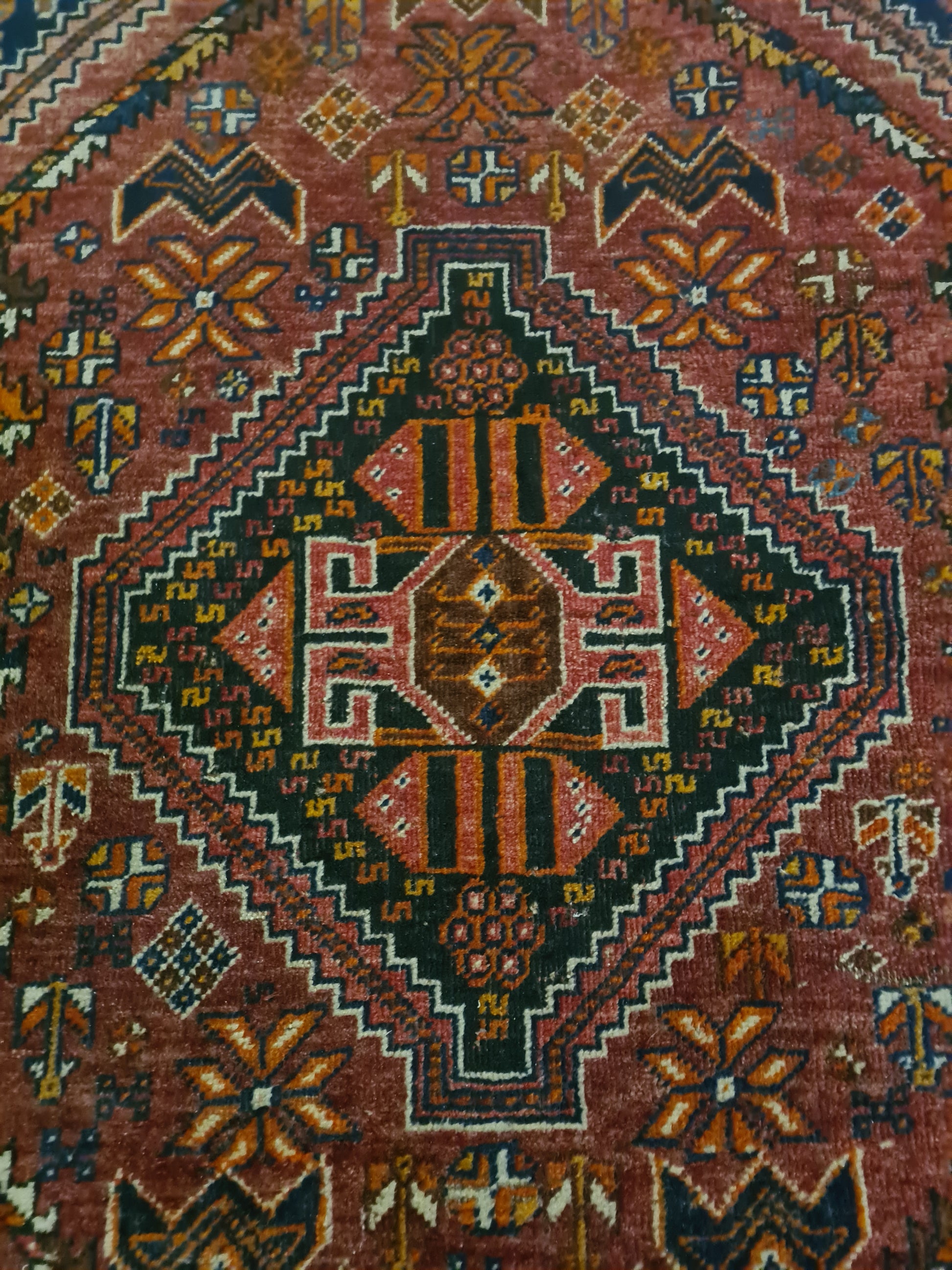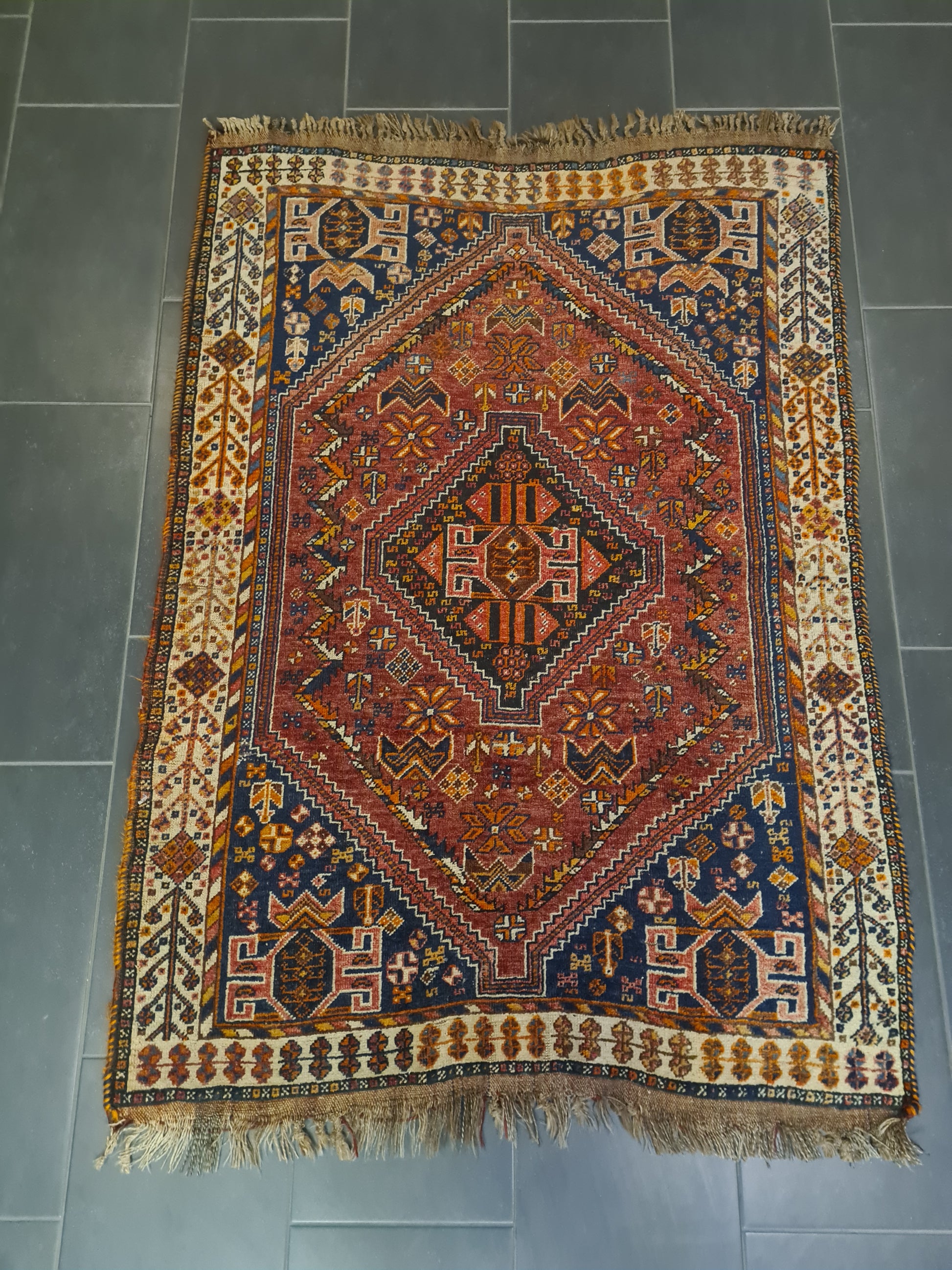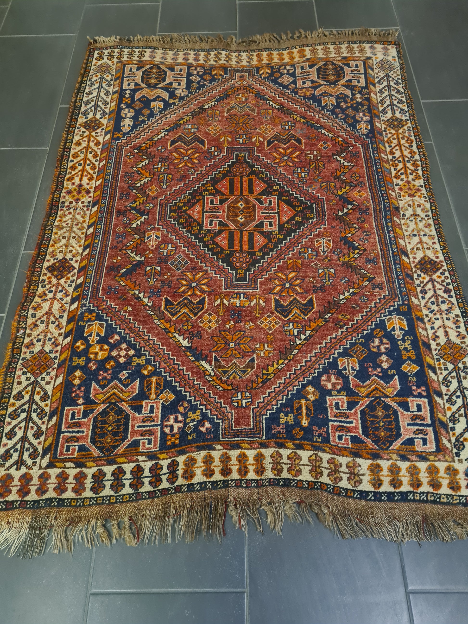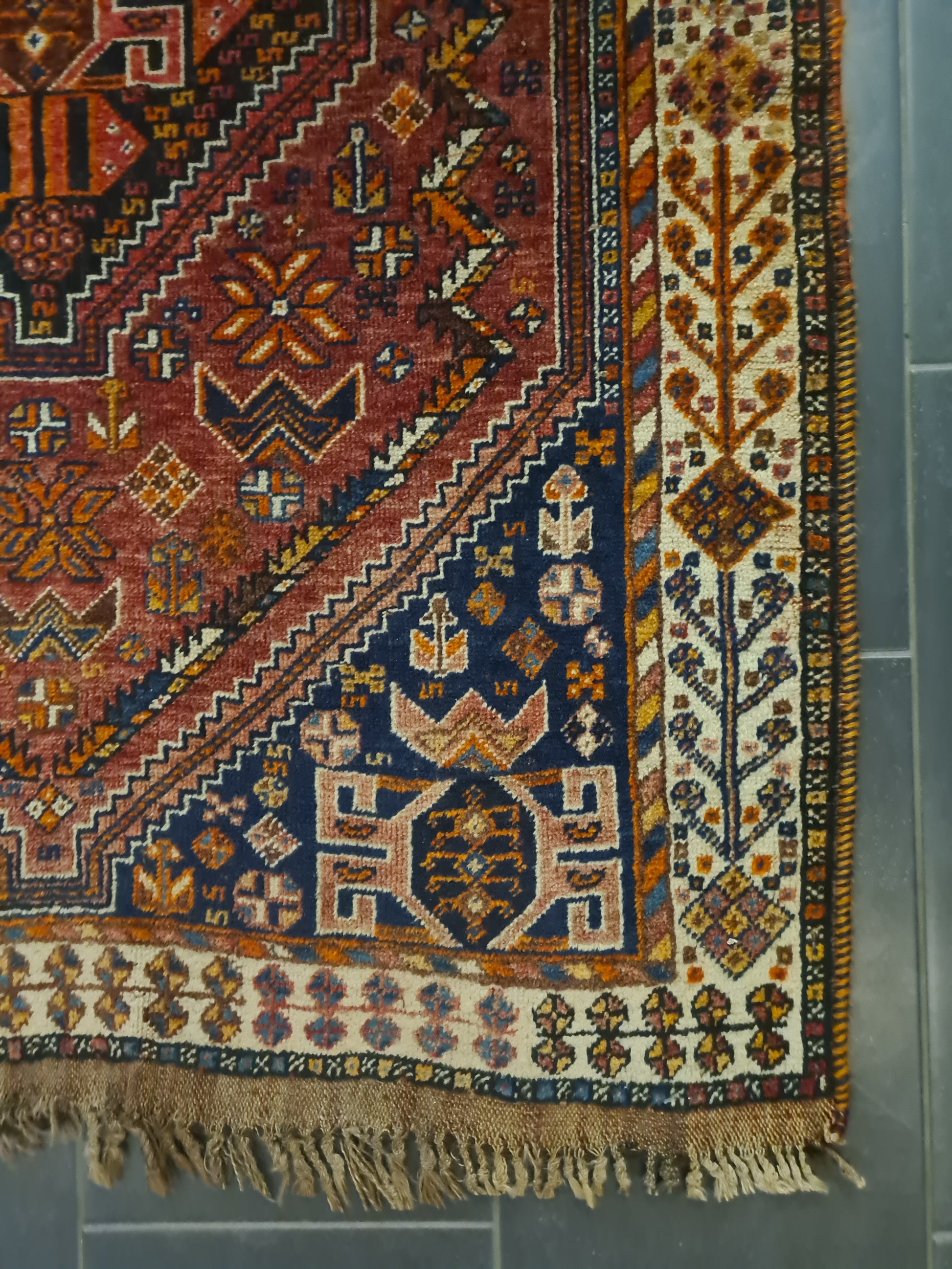 zum Verkauf steht ein handgeknüpfter Perserteppich aus der Region Shiraz. Dieser Orientteppich überzeugt durch seine traditionelle Knüpfkunst, detailreiche Musterung und harmonische Farbgebung.
