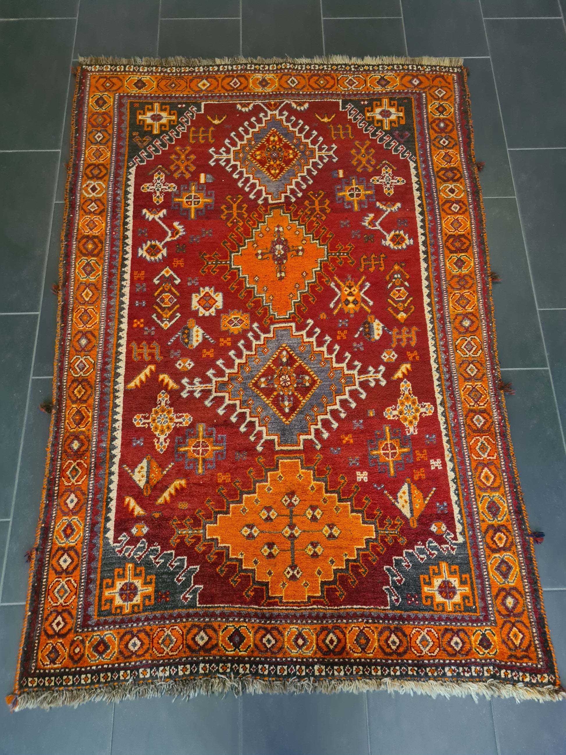 zum Verkauf steht ein handgeknüpfter Perserteppich aus Shiraz. Dieser hochwertige Orientteppich besticht durch seine traditionelle Knüpfkunst, kräftige Farben und detailreiche Musterung.