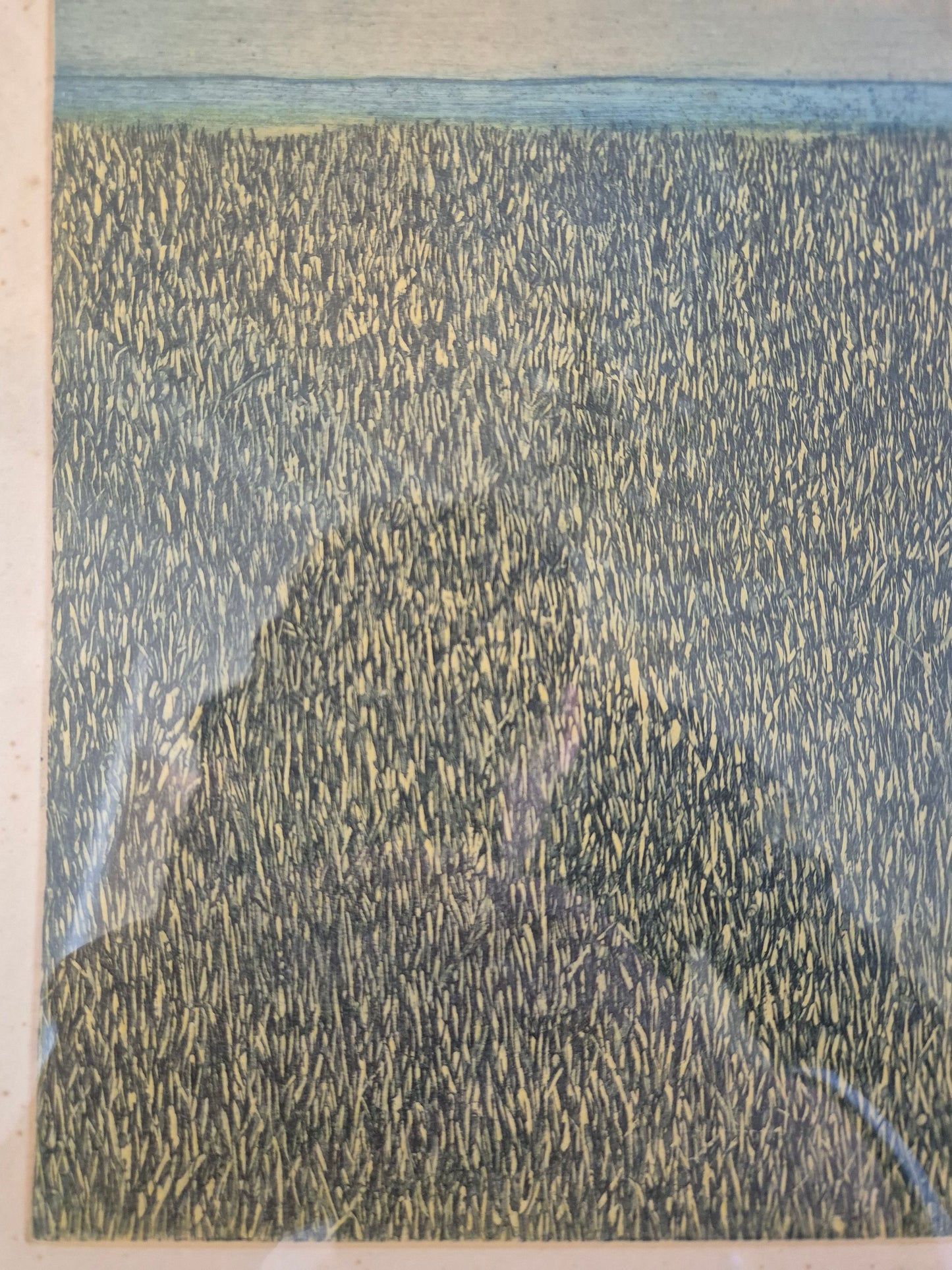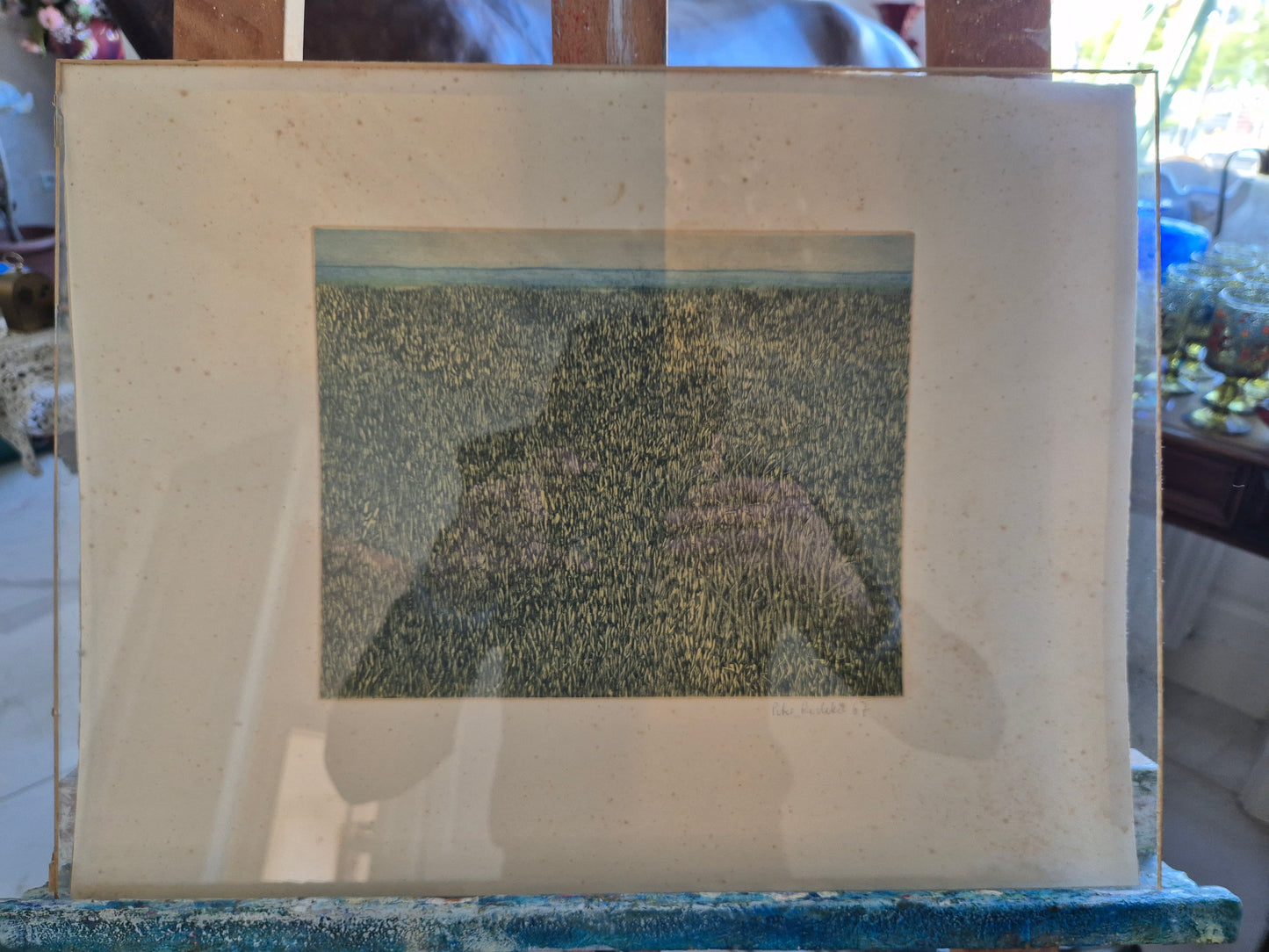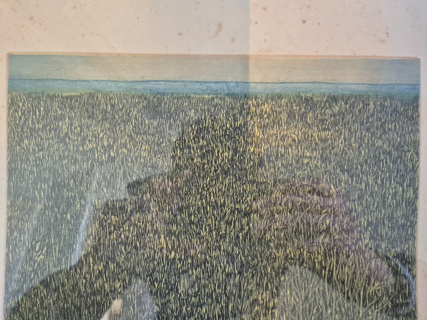 Diese Farbradierung von Peter Redeker fängt die friedliche Weite eines gelben Feldes ein, das in sanften Farben und mit klarer Struktur dargestellt ist. Ein ideales Kunstwerk für Liebhaber der Natur und der abstrakten Landschaftsdarstellungen.