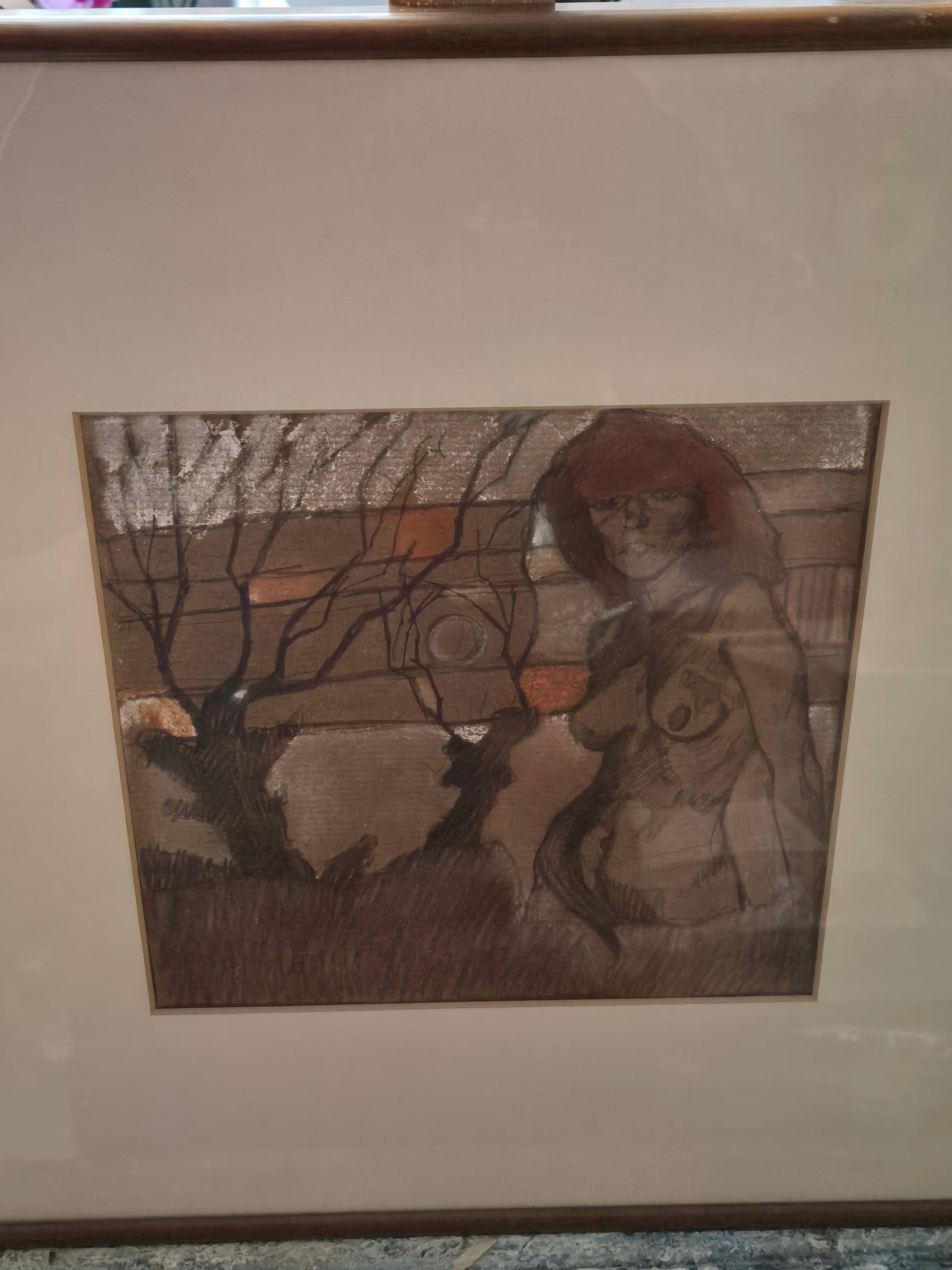 Motiv: Darstellung einer unbekleideten Frau neben kahlen Bäumen, in erdigen Braun- und Rottönen gehalten