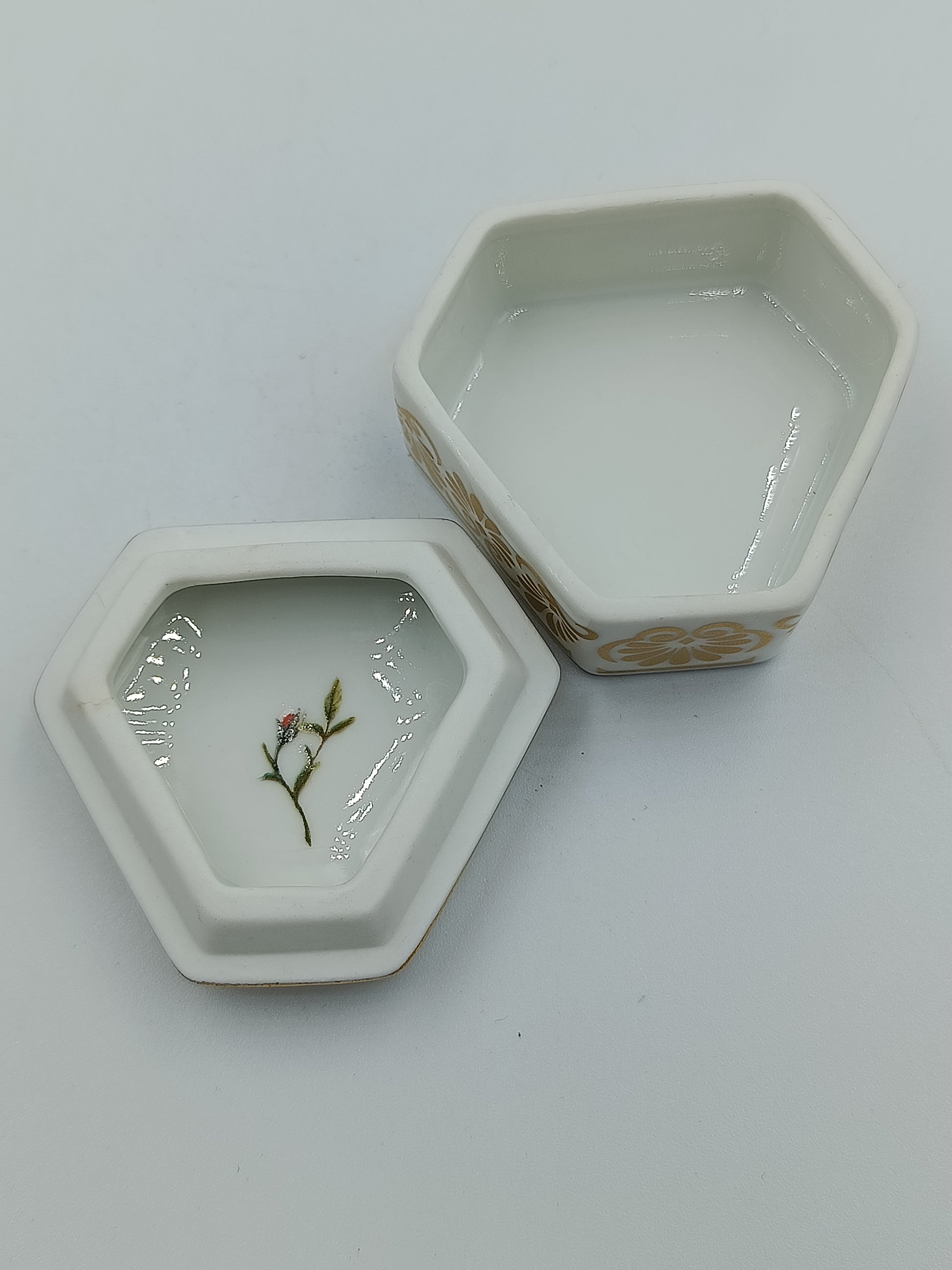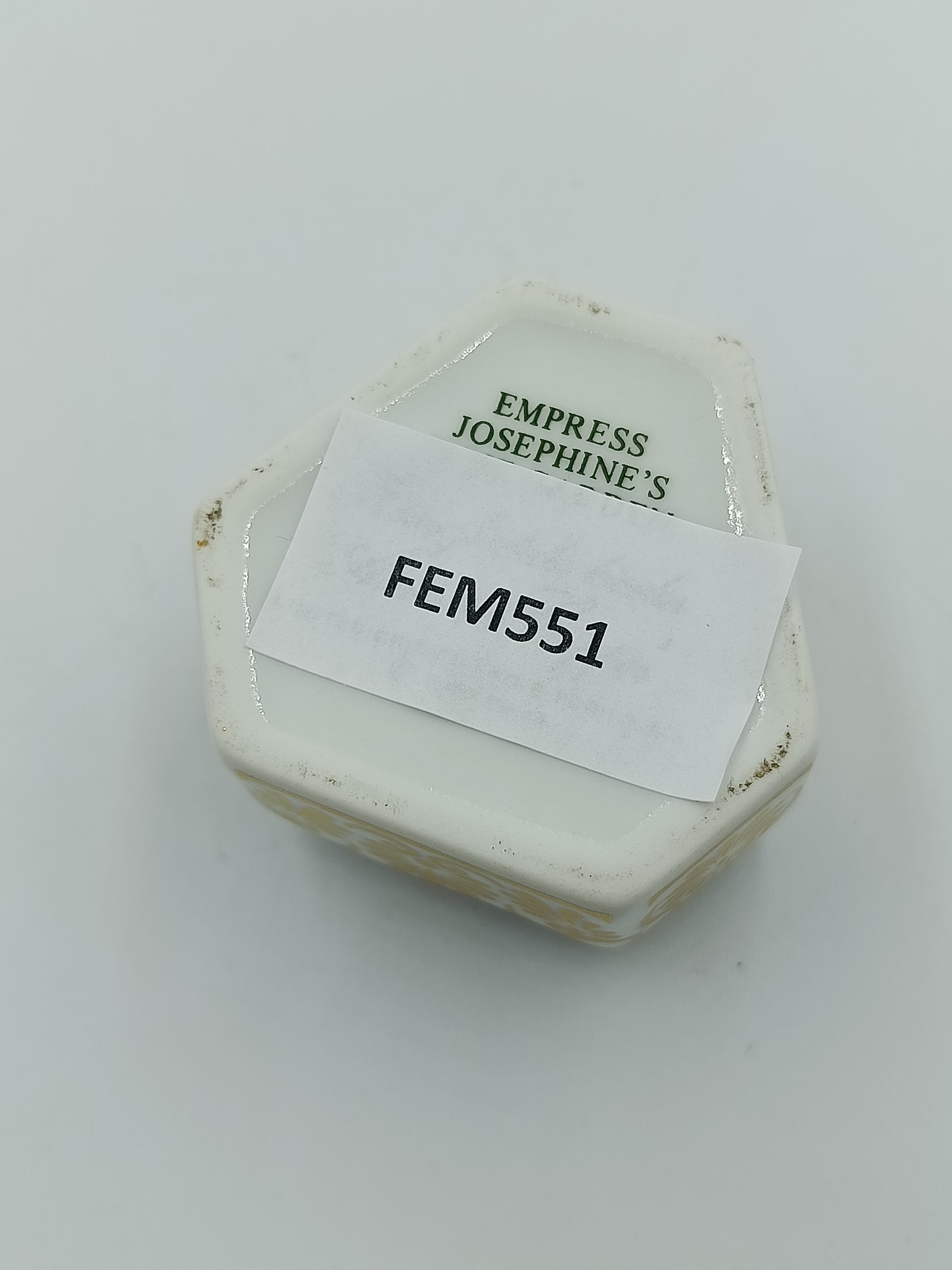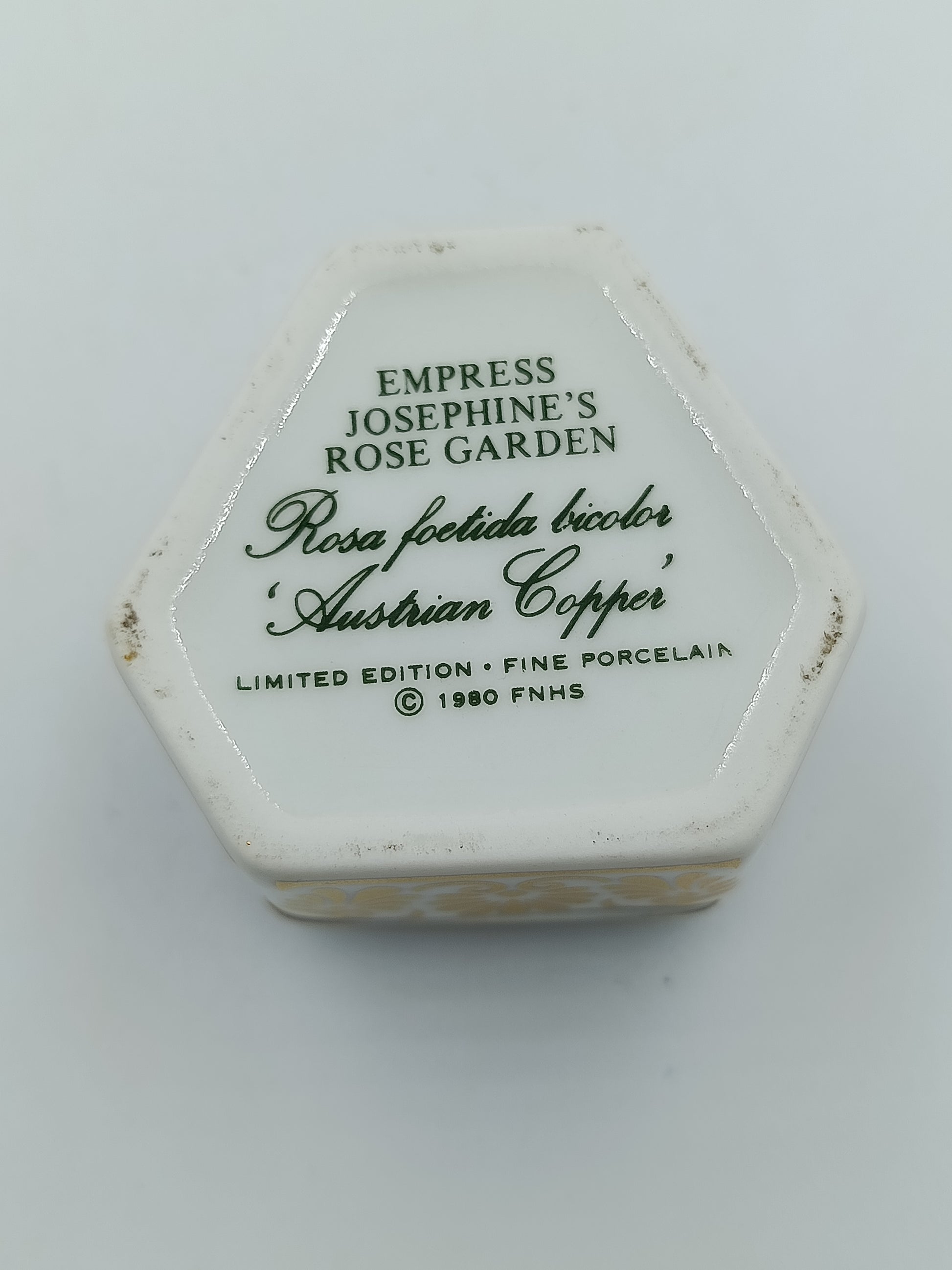 Diese sechseckige Porzellanschatulle aus der limitierten Serie Empress Josephine’s Rose Garden zeigt ein filigranes Blumenmotiv der Rosa foetida bicolor ‘Austrian Copper’. Das goldverzierte Dekor unterstreicht den edlen Charakter dieser kleinen Dose und macht sie zu einem stilvollen Sammlerstück oder Aufbewahrungsort für Schmuck und kleine Kostbarkeiten.