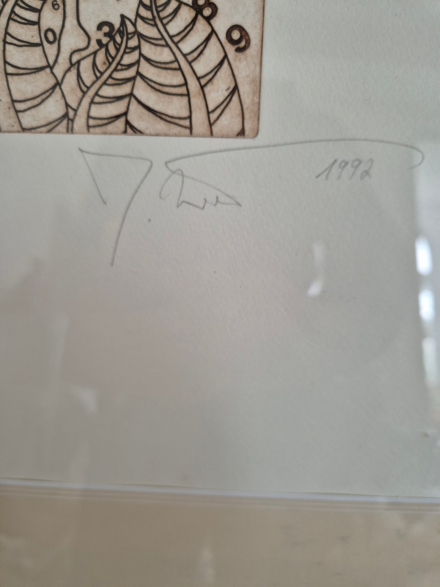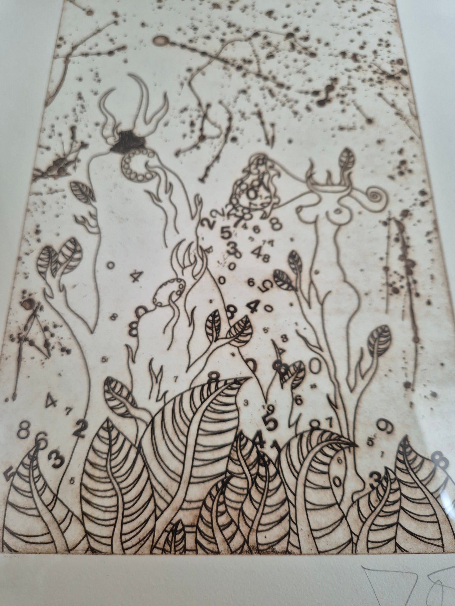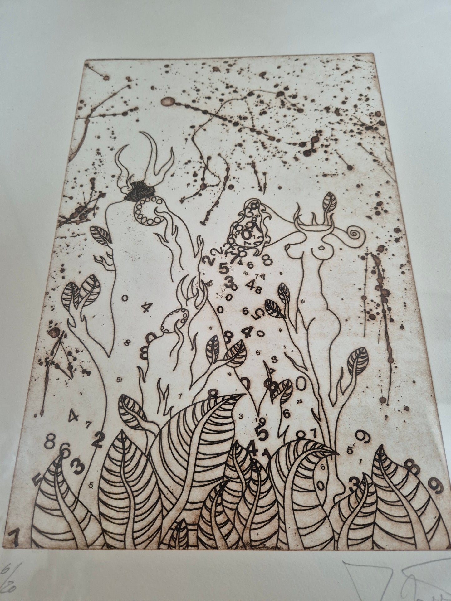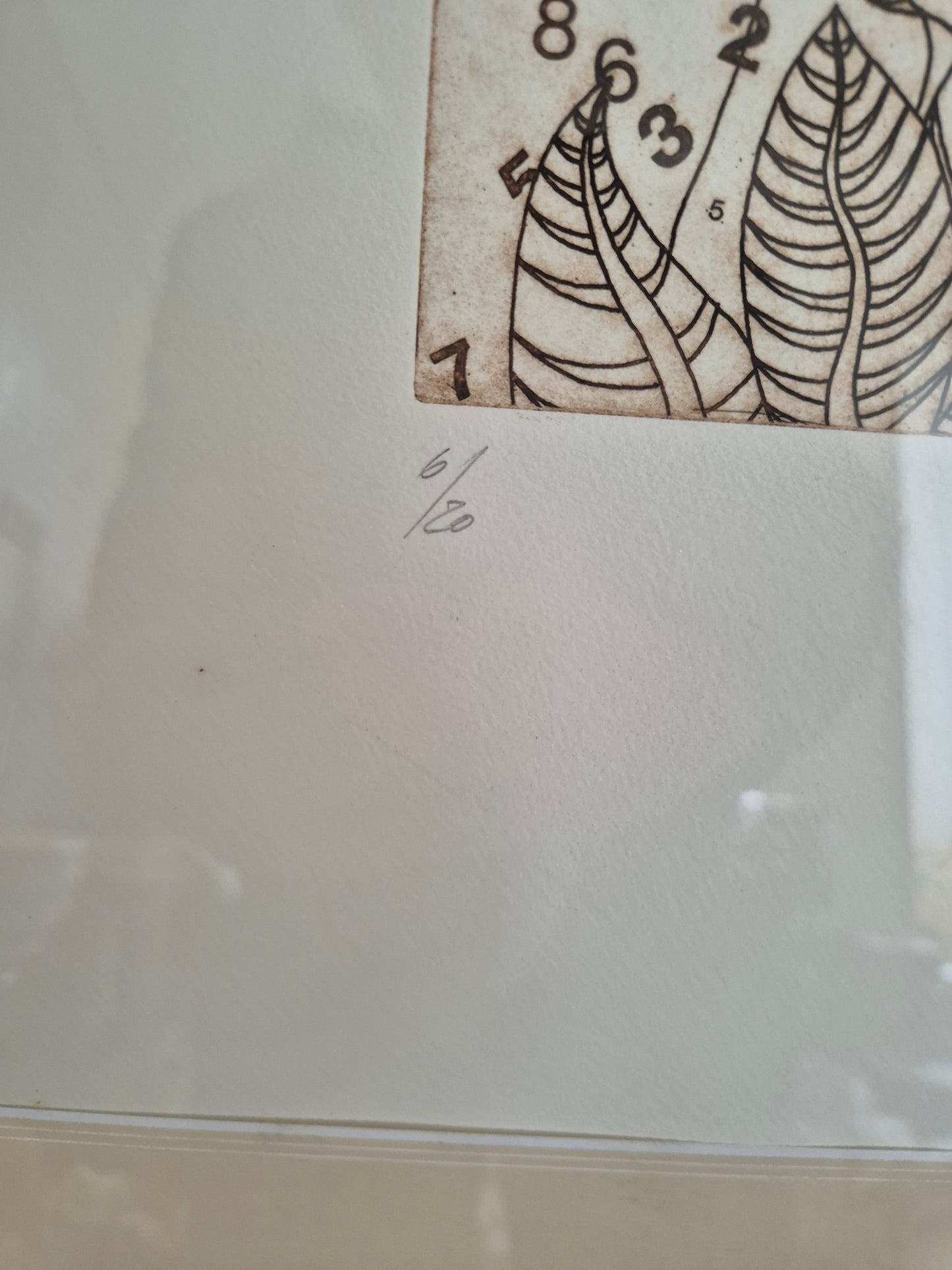 Motiv: Diese beeindruckende Radierung aus dem Jahr 1992 zeigt eine abstrakte Darstellung, bei der Zahlen und Blätter am unteren Rand zu sehen sind. Der weibliche Akt wird in einer stilisierten Form dargestellt und harmoniert perfekt mit den geometrischen Elementen im Bild. Die Kombination aus organischen Formen und grafischen Mustern verleiht dem Werk eine interessante Tiefe und Spannung.