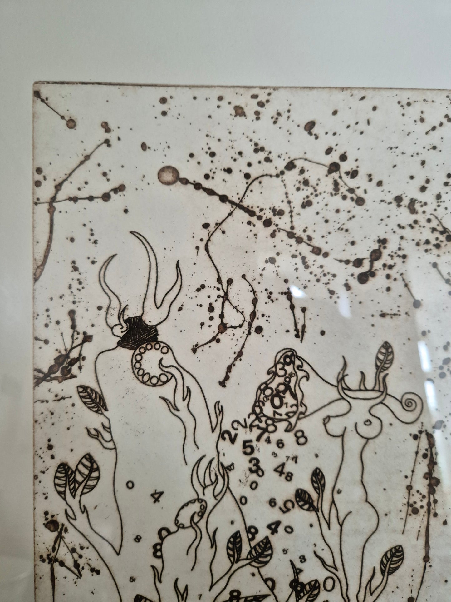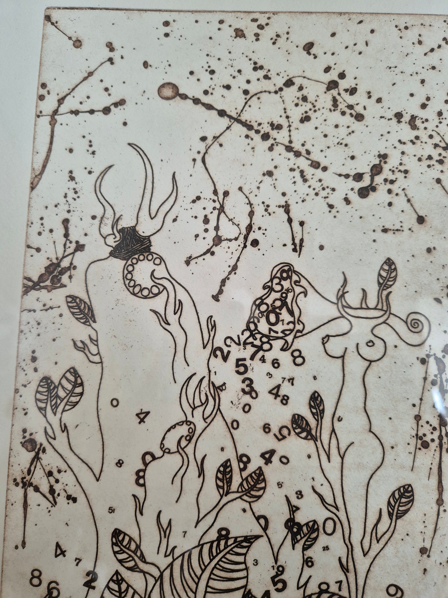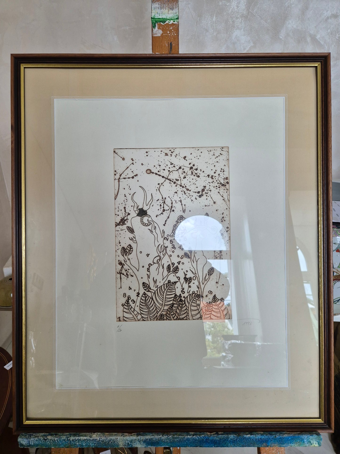 Motiv: Diese beeindruckende Radierung aus dem Jahr 1992 zeigt eine abstrakte Darstellung, bei der Zahlen und Blätter am unteren Rand zu sehen sind. Der weibliche Akt wird in einer stilisierten Form dargestellt und harmoniert perfekt mit den geometrischen Elementen im Bild. Die Kombination aus organischen Formen und grafischen Mustern verleiht dem Werk eine interessante Tiefe und Spannung.