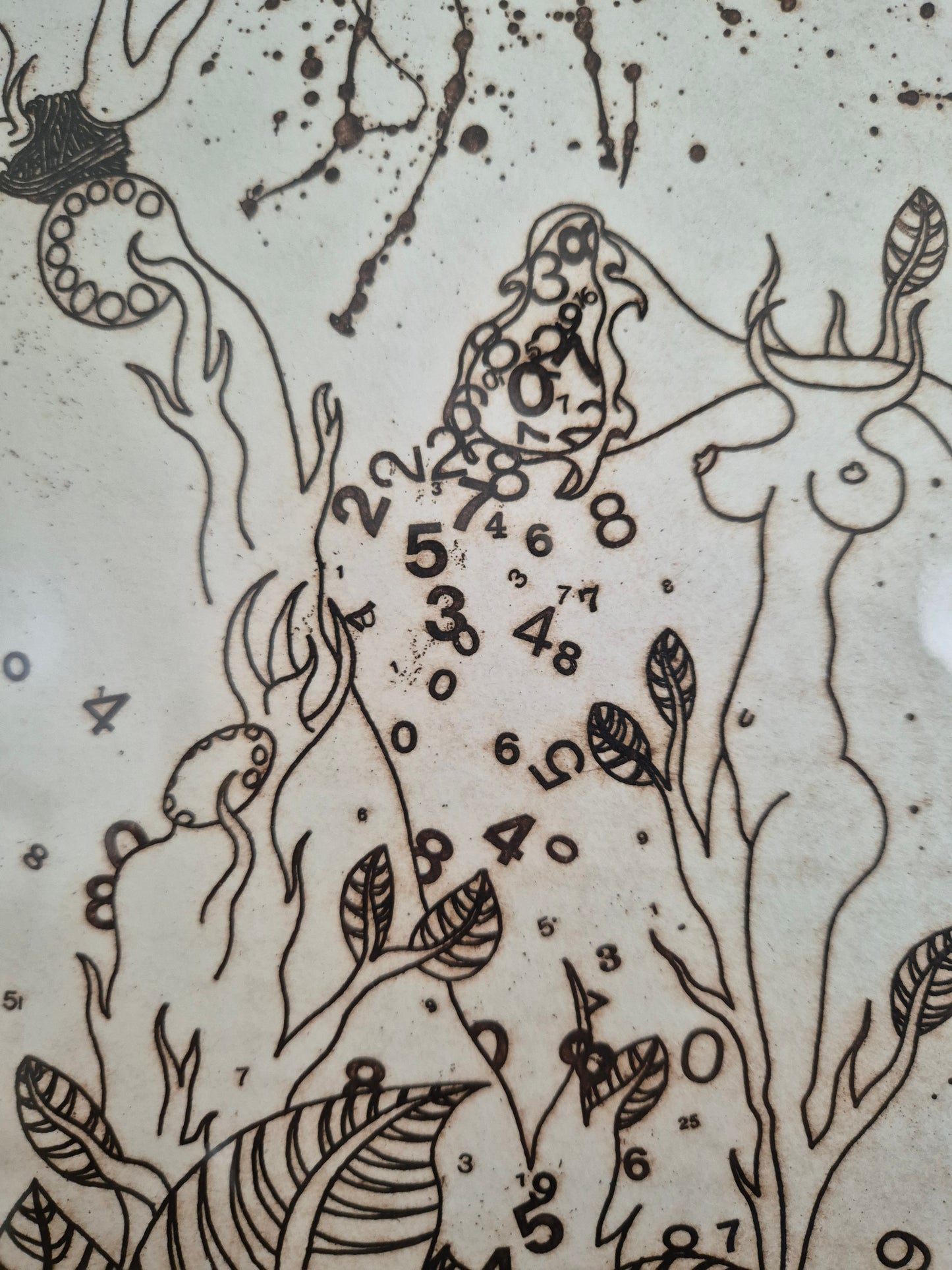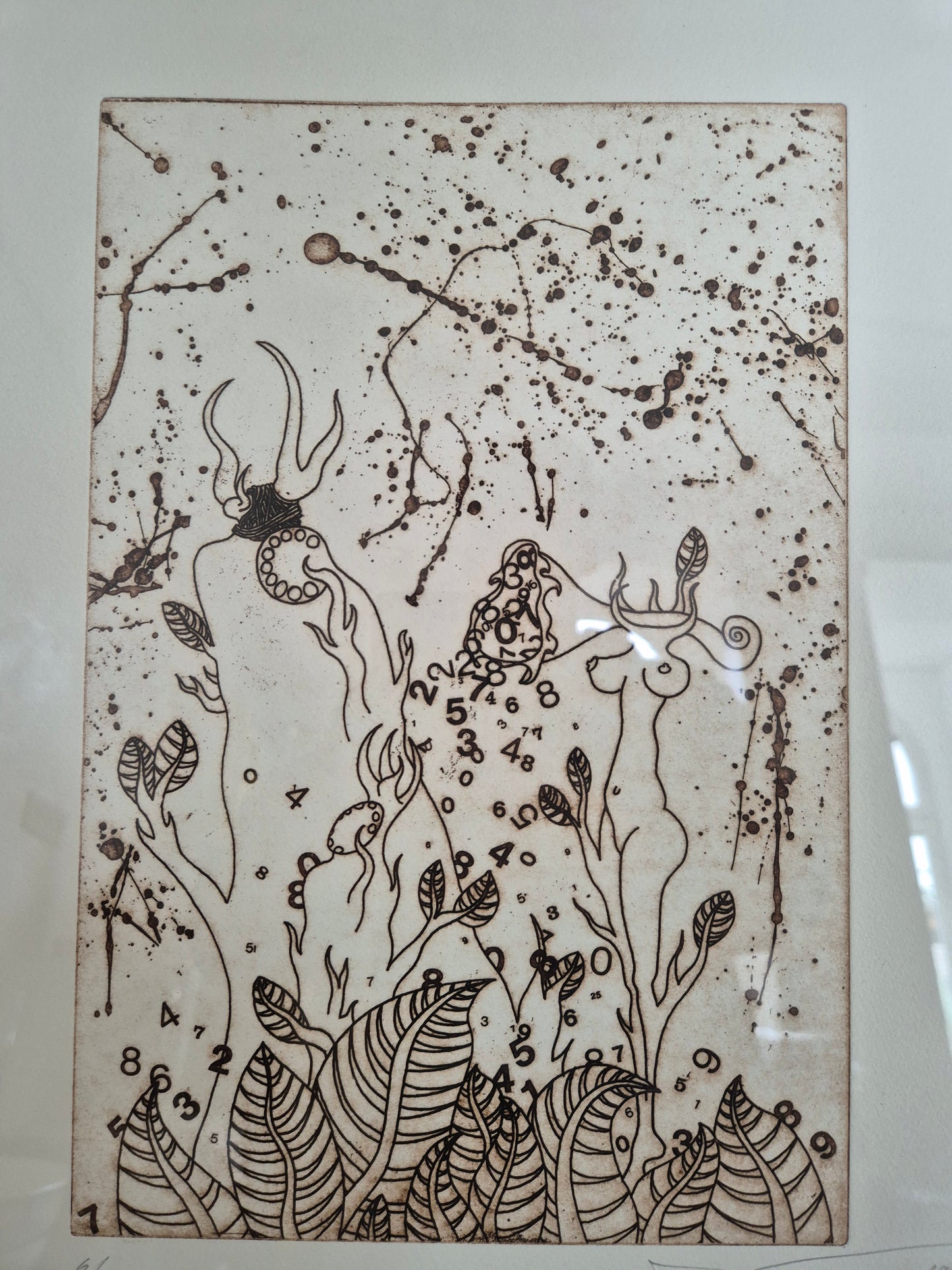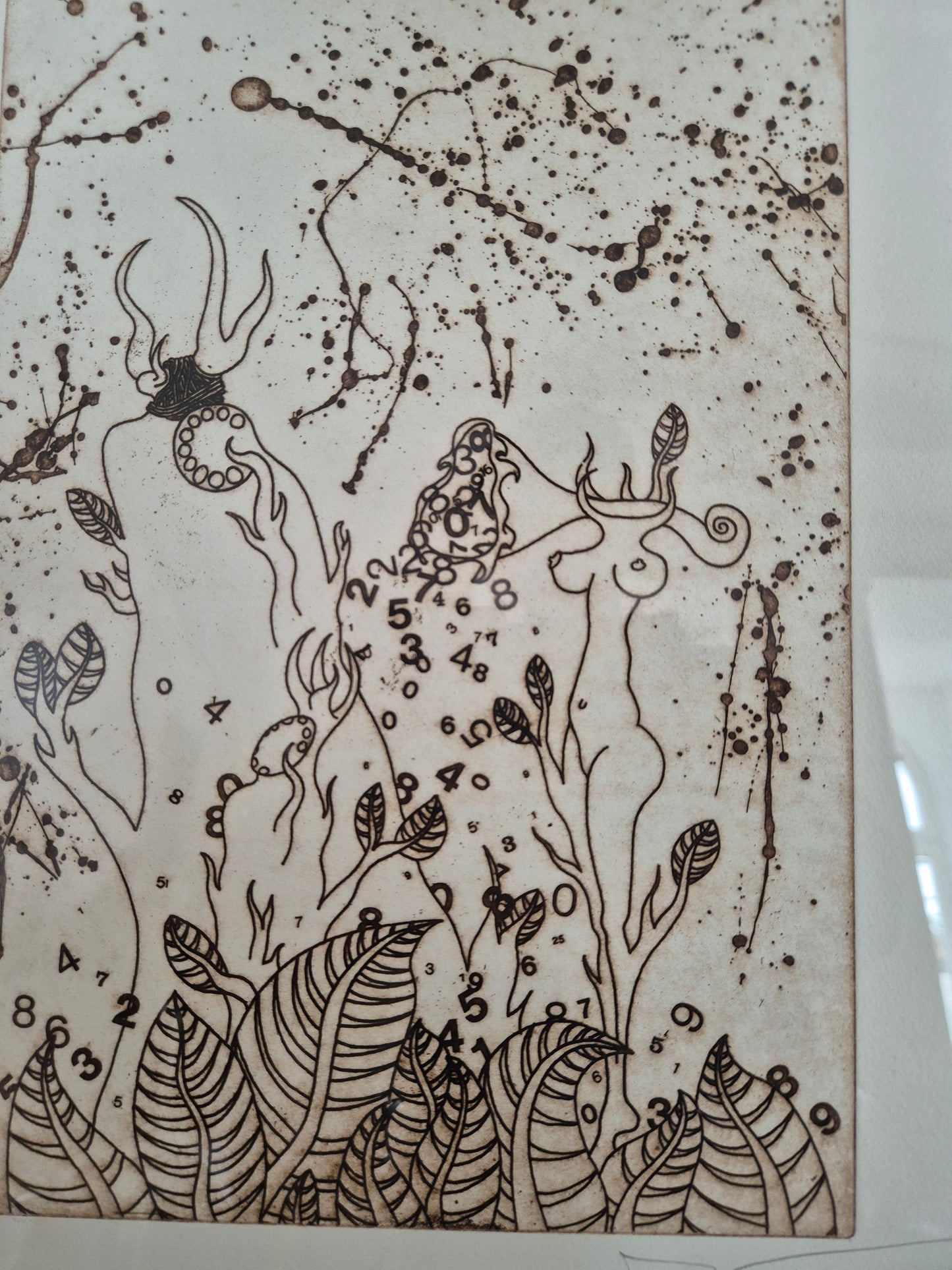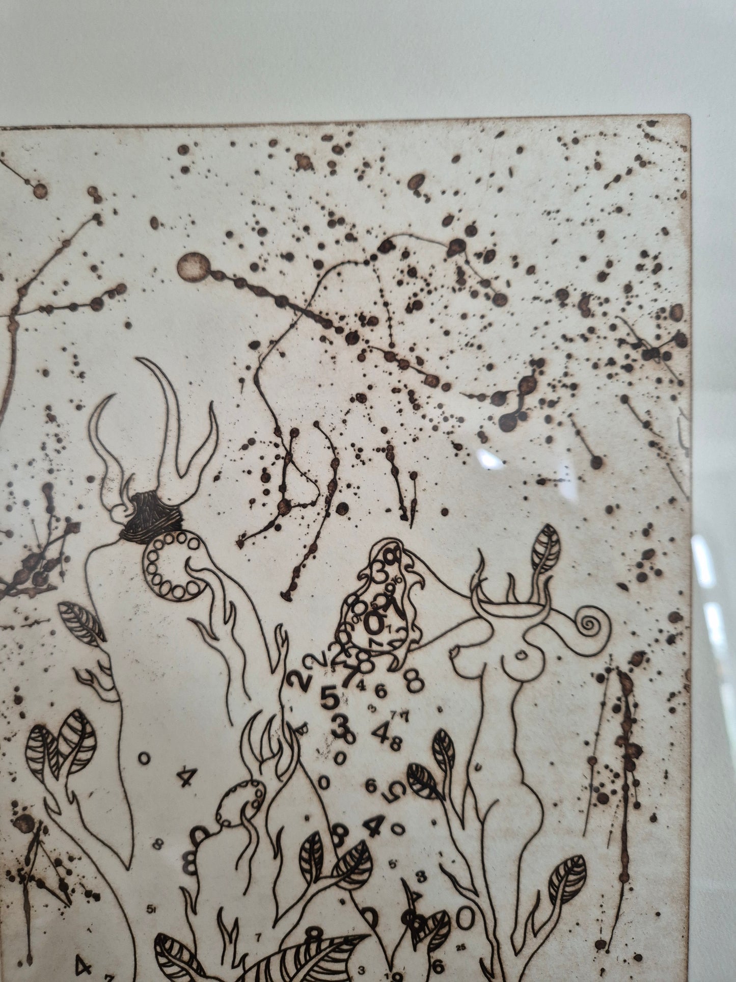 Motiv: Diese beeindruckende Radierung aus dem Jahr 1992 zeigt eine abstrakte Darstellung, bei der Zahlen und Blätter am unteren Rand zu sehen sind. Der weibliche Akt wird in einer stilisierten Form dargestellt und harmoniert perfekt mit den geometrischen Elementen im Bild. Die Kombination aus organischen Formen und grafischen Mustern verleiht dem Werk eine interessante Tiefe und Spannung.