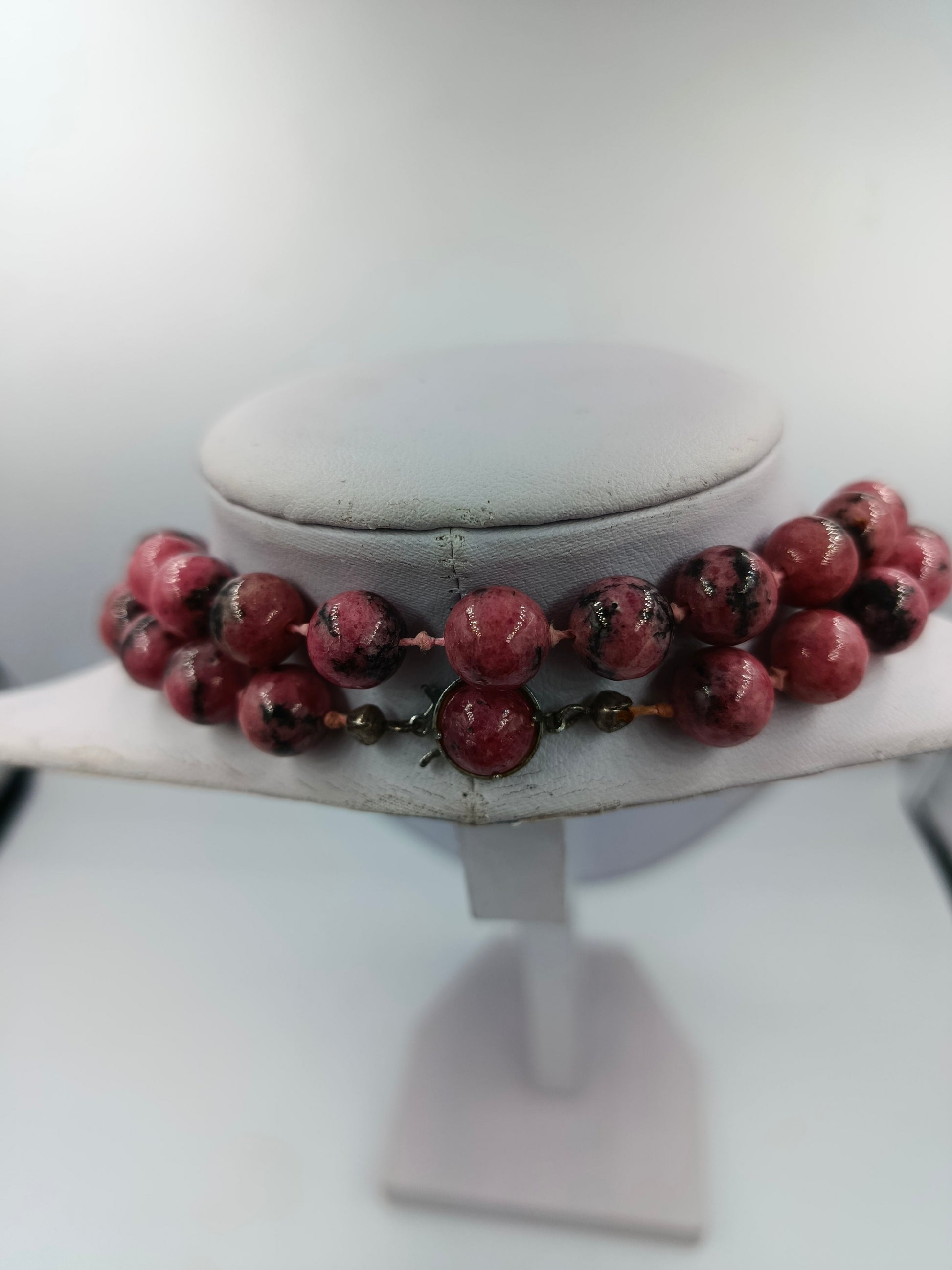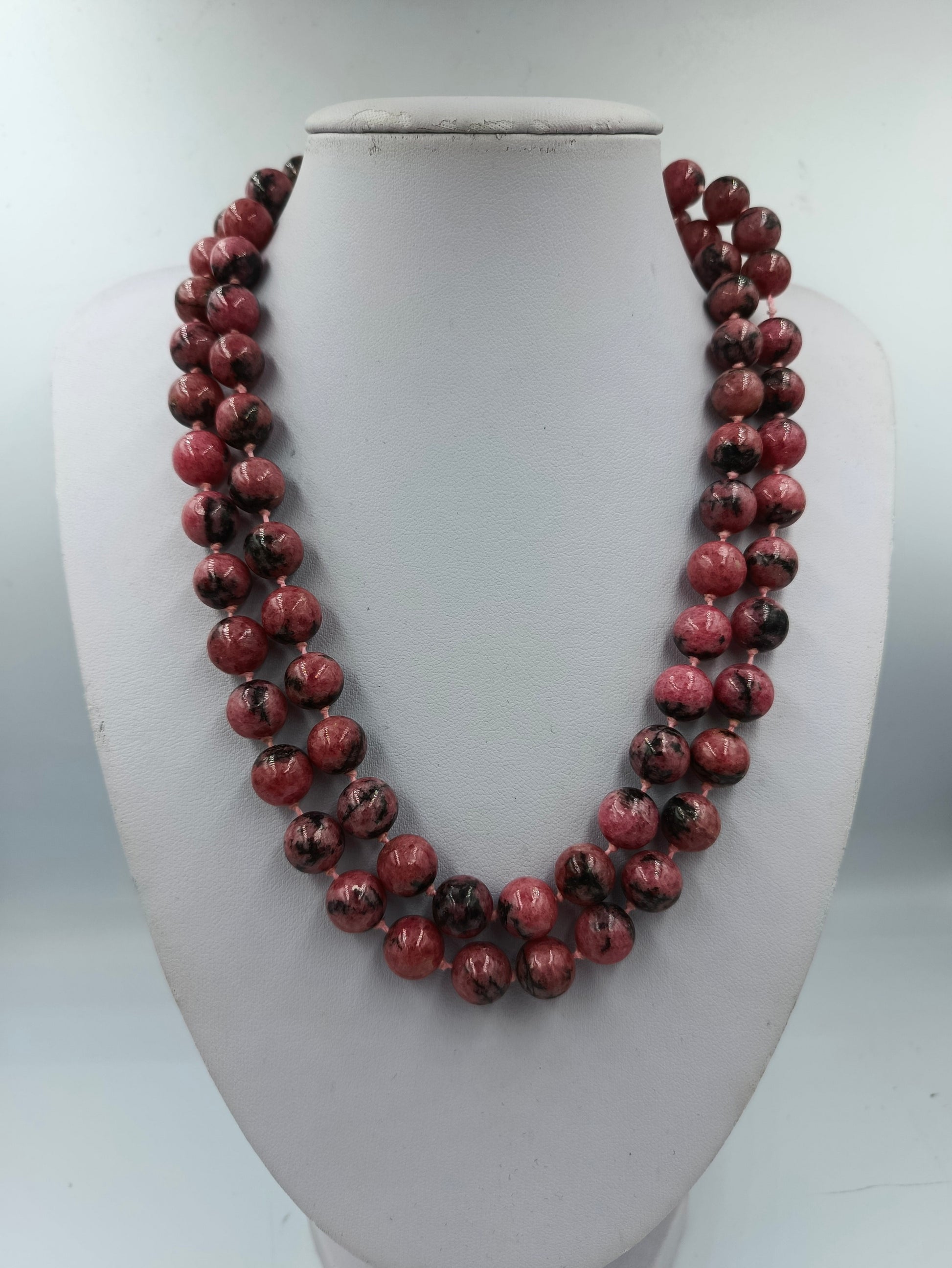 Elegante Rhodonit Edelstein Kette in kräftigem Rosa mit schwarzen Einschlüssen. Die Kugelperlen sind doppelt geknüpft und sorgfältig gearbeitet. Der hochwertige 835er Silberverschluss sorgt für sicheren Halt und rundet das edle Design harmonisch ab. Ein klassisches Schmuckstück mit natürlicher Ausstrahlung.