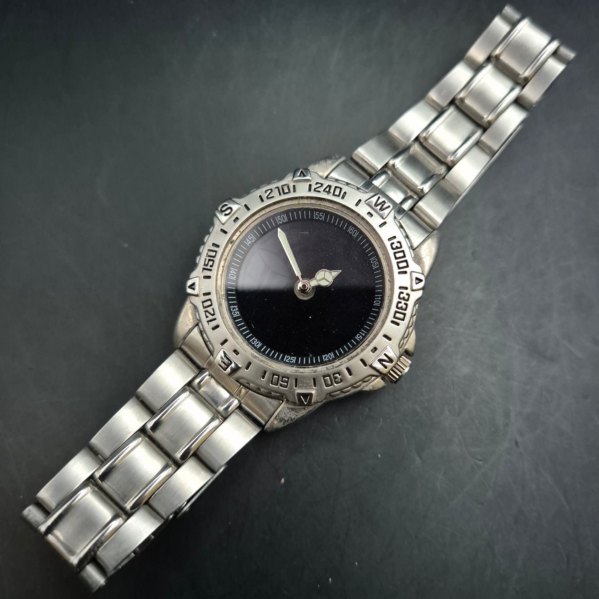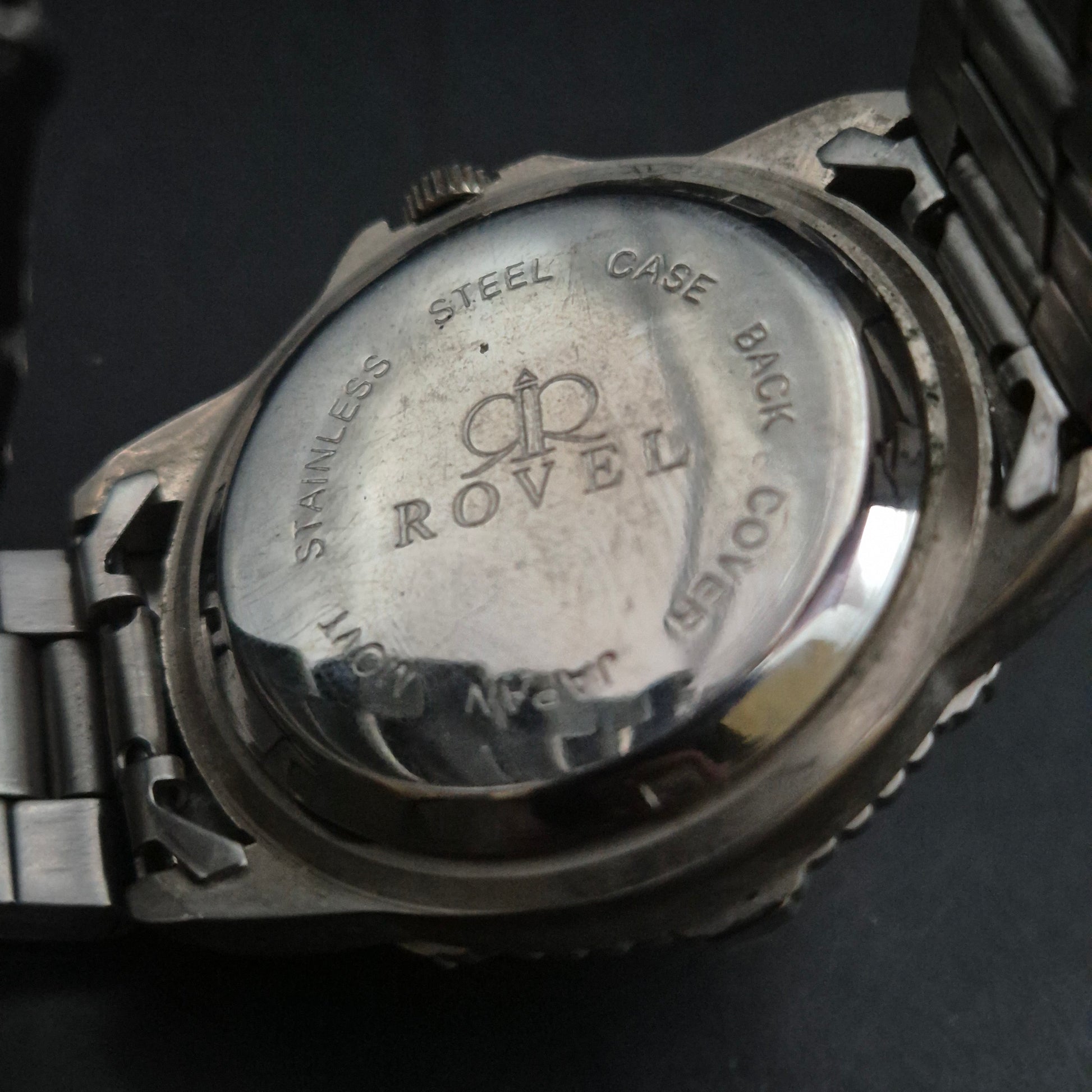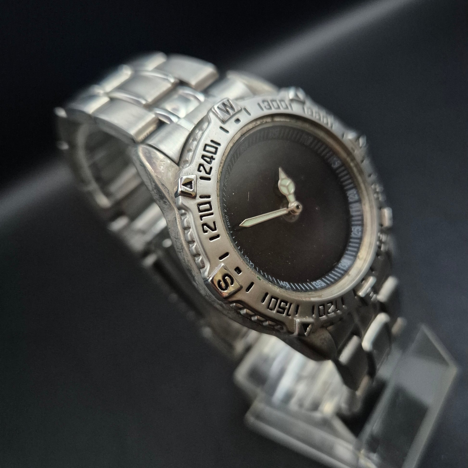 Diese Rovel Herren Uhr präsentiert sich in einem auffälligen, sportlichen Design mit einem robusten, silberfarbenen Metallgehäuse und passendem Gliederarmband. Das kontrastreiche schwarze Zifferblatt ist bewusst minimalistisch gehalten und wird von einer feststehenden, gravierten Lünette im Kompass-Stil (mit Himmelsrichtungen und Gradangaben) umgeben. Die Uhr wird von einem zuverlässigen Quarzwerk angetrieben, wie das "Japan Movt" auf dem gravierten Edelstahlboden bestätigt. Sie ist ein markantes Accessoire für alle, die einen robusten und funktional inspirierten Vintage-Look schätzen, sowohl im Alltag als auch in der Freizeit.