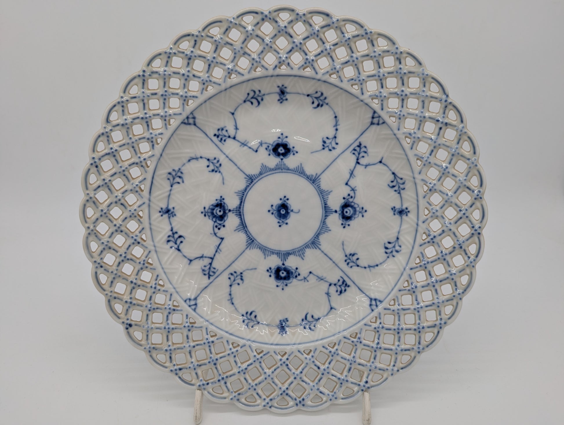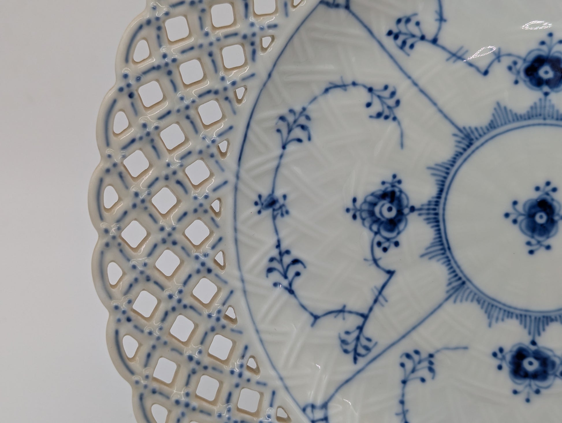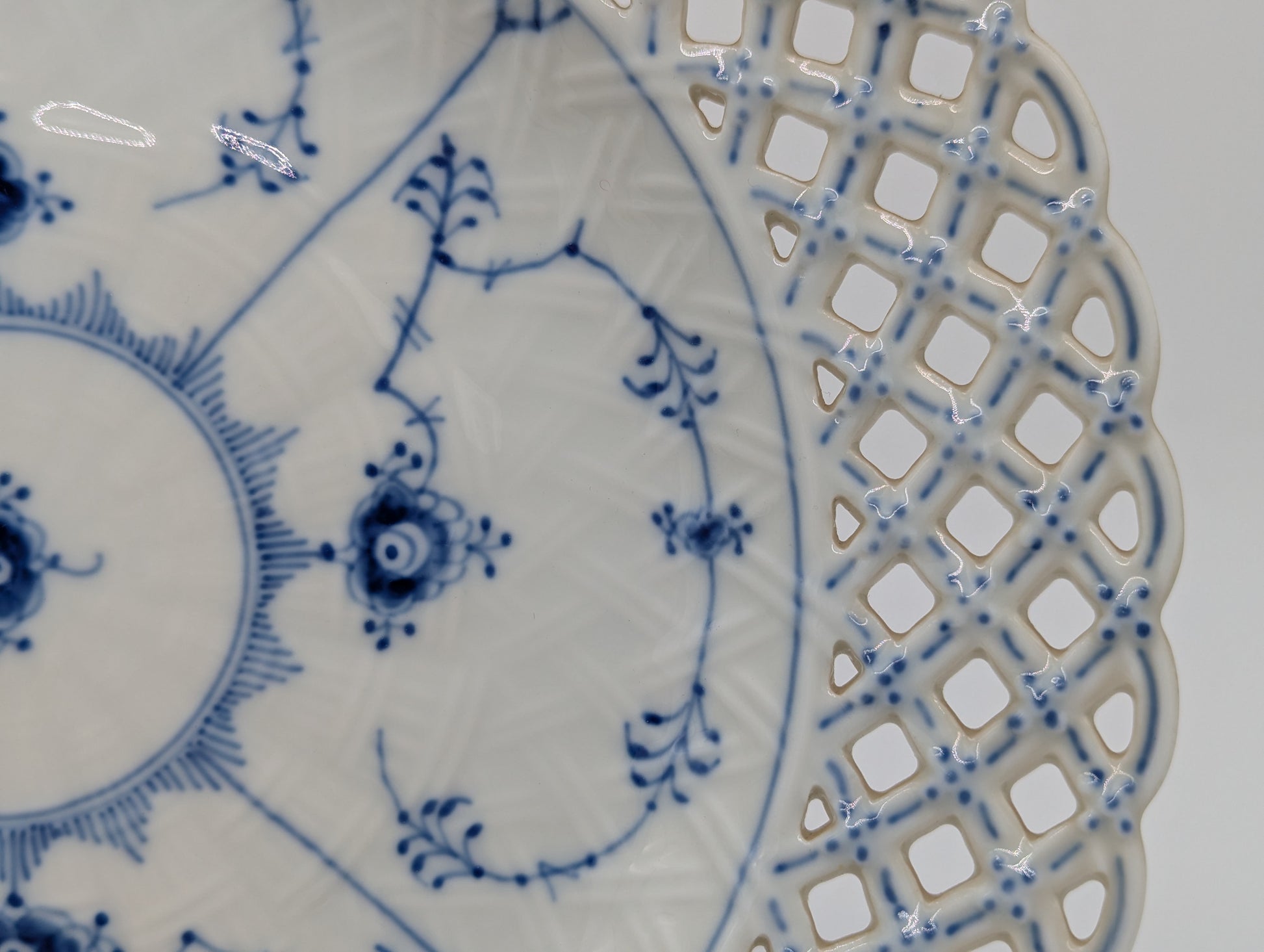 Wunderschöner Royal Copenhagen Porzellanteller im Dekor Musselmalet Vollspitze (Blue Fluted Full Lace), handbemalt in kräftigem Kobaltblau.