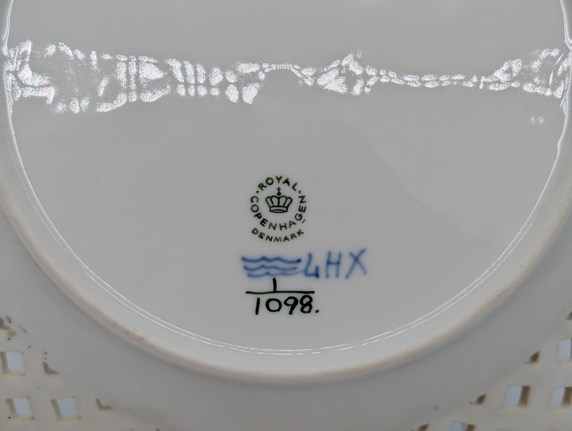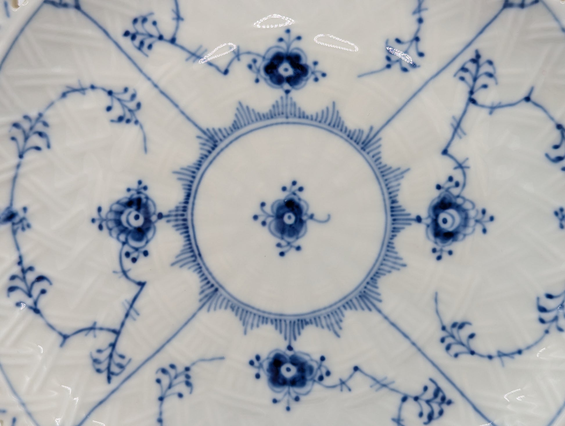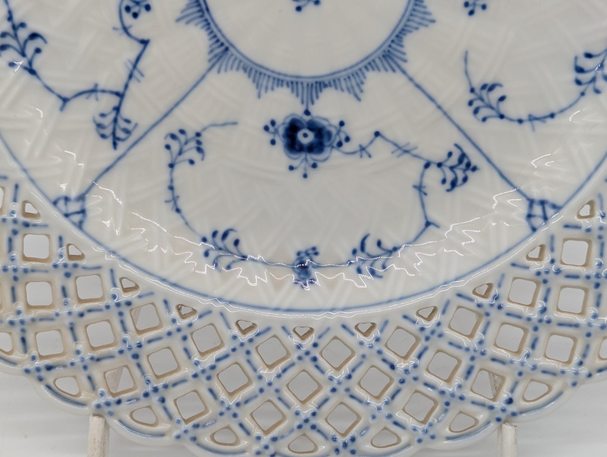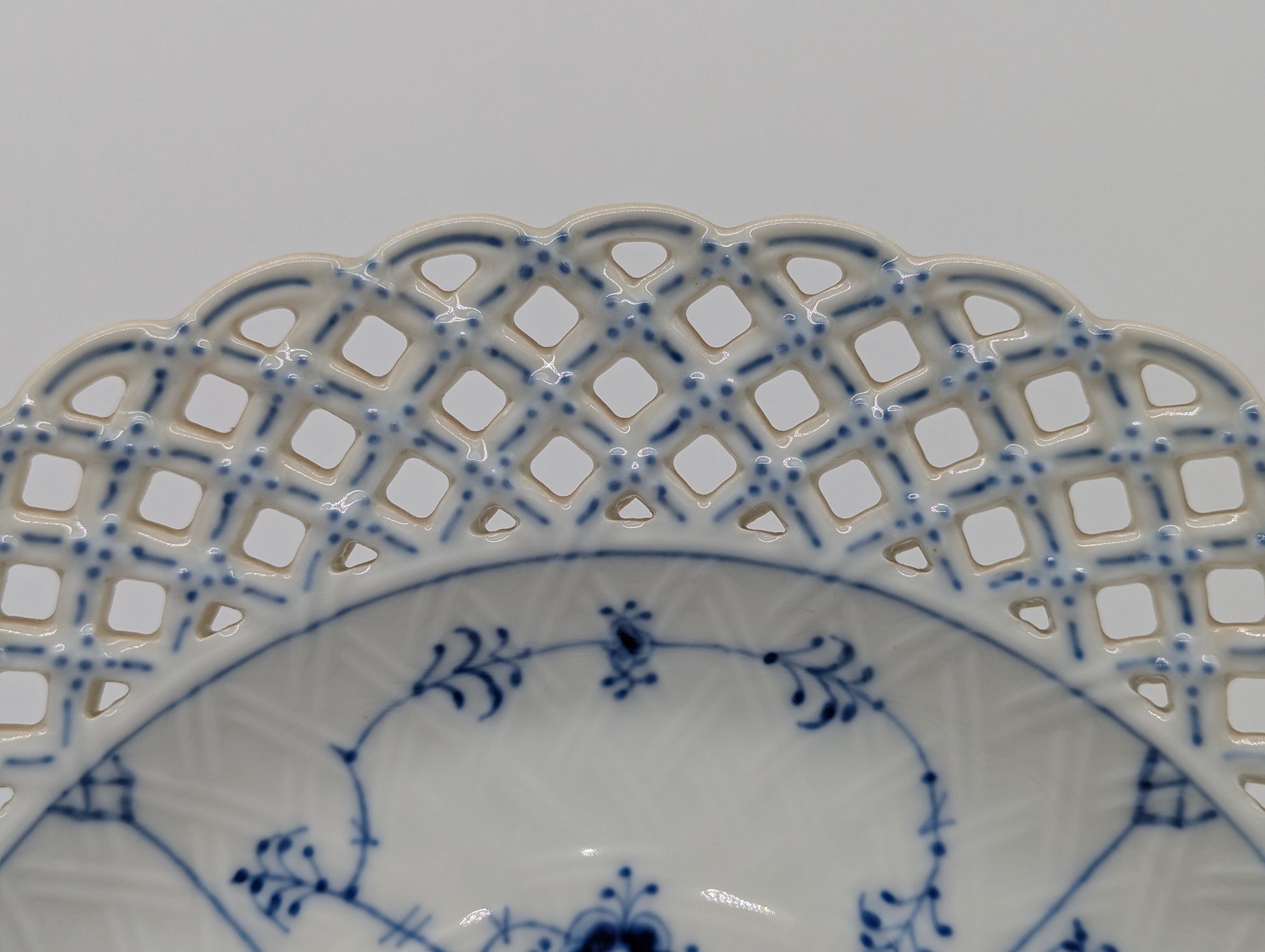 Wunderschöner Royal Copenhagen Porzellanteller im Dekor Musselmalet Vollspitze (Blue Fluted Full Lace), handbemalt in kräftigem Kobaltblau.