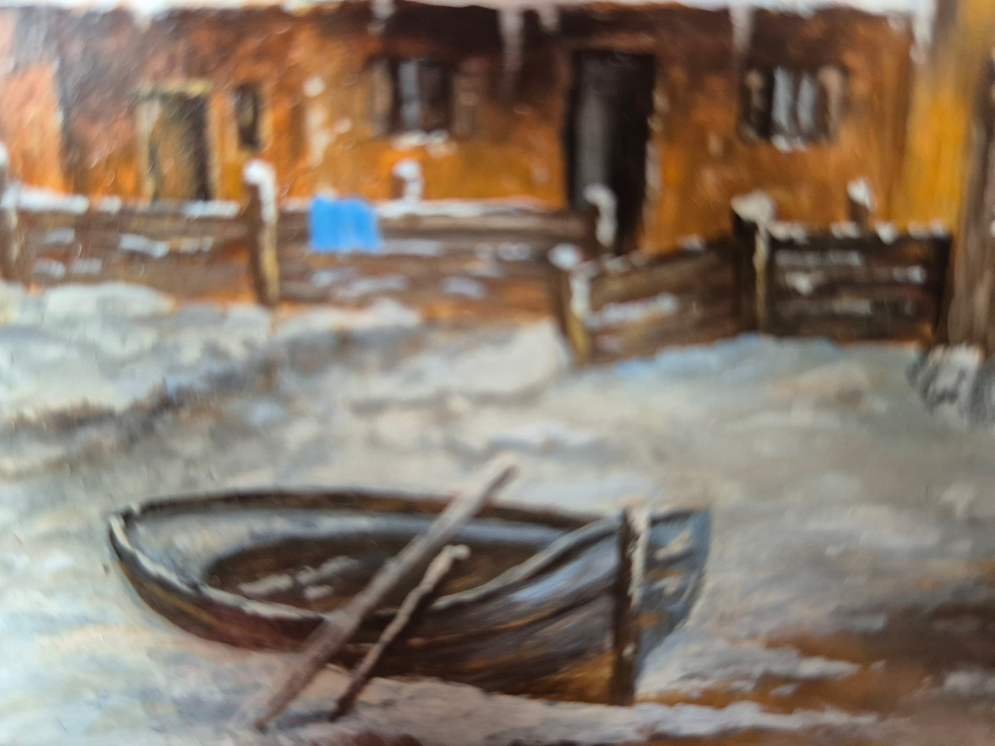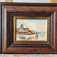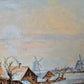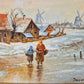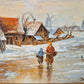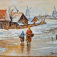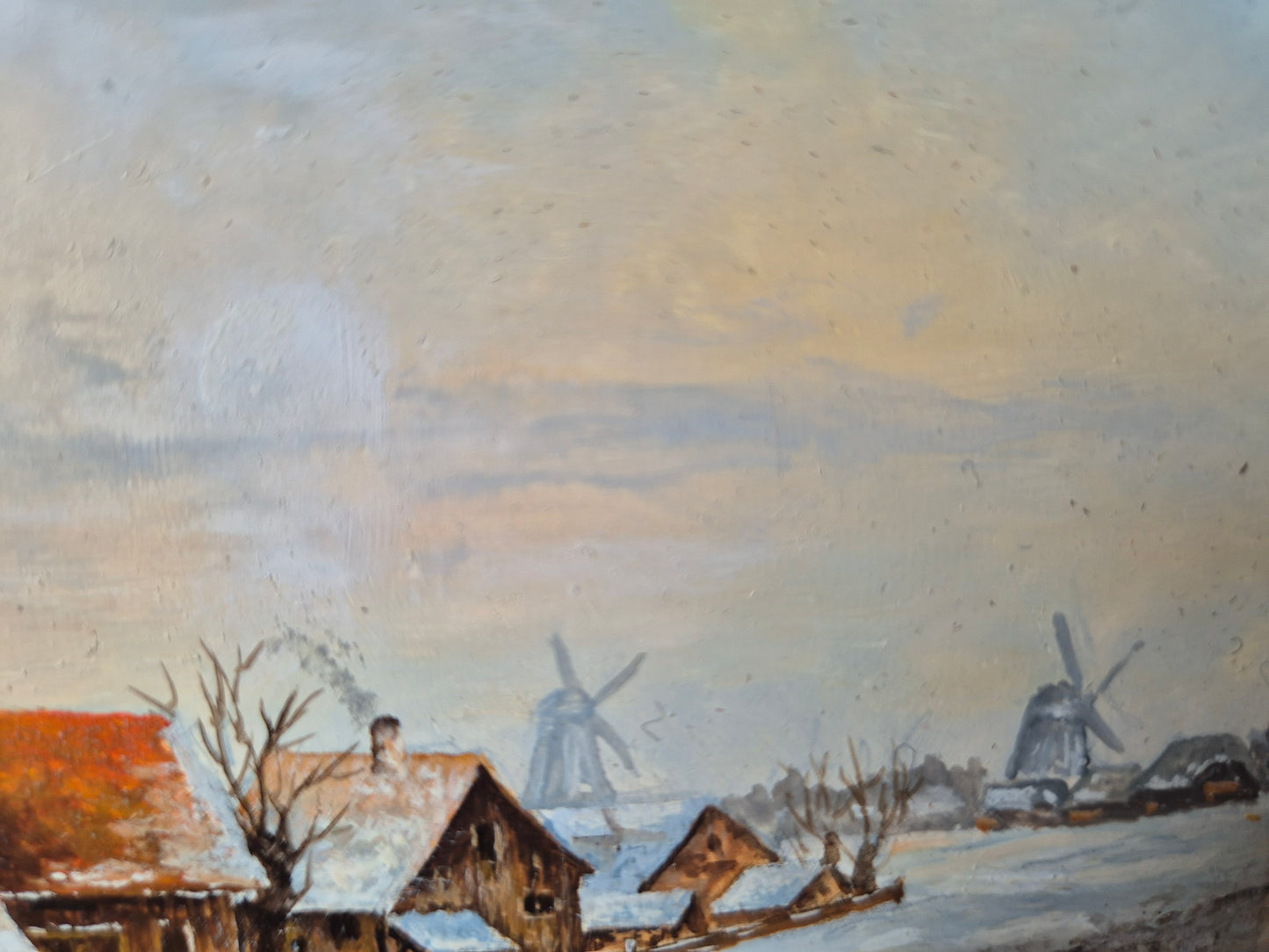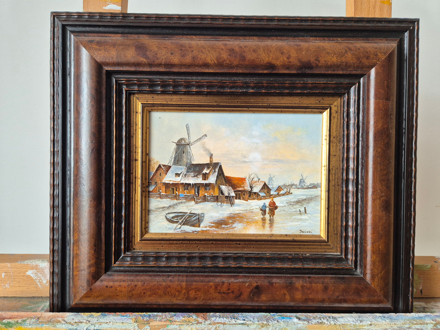 Dieses stimmungsvolle Ölgemälde von Jacobi (XX) zeigt einen Winterspaziergang durch ein verschneites Dorf, begleitet von der Silhouette mehrerer Windmühlen im Hintergrund. Die feine Pinselführung und die klare Komposition fangen die ruhige, winterliche Atmosphäre gekonnt ein. Besonders die Lichtverhältnisse und die dezente Farbpalette verleihen dem Werk eine wohltuende Tiefe. Das Bild ist handsigniert, auf Holz gemalt und in einem sehr guten Zustand erhalten. Der fein verzierte Rahmen ergänzt das Gemälde ideal und macht es zu einem ausdrucksstarken Stück klassischer Winterlandschaftsmalerei.