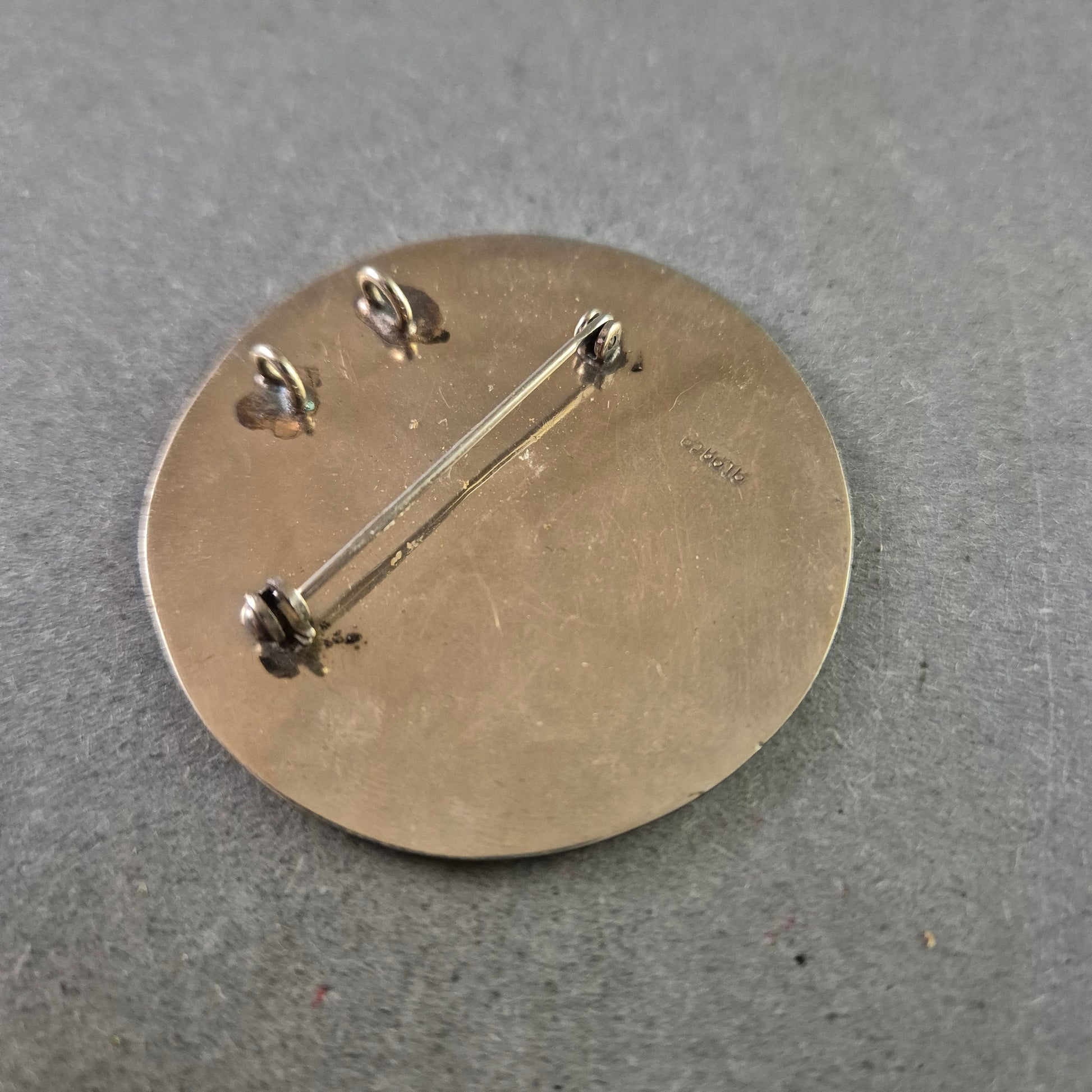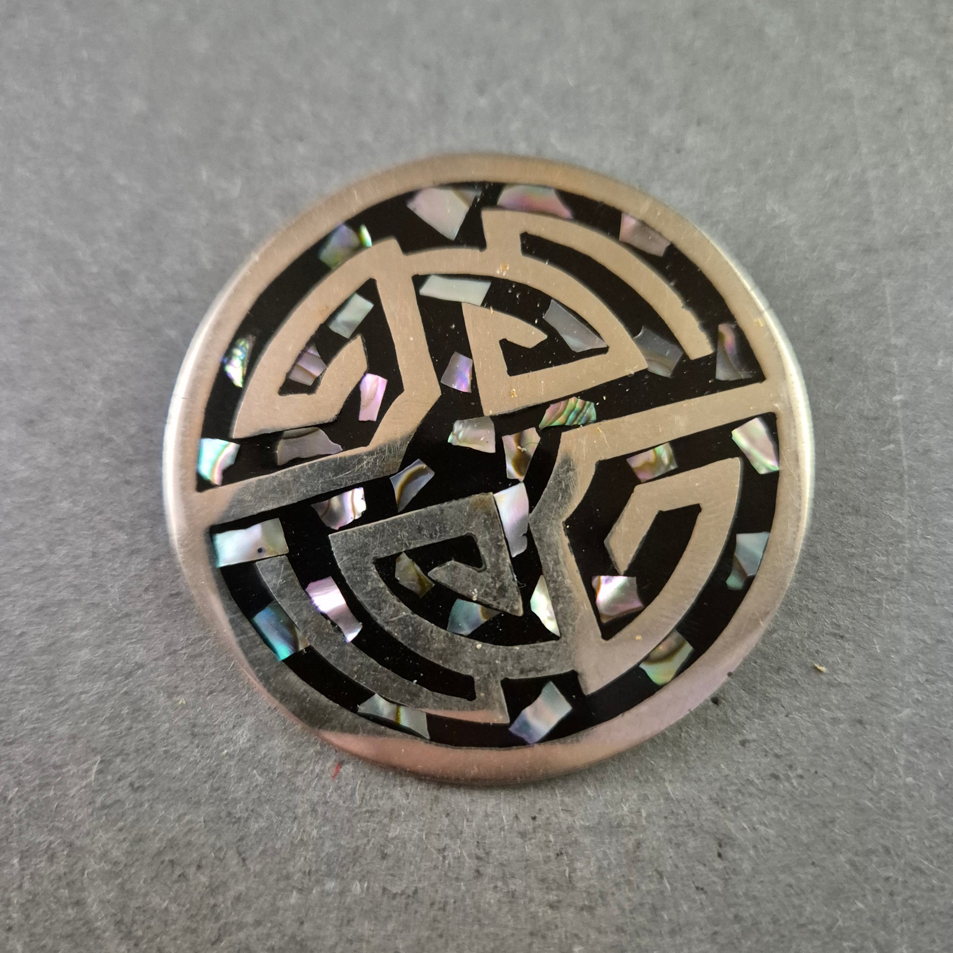 Runde Alpaka-Brosche mit Abalone-Inlay und traditionellem Muster