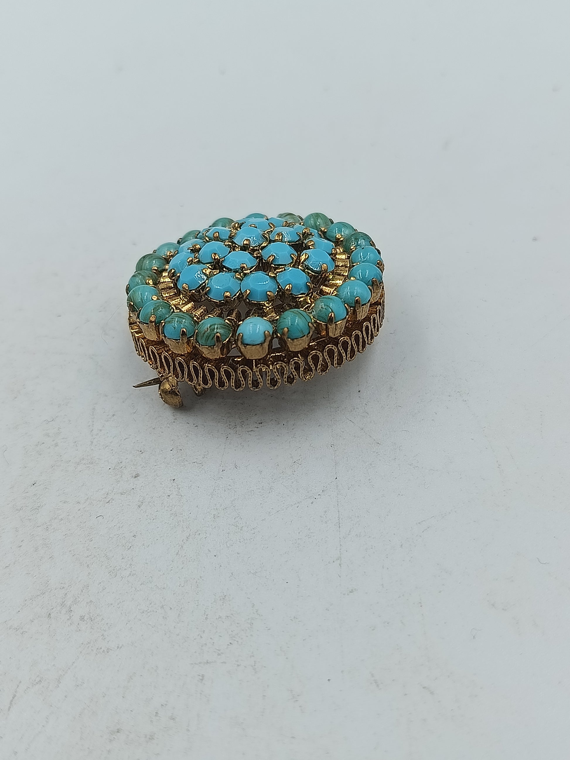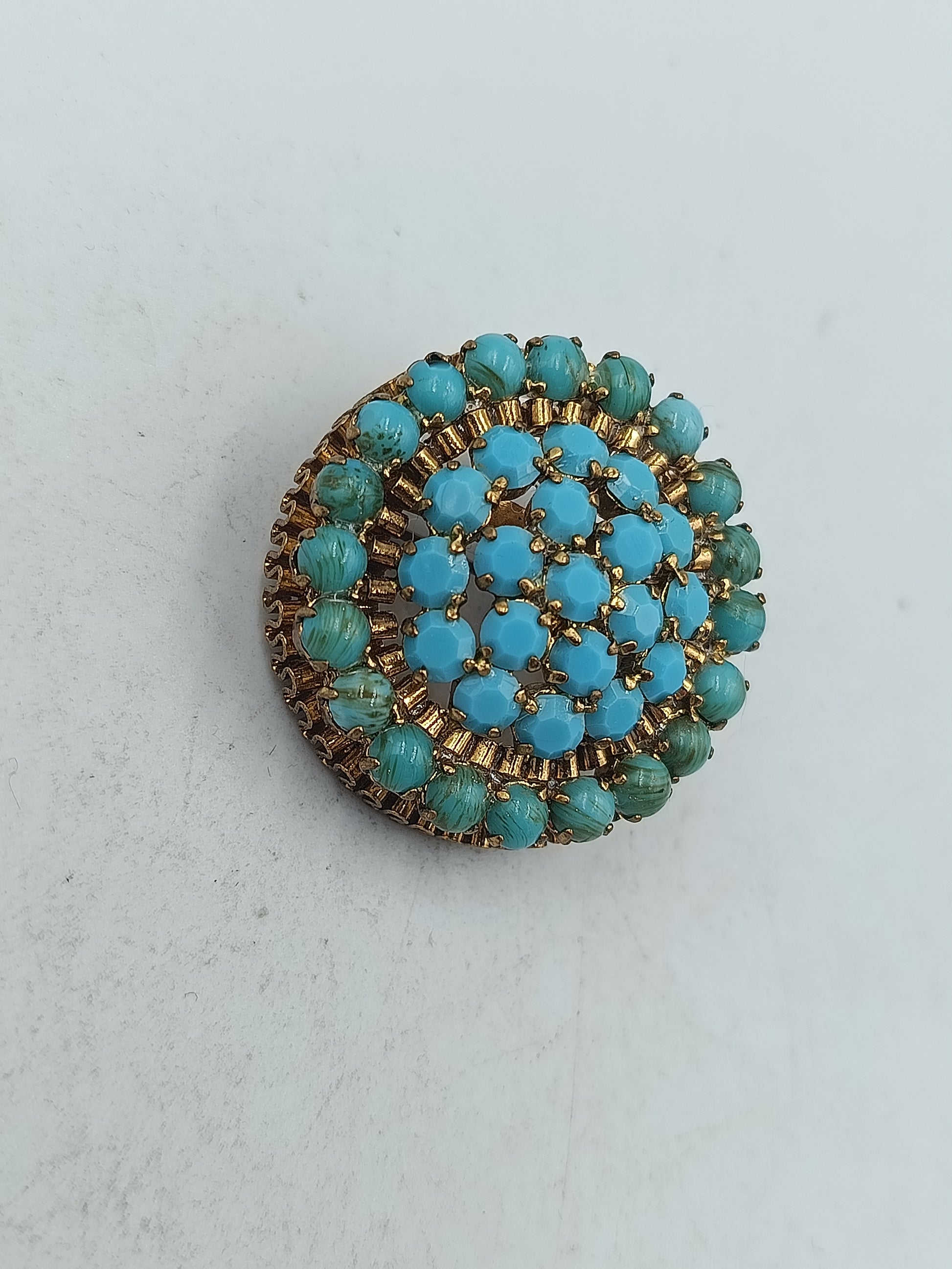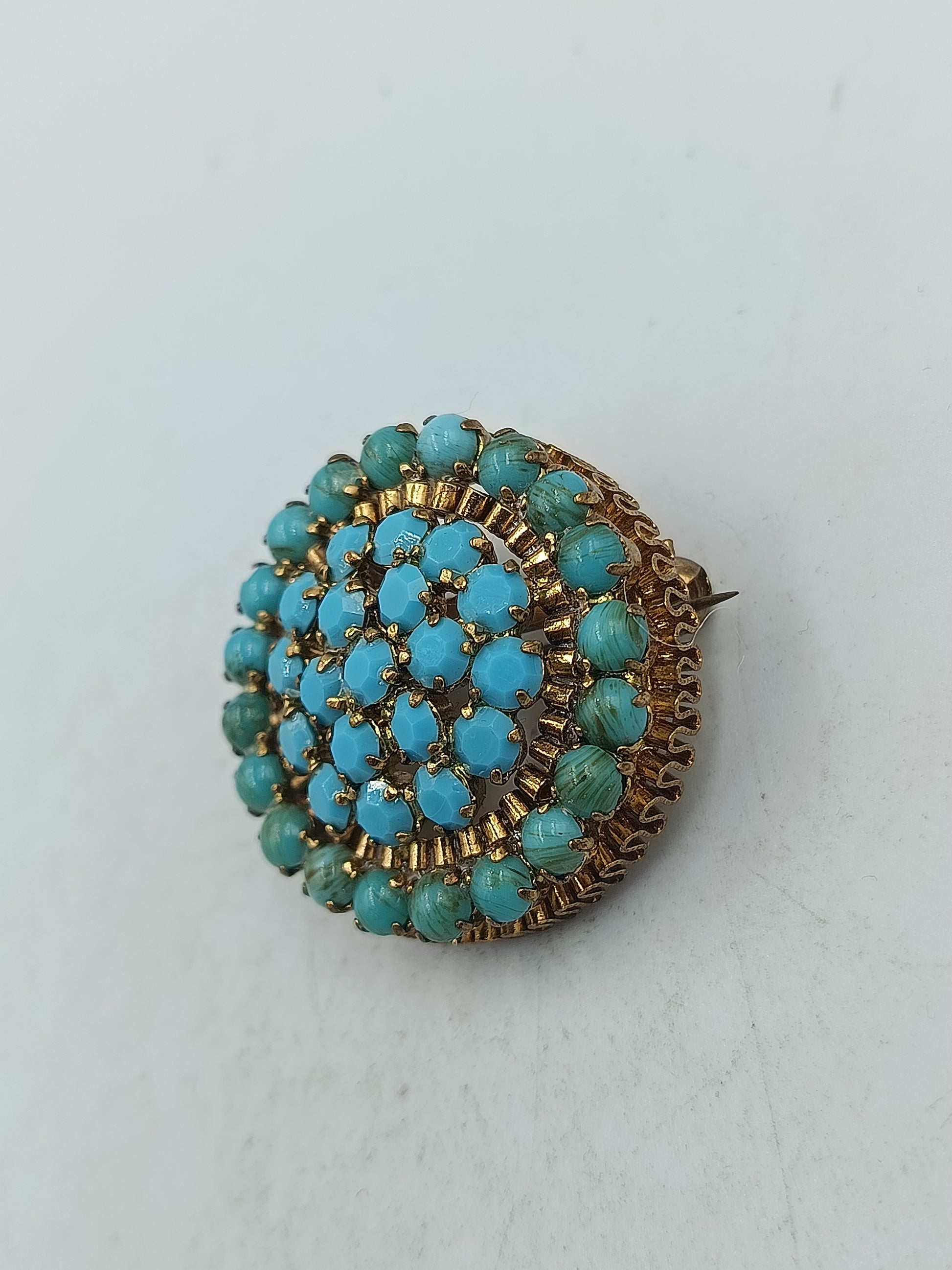 Runde Brosche in goldfarbener Optik mit türkisen Glassteinen im Vintage Stil
