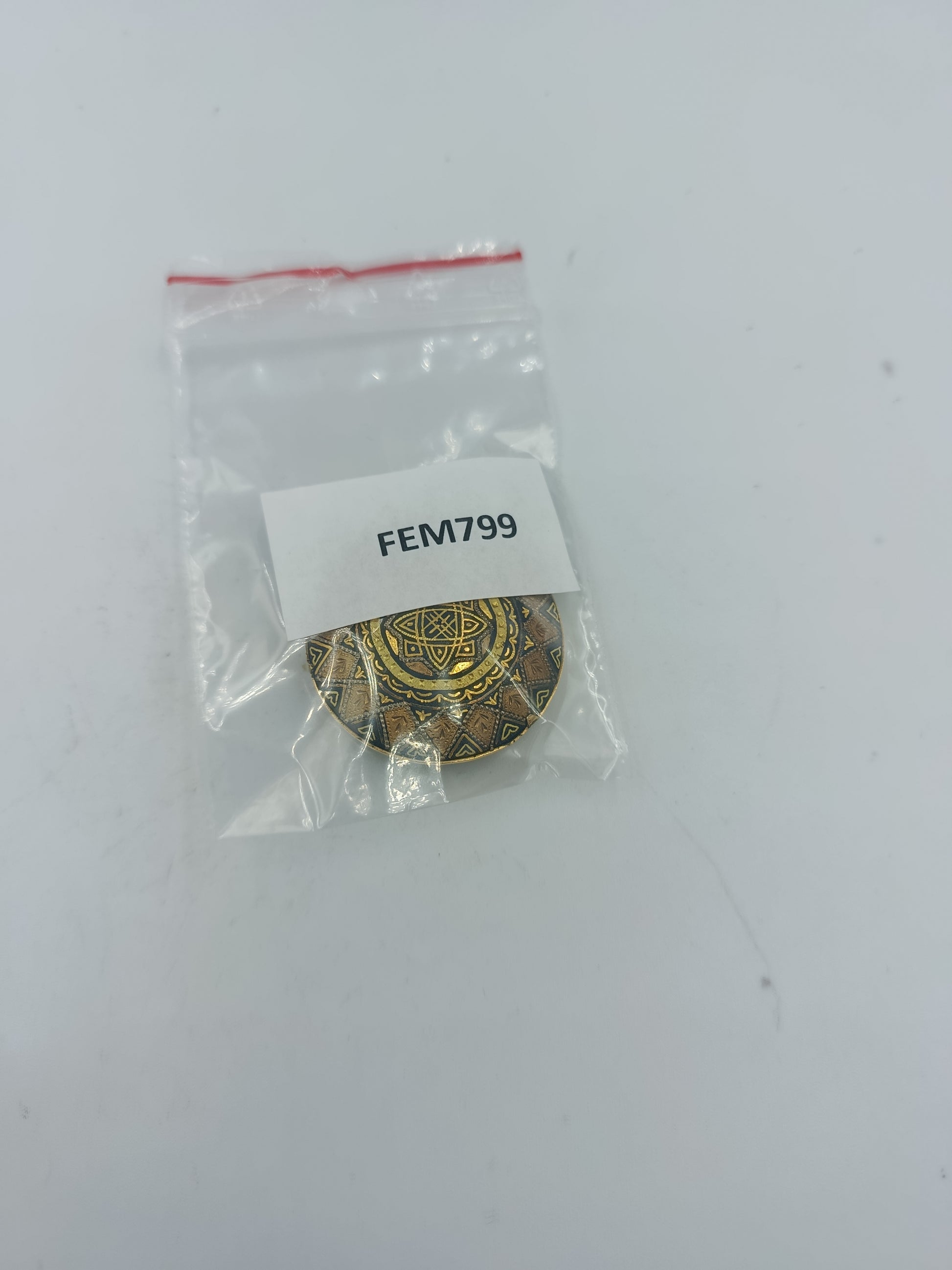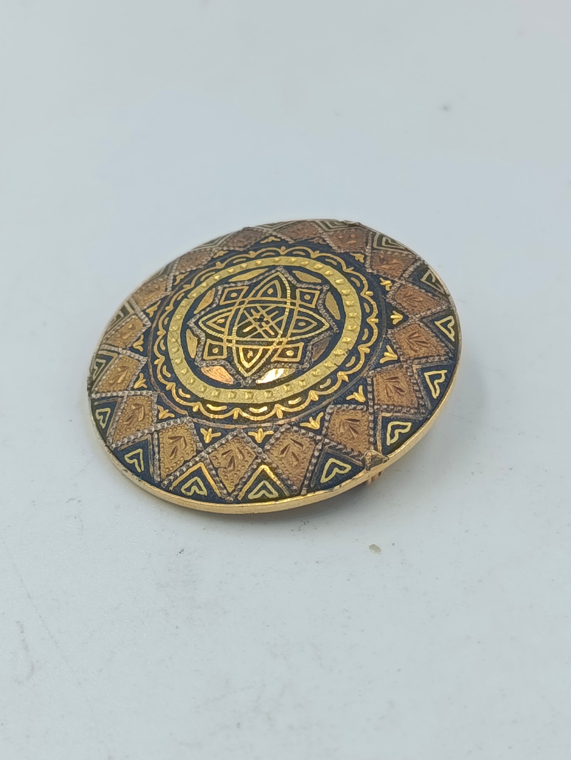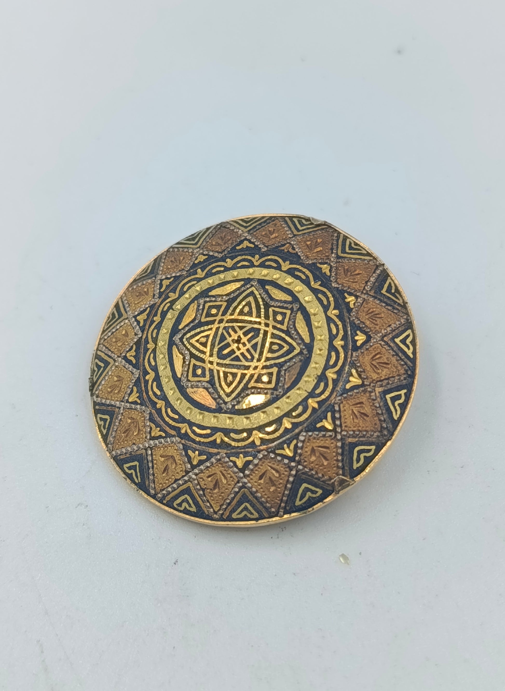 Wunderschöne runde Brosche im orientalischen Stil mit filigranem, geometrischem Muster in Gold und Schwarz. Das detailreiche Design erinnert an traditionelle Emaillearbeiten und verleiht jedem Outfit einen Hauch von Eleganz und Vintage-Charme.