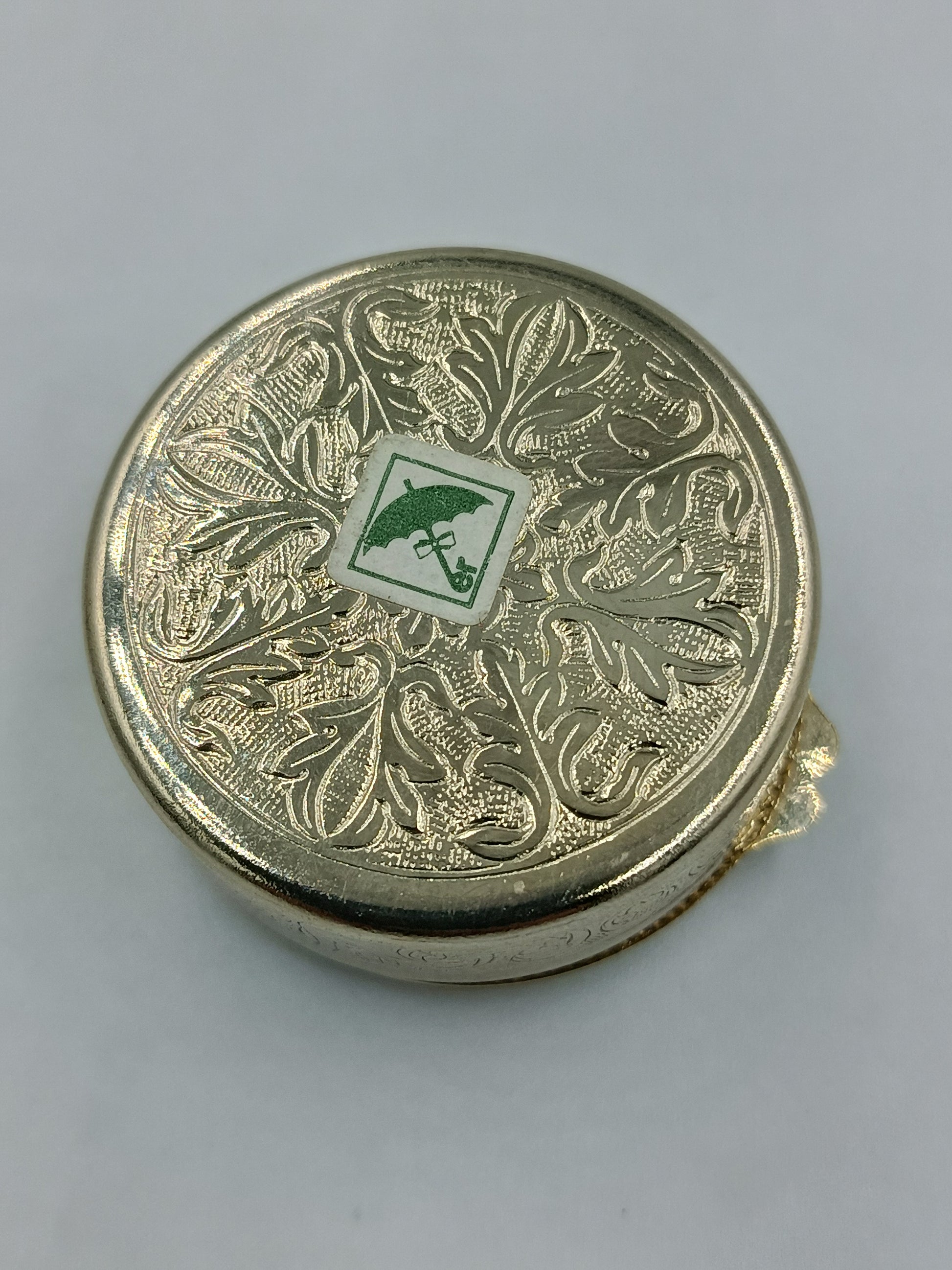 Elegante, runde Schmuckdose mit detailreicher Gravur und farbenfrohem Emaille-Deckel. Das Blumenmotiv ist kunstvoll gearbeitet und macht diese Dose zu einem dekorativen Sammlerstück. Ideal zur Aufbewahrung von kleinen Schmuckstücken oder als hübsches Deko-Element.