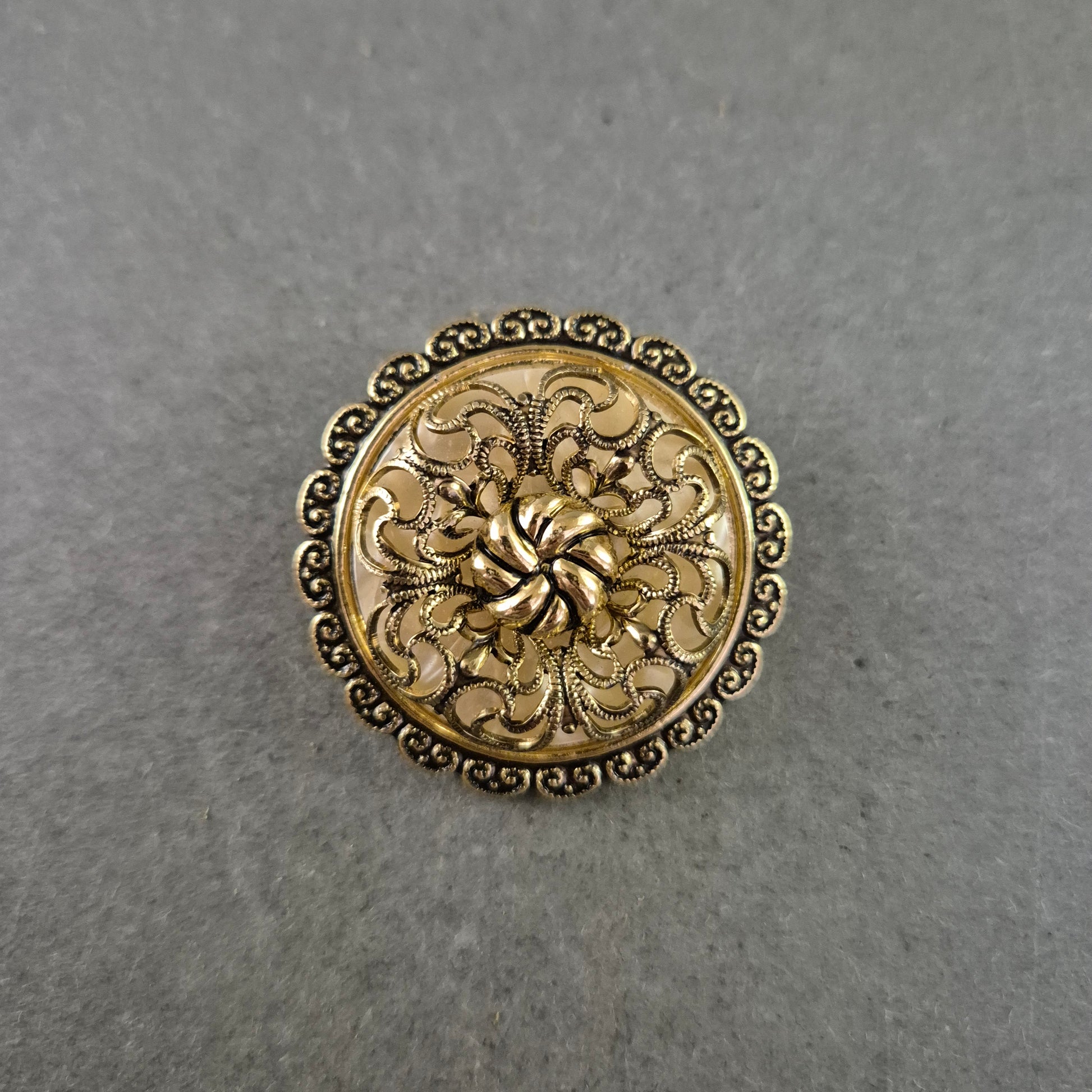 Diese zauberhafte runde Brosche besticht durch ihr detailreiches, goldfarbenes Filigrandesign, das an kunstvolle Handwerkskunst erinnert. Die Mitte ziert eine erhabene, gedrehte Rosette, umgeben von feinen Rankenmustern, die auf einem hellen Untergrund liegen. Der äußere Rand ist ebenfalls filigran gearbeitet und verleiht dem Schmuckstück eine besondere Tiefe und Eleganz. Ein ideales Accessoire, um jedem Outfit einen Hauch von Vintage-Charme und Raffinesse zu verleihen. Die Rückseite ist mit einer stabilen Anstecknadel versehen.