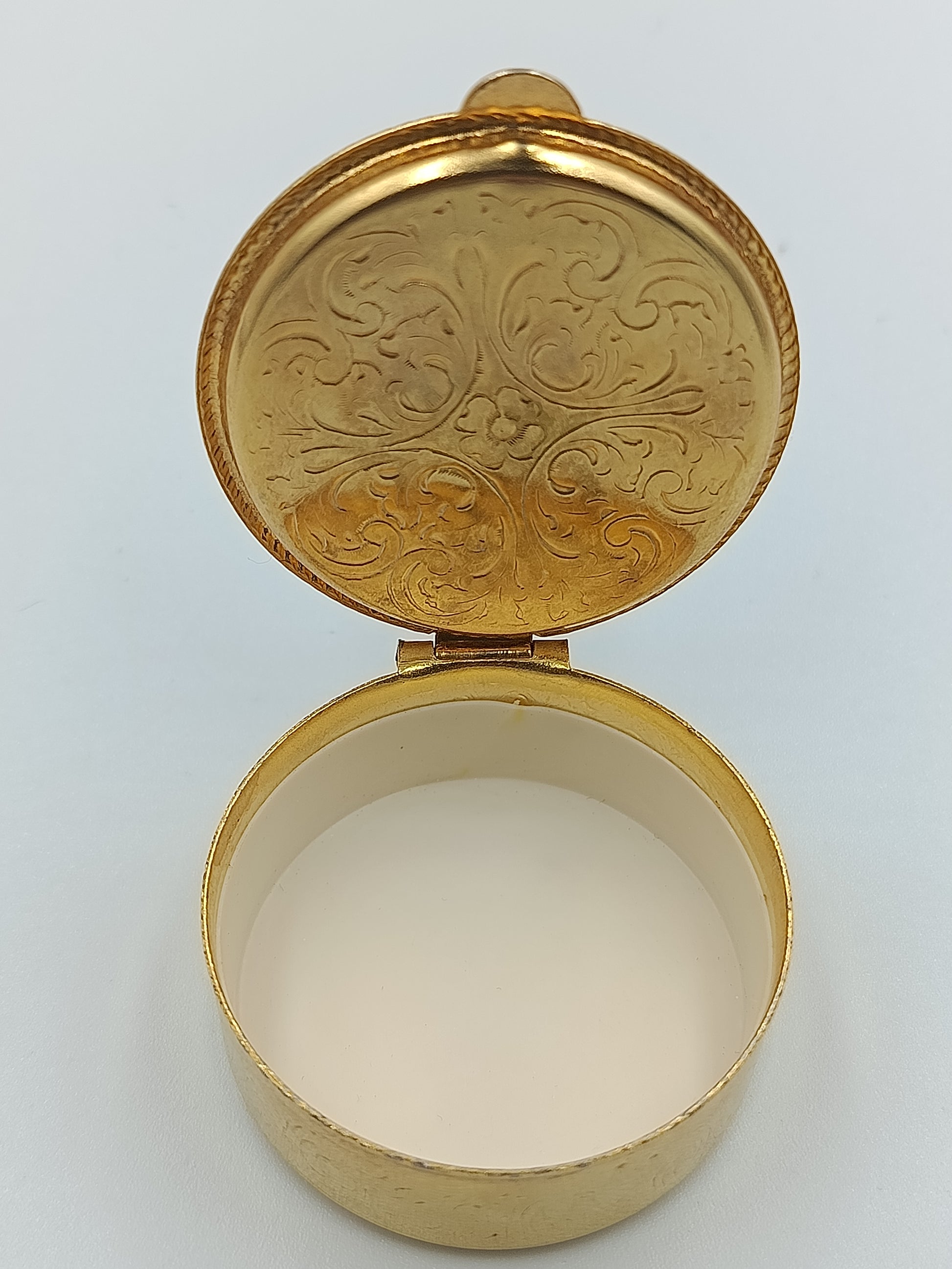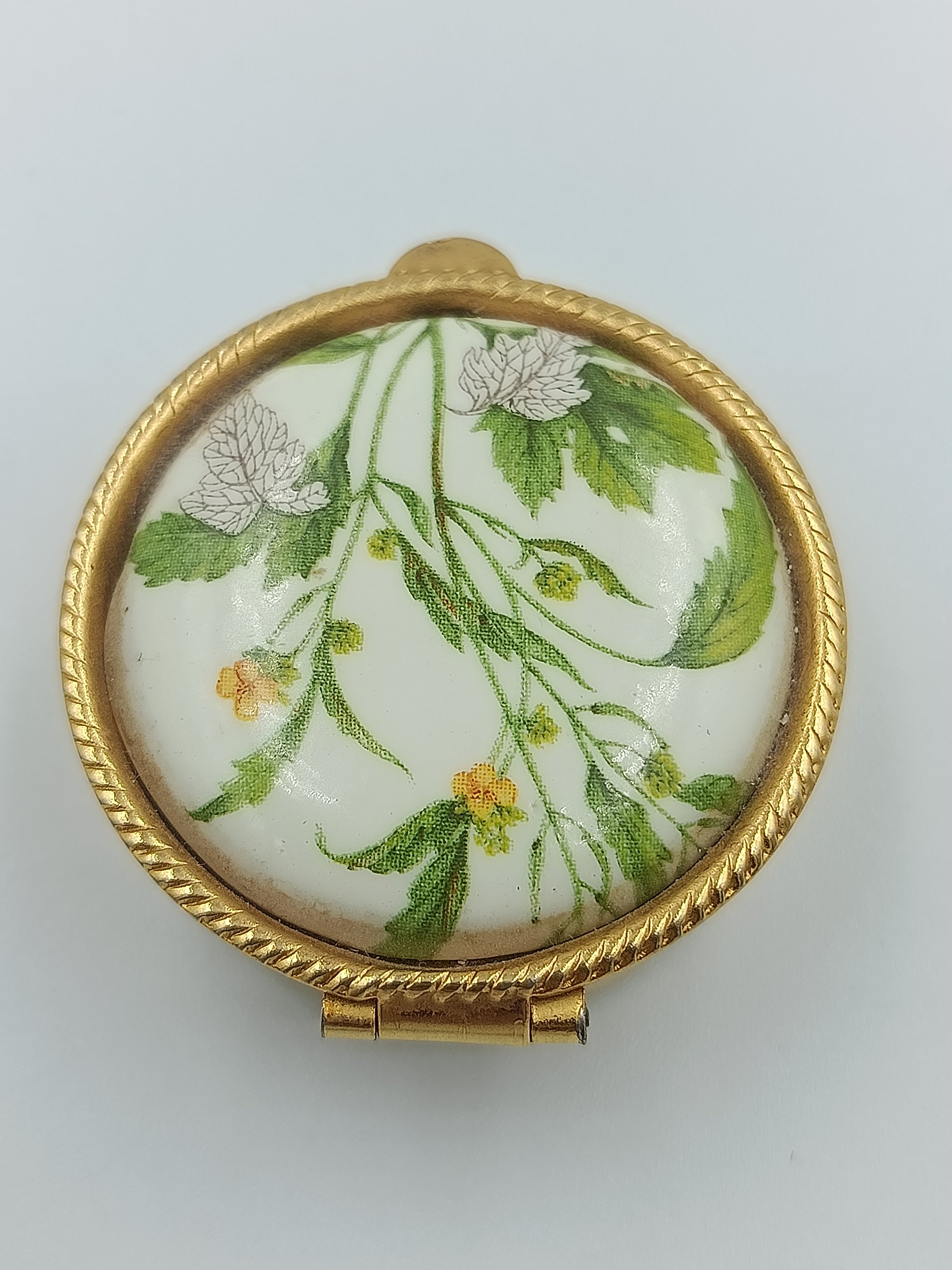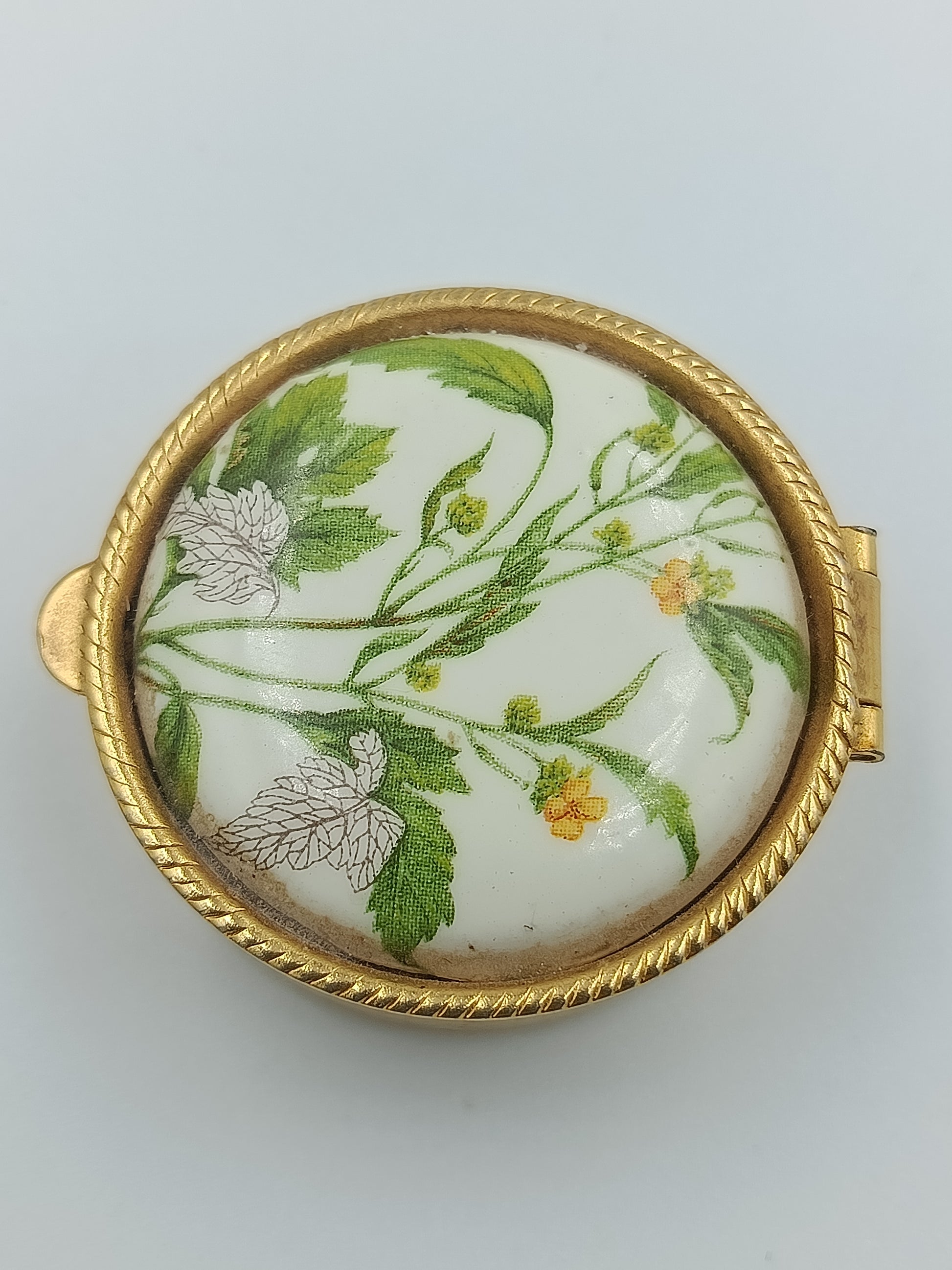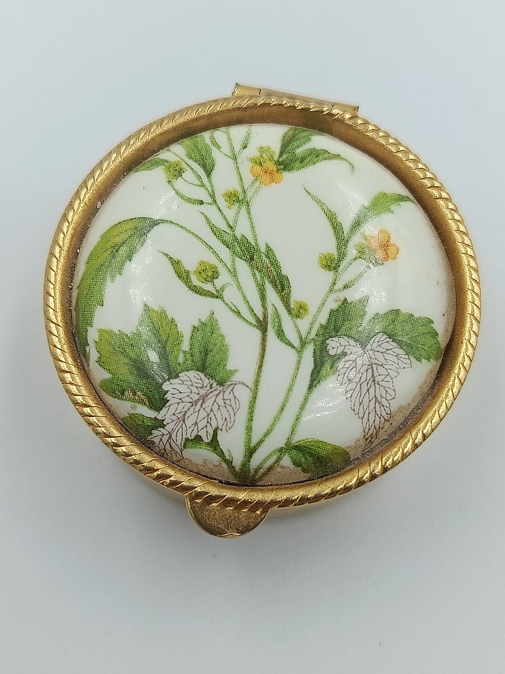 Elegante, runde Porzellandose mit einem feinen, botanischen Motiv in zarten Grün- und Gelbtönen. Der goldfarbene Metallrahmen mit dekorativer Prägung verleiht der Dose einen edlen Charakter. Perfekt geeignet als kleine Schmuckdose oder dekoratives Sammlerstück.
