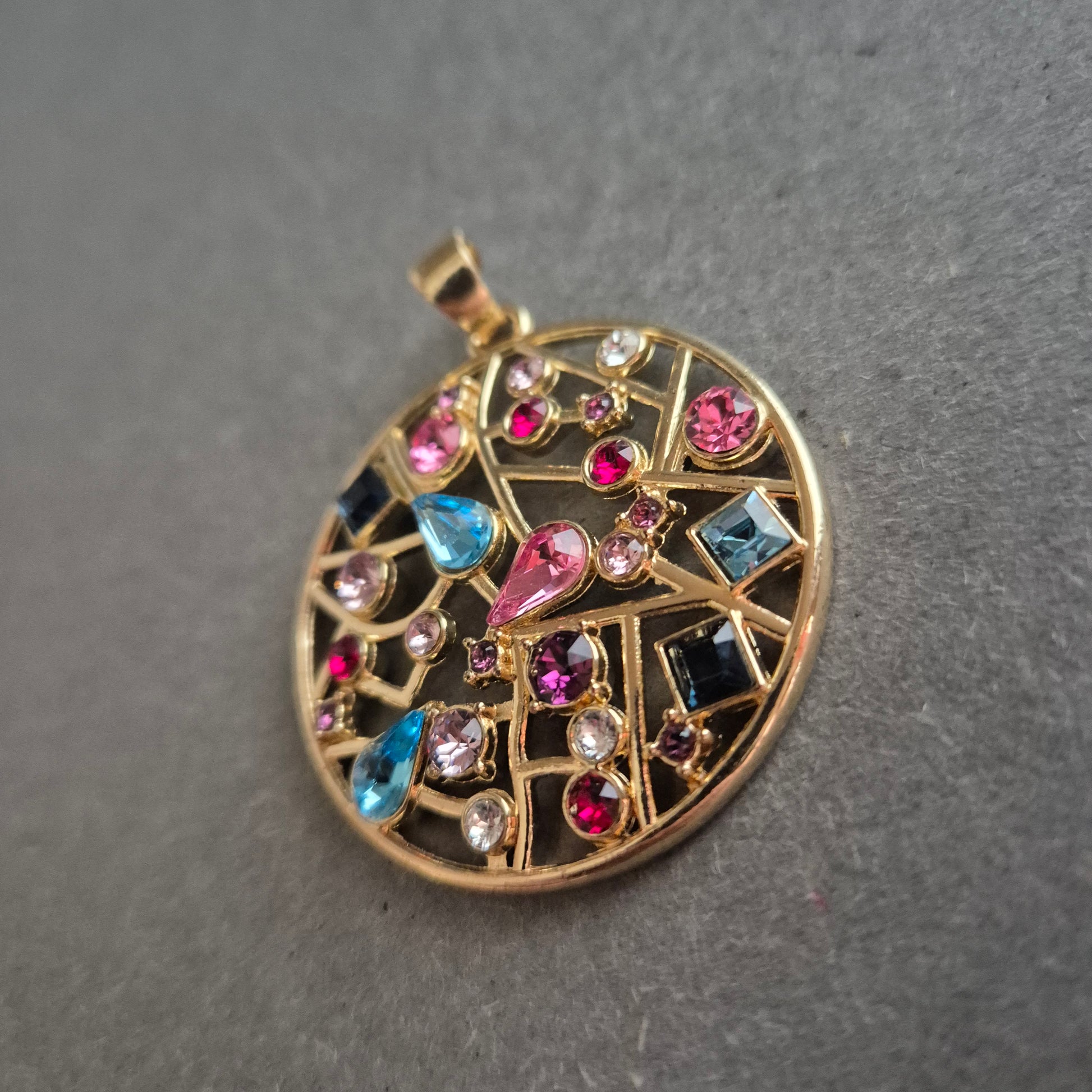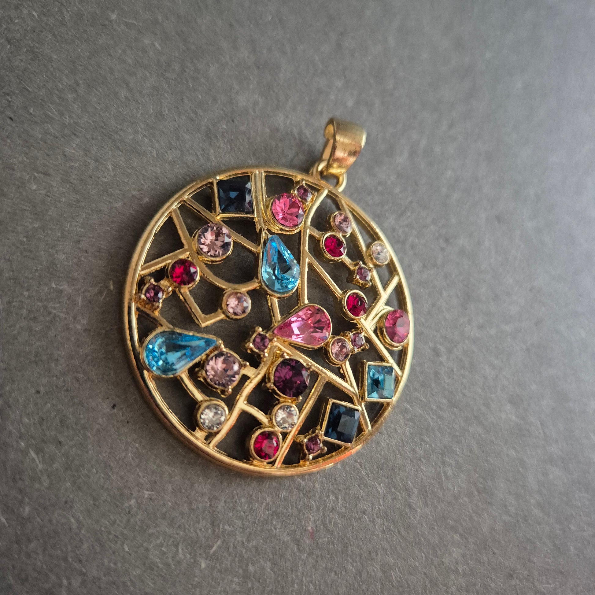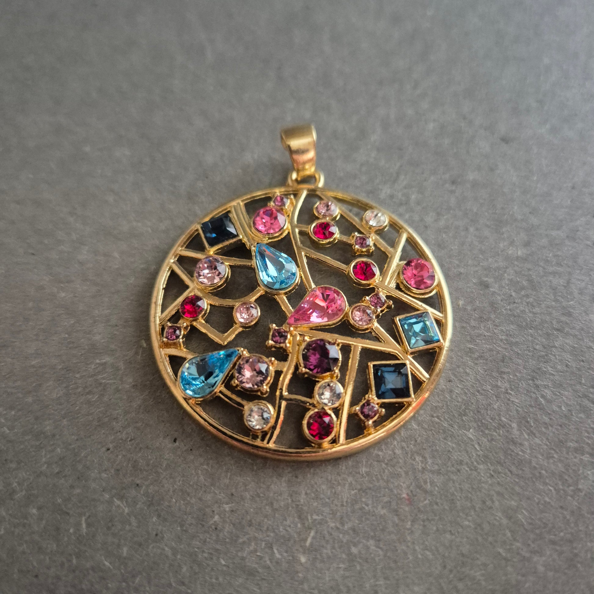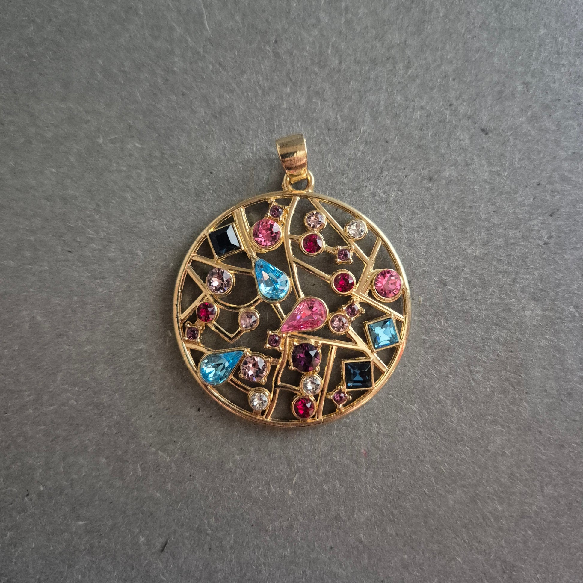 Dieser runde, auffällige Anhänger begeistert mit einem kunstvollen Mosaik aus bunten Schmucksteinen in verschiedenen Farben und Formen. Die offene Gitterstruktur aus vergoldetem Metall schafft einen spannenden Kontrast zu den leuchtenden Steinen in Pink, Blau, Violett und Weiß. Ein echter Eyecatcher für alle, die Schmuck mit Persönlichkeit lieben.