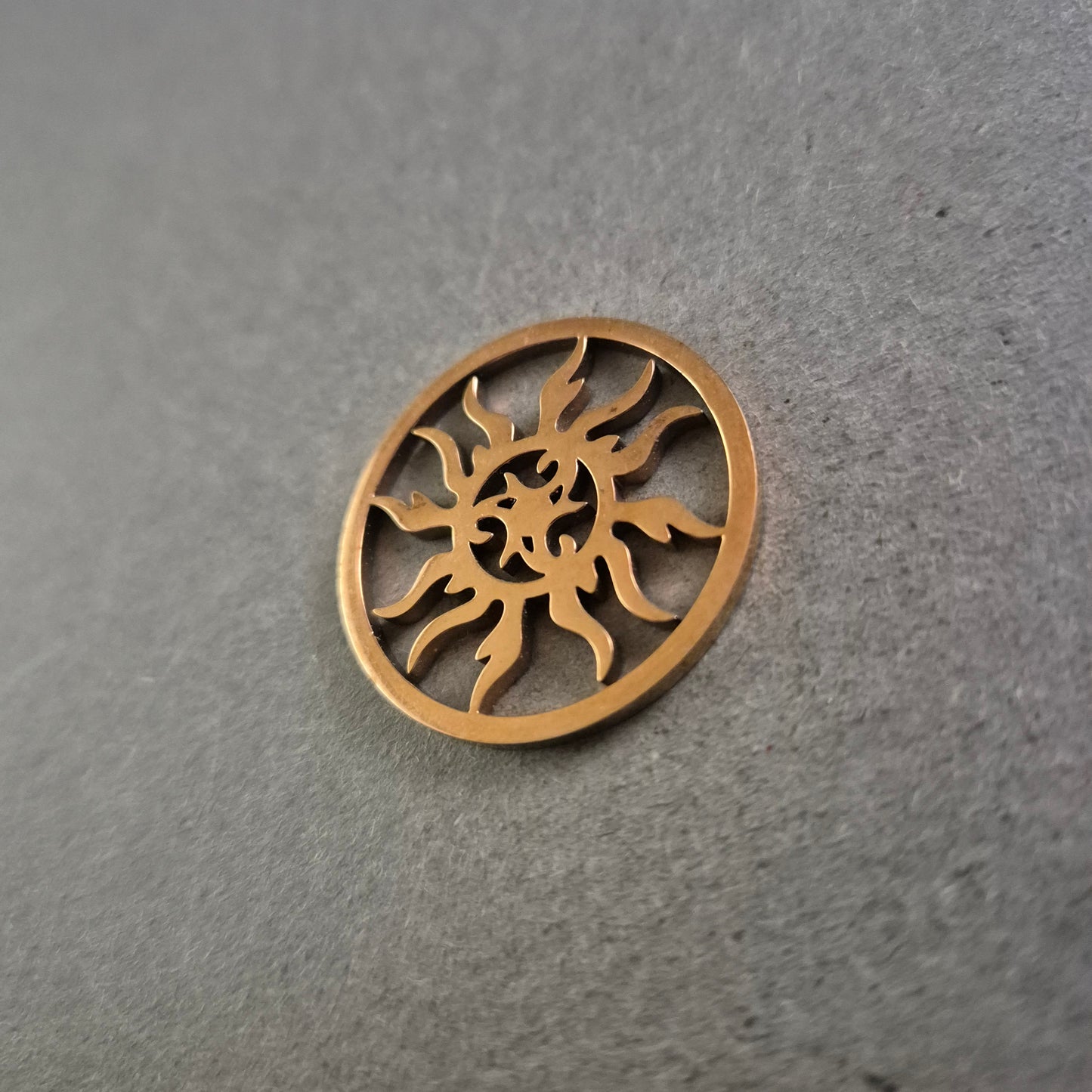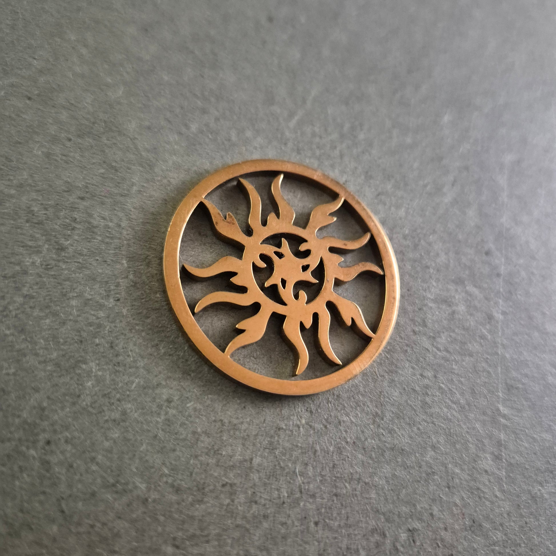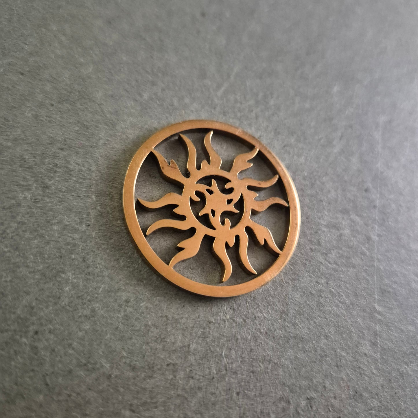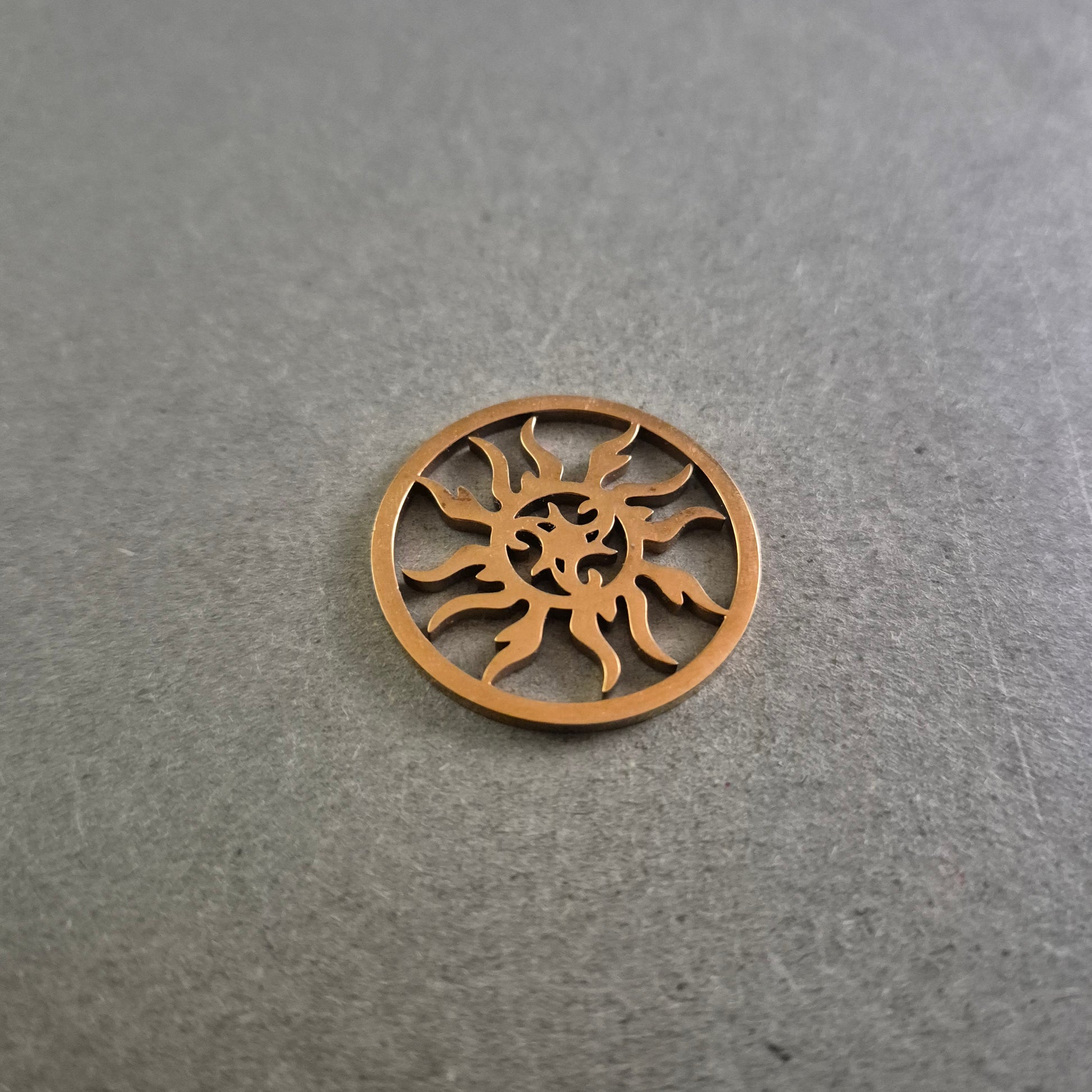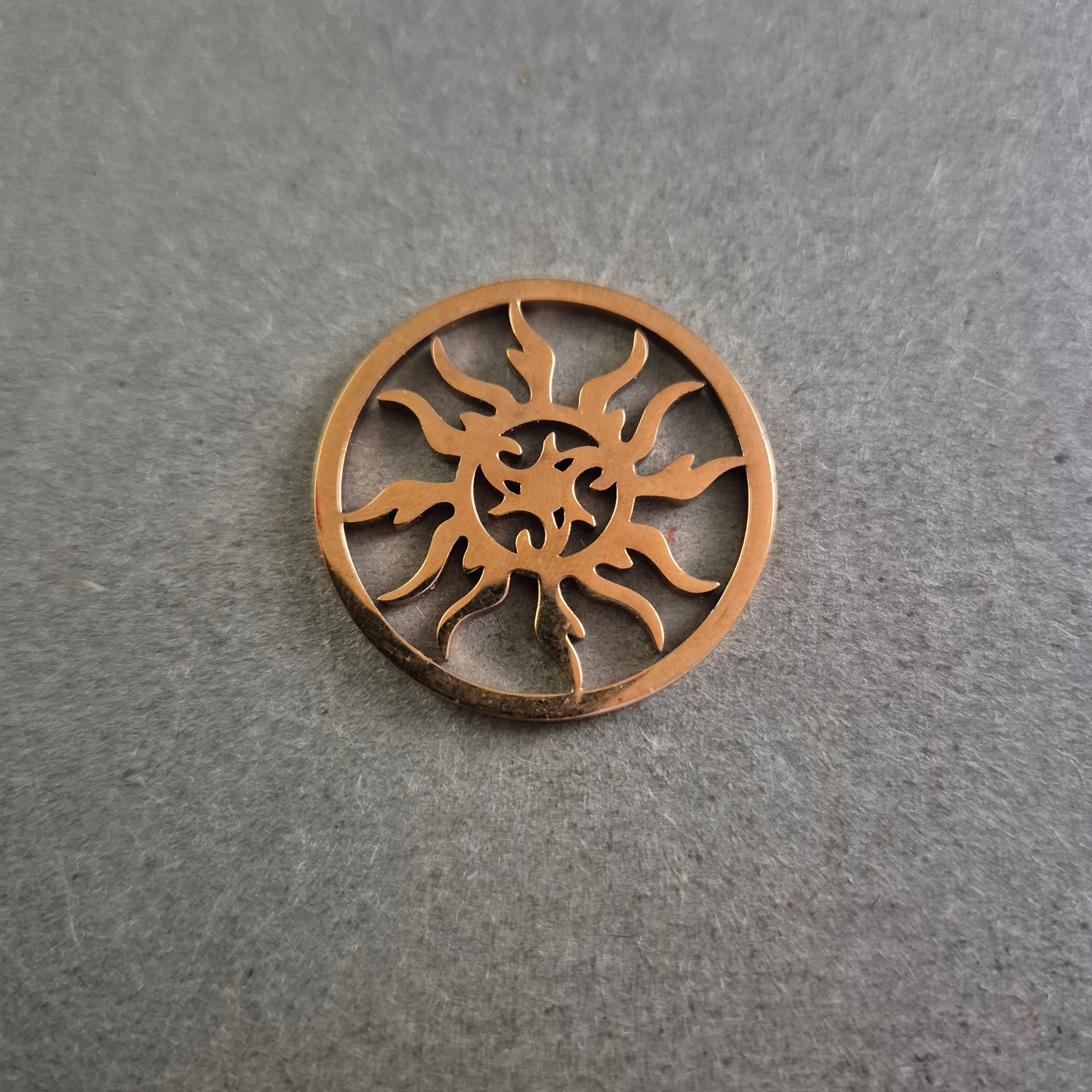 Dieser filigrane runde Anhänger zeigt ein kunstvoll ausgestanztes Sonnenmotiv im Tribal-Stil und ist ein echter Hingucker für Liebhaber individueller Accessoires. Die bronzefarbene Oberfläche verleiht dem Anhänger einen warmen, erdigen Ton und unterstreicht das spirituelle und kraftvolle Design. Ideal als Anhänger für Ketten, Lederbänder oder kreative DIY-Projekte.