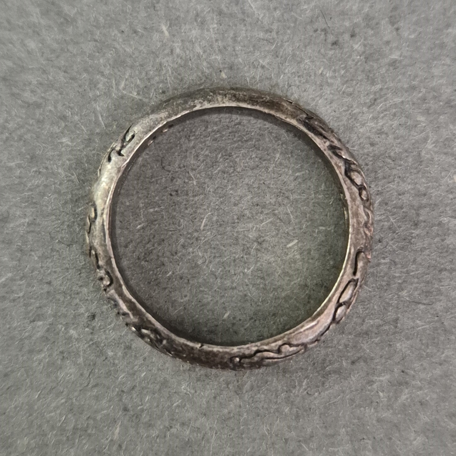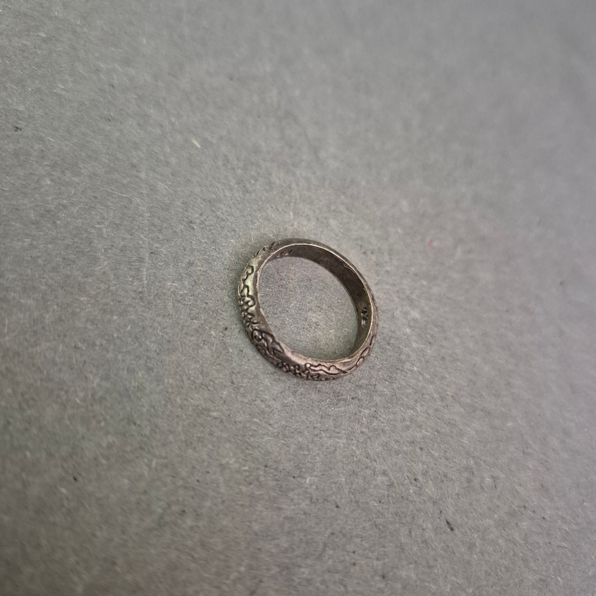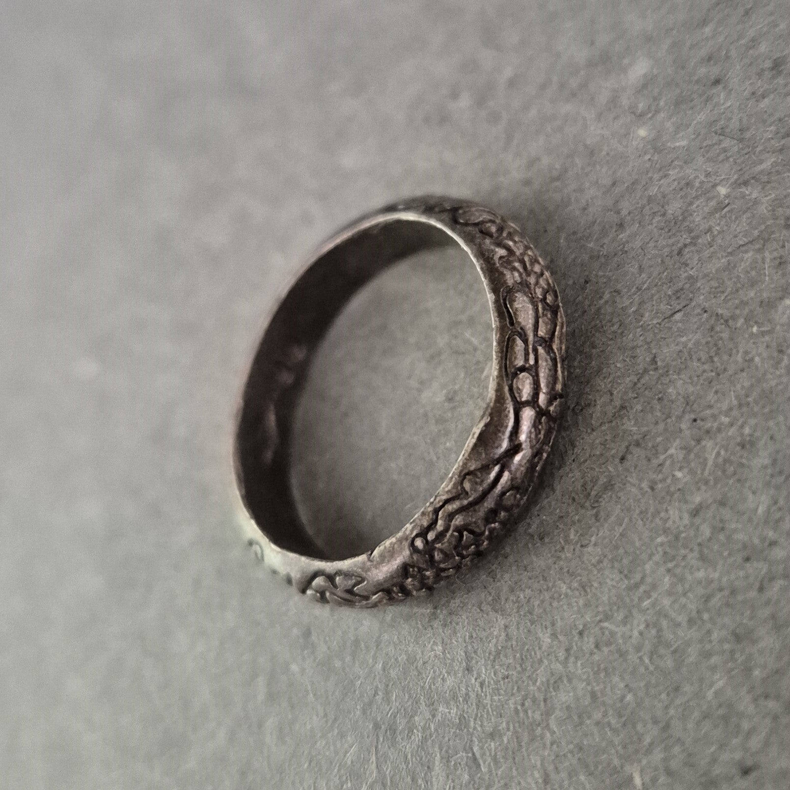 Dieser schlichte, aber charakterstarke Vintage-Ring überzeugt mit seiner rustikalen, strukturierten Oberfläche, die an organische Muster erinnert. Das dunkle Patina-Finish verleiht dem Ring einen antiken Look – ideal für Liebhaber individueller Schmuckstücke mit Geschichte.