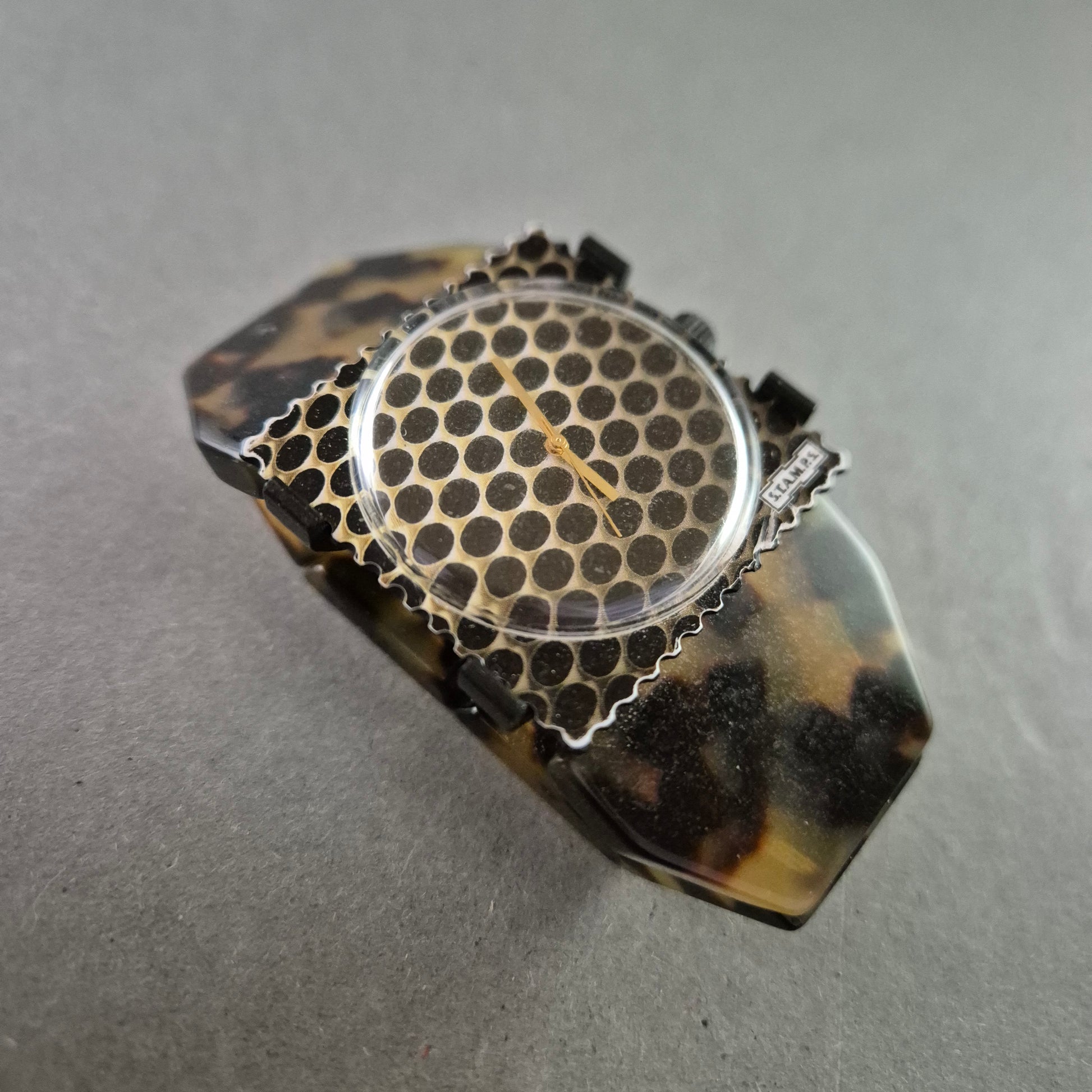 Diese S.T.A.M.P.S Damenarmbanduhr ist ein echter Blickfang im wilden Animal-Look. Das Zifferblatt ist mit einem auffälligen Punktmuster im Retro-Stil bedruckt, das Gehäuse und das breite Armband zeigen ein Schildpatt-Design. Der kultige Briefmarken-Look ist typisch für die Marke S.T.A.M.P.S und macht diese Uhr zum perfekten Accessoire für Trendsetterinnen.