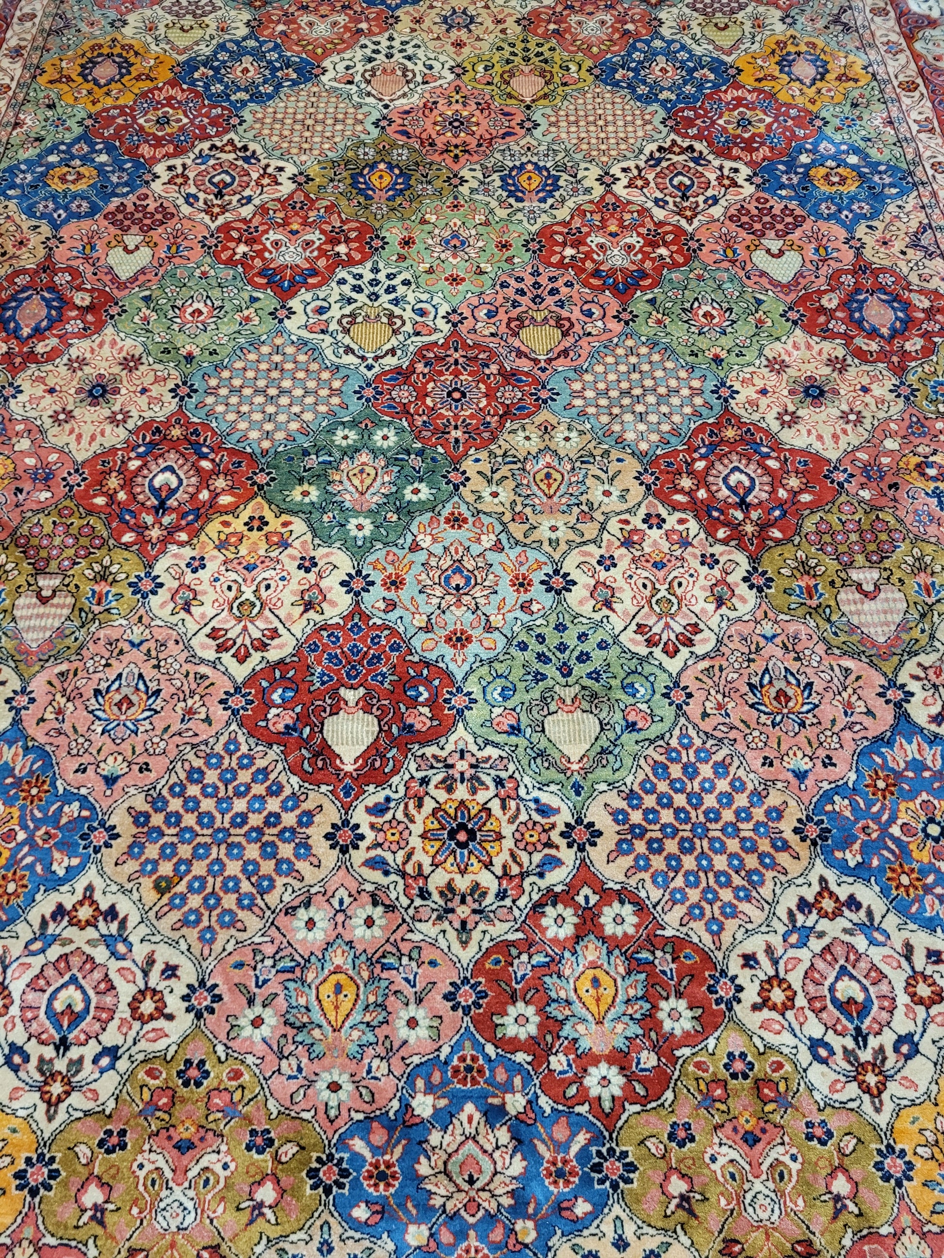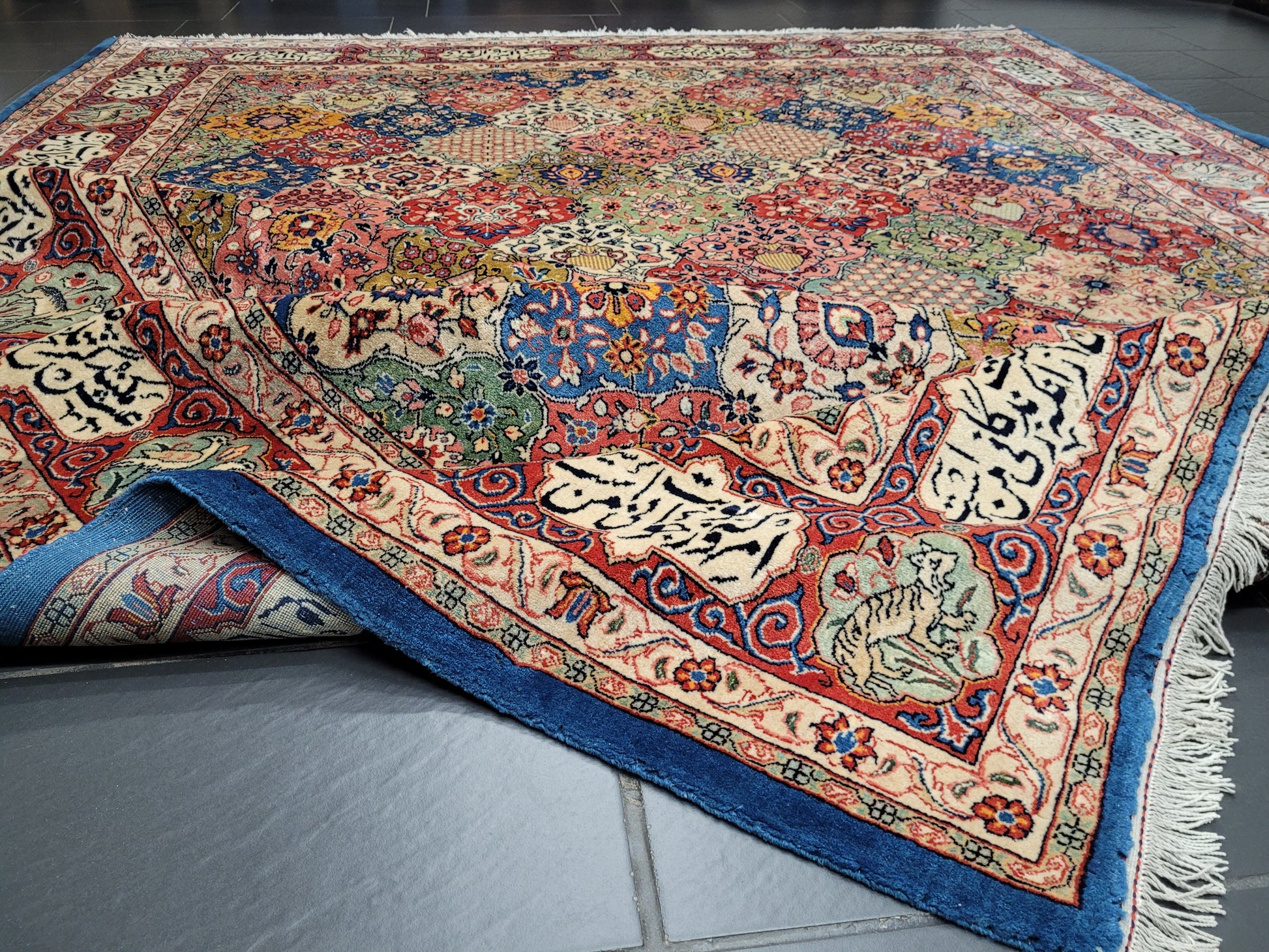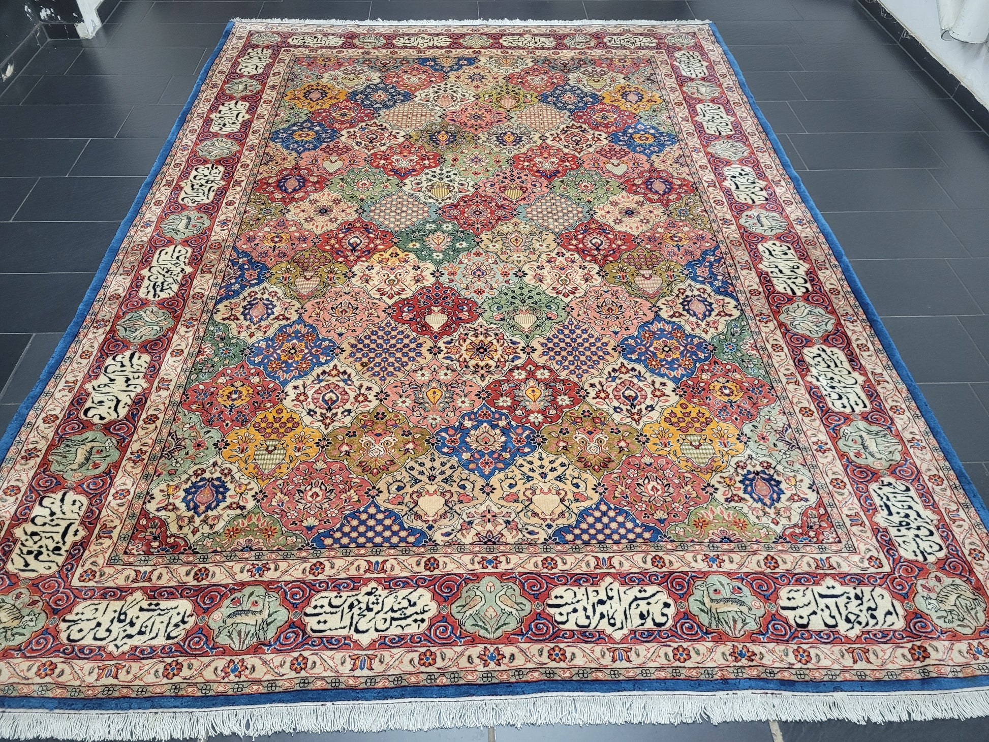 angeboten wird ein prachtvoller Sarough Teppich aus feiner Korkwolle, handgeknüpft und mit Signatur im Bordürenfeld. Das dekorative Gartenmuster besteht aus unzähligen floralen Feldern in leuchtenden Farben – jedes Einzelmotiv kunstvoll gestaltet und harmonisch aufeinander abgestimmt. Ein beeindruckendes Sammlerstück traditioneller Knüpfkunst mit seltener Detailvielfalt und künstlerischem Ausdruck.